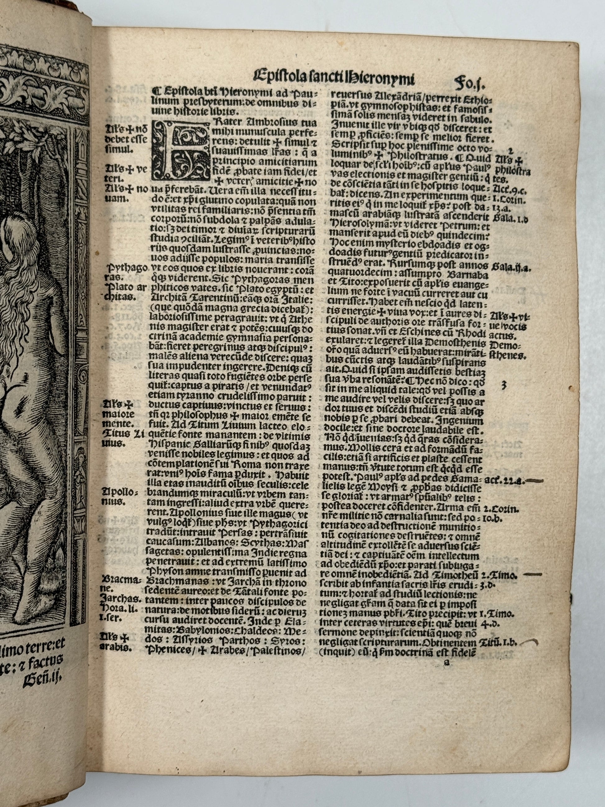 A beautiful post-incunable Bible with fine full page plates in a noble contemporary French binding with the gilt stamped original ownership of "Richard" and "F. Renatus" with a corresponding contemporary inscription in a humanist hand to the rear endpaper, presumably in the hand of the owner. Of note is the printer who was a very early female printer, indeed, she was the first woman to print the Bible. She most often used her husband's name in her printer's devices (Thielman Kerver) who died in 1522.