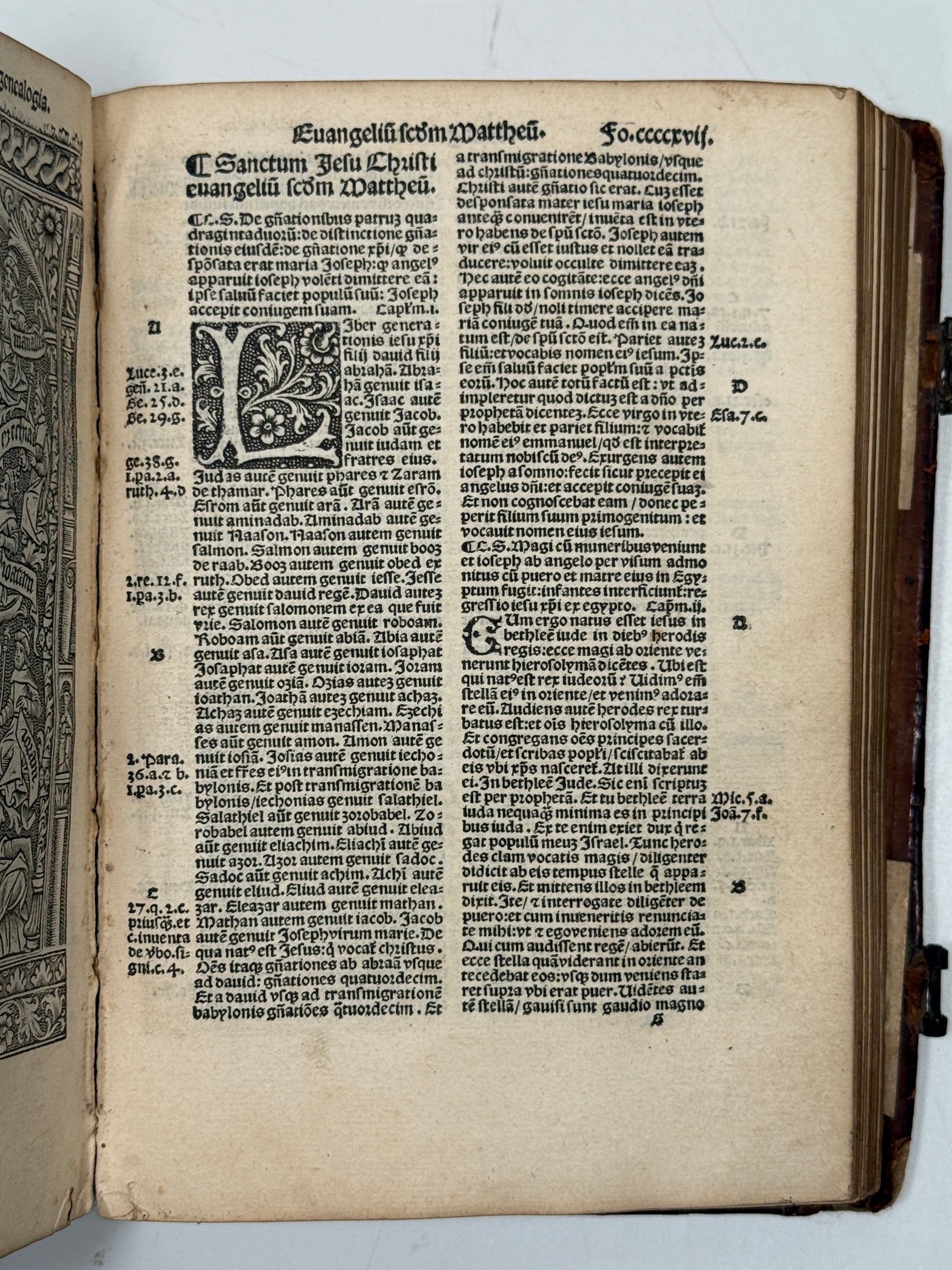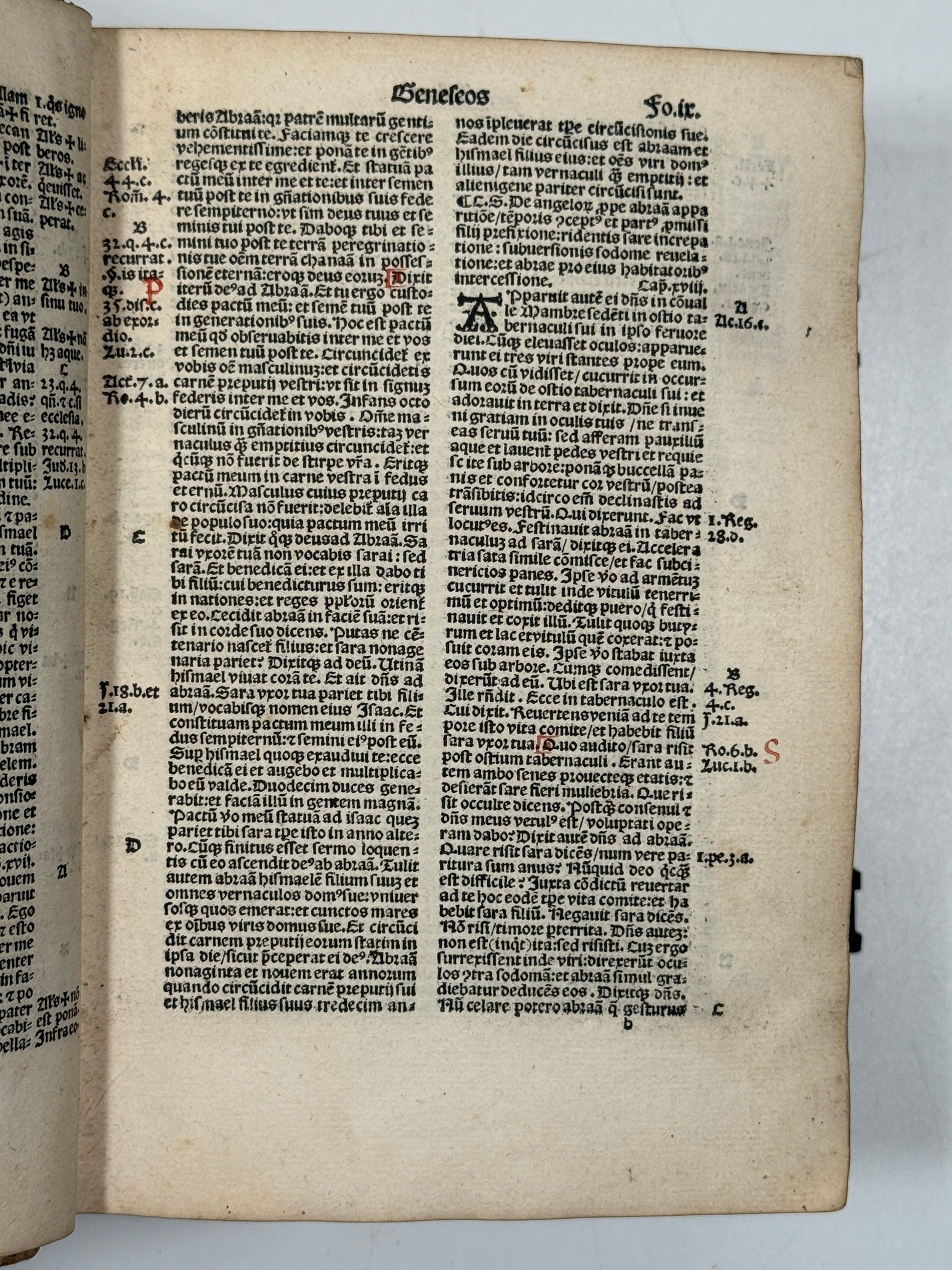 EXTREMELY RARE. We can trace no other copies of this edition in commerce and only 5 copies held institutionally worldwide, with none known in the UK, US, or any country except for France and Italy, making this one of the rarest of printed Bibles in the incunable and post-incunable periods in absolute terms. This copy, being totally complete with all plates, leaves, blanks, etc, in a noble contemporary binding, easily ranks as one of the most excellent Kerver Bibles to appear on the market in recent memory.