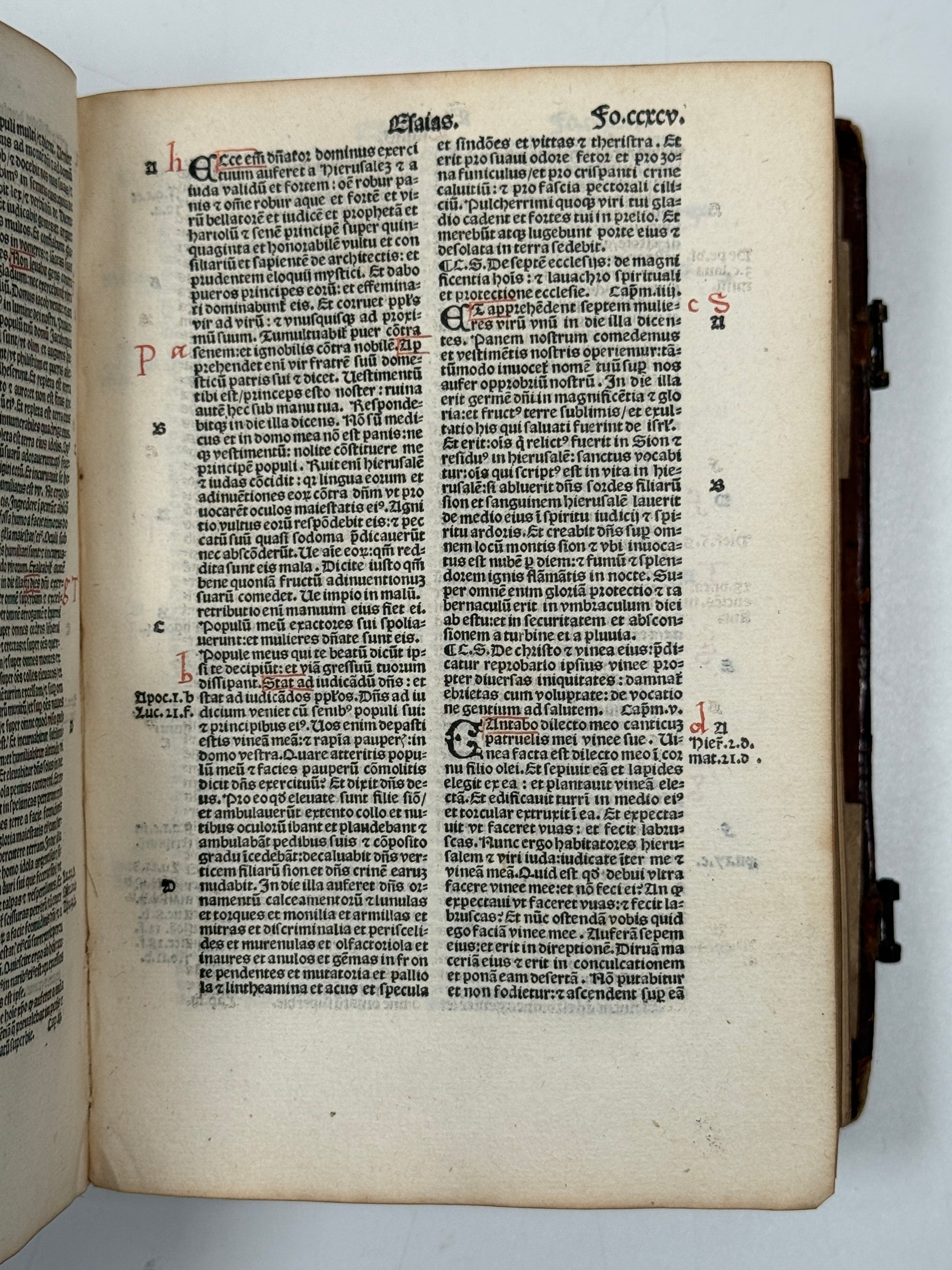 Contemporary fine binding with central gilt design to both boards with "Richard" on the rear board and "F. Renatus" to the rear. Binding worn with some losses to the leather, but with both boards securely attached and the binding secure. Attractive. Clasp metalwork fully extant, though the lower clasp is coming a bit loose. Old (contemporary) inscriptions to front pastedown partially covered, with a further inscription to the rear endpaper possibly in the hand of the commissioner of the binding. An excellent copy of this extremely rare early printed Bible.