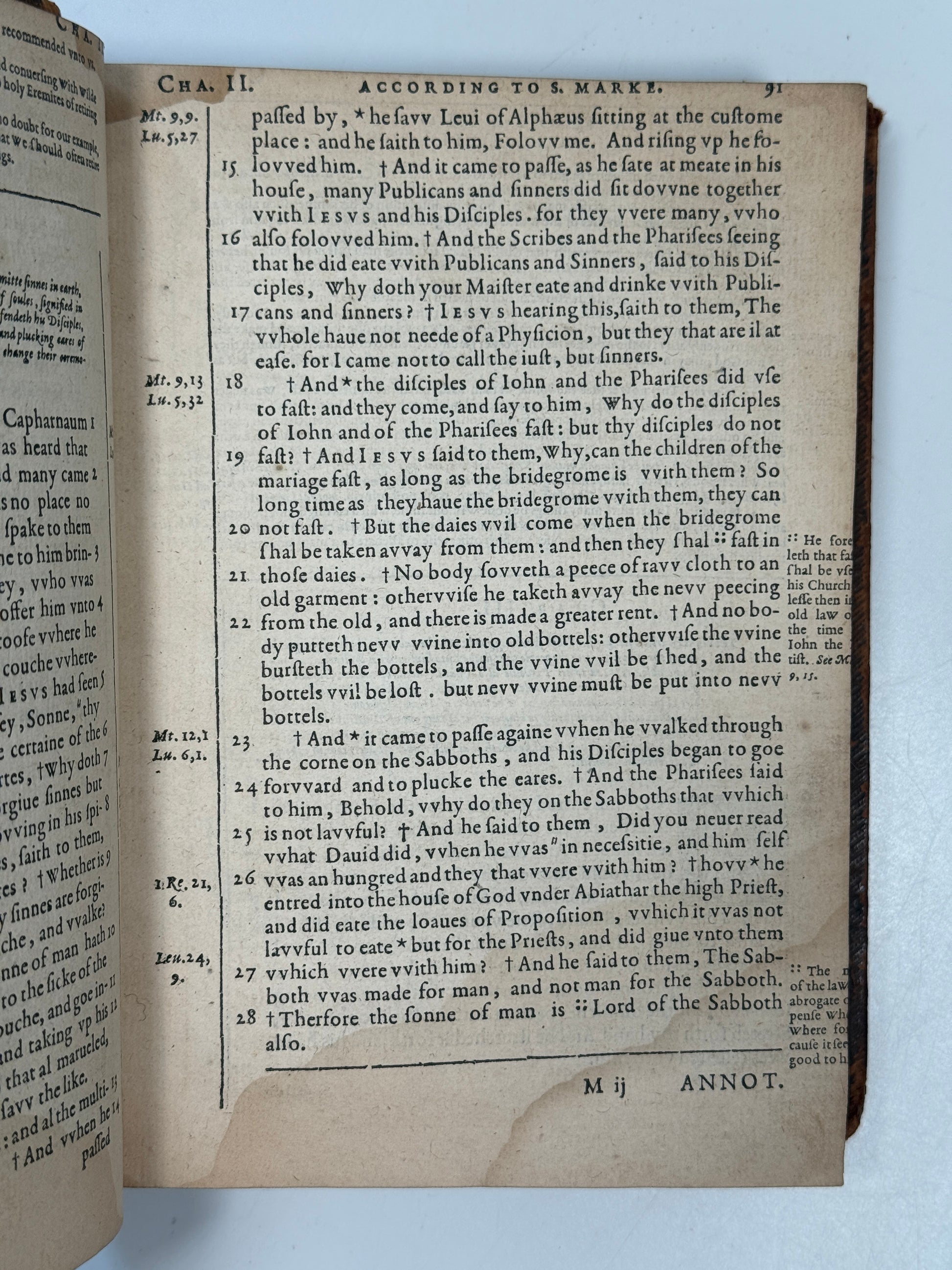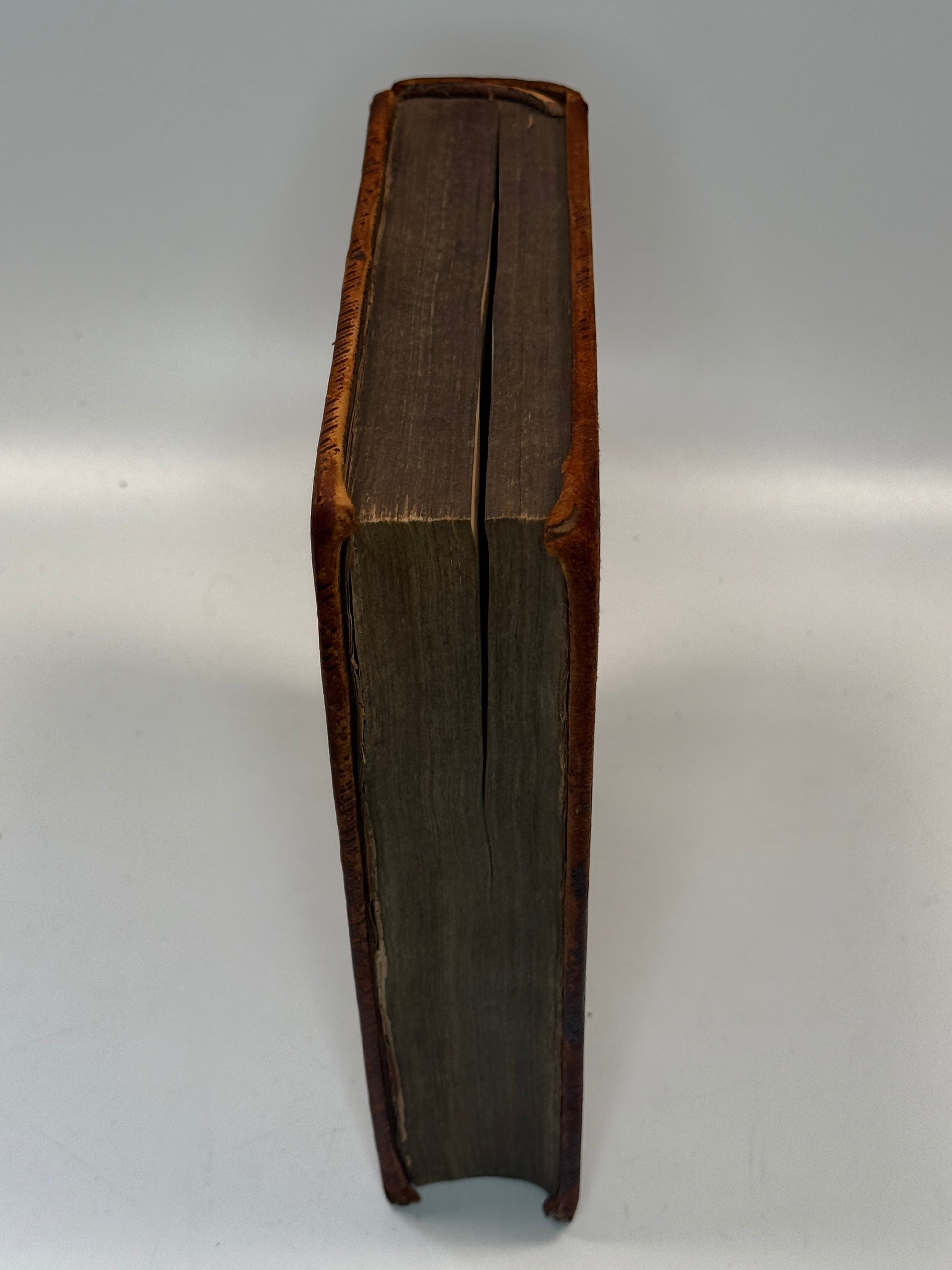 Eighteenth century full panelled calf, rubbed with light scuffing and minor loss to the leather; joints cracked but both boards remain attached, though somewhat fragile. No bookplates present. The text of the New Testament itself collates as complete, though some of the supplementary matter is lacking (a2–b4 and 5B2–5E2), as well as the main title leaf (A1), which is here supplied in a good-quality manuscript facsimile. The extant supplementary matter is bound at the rear rather than in its usual position before the text.