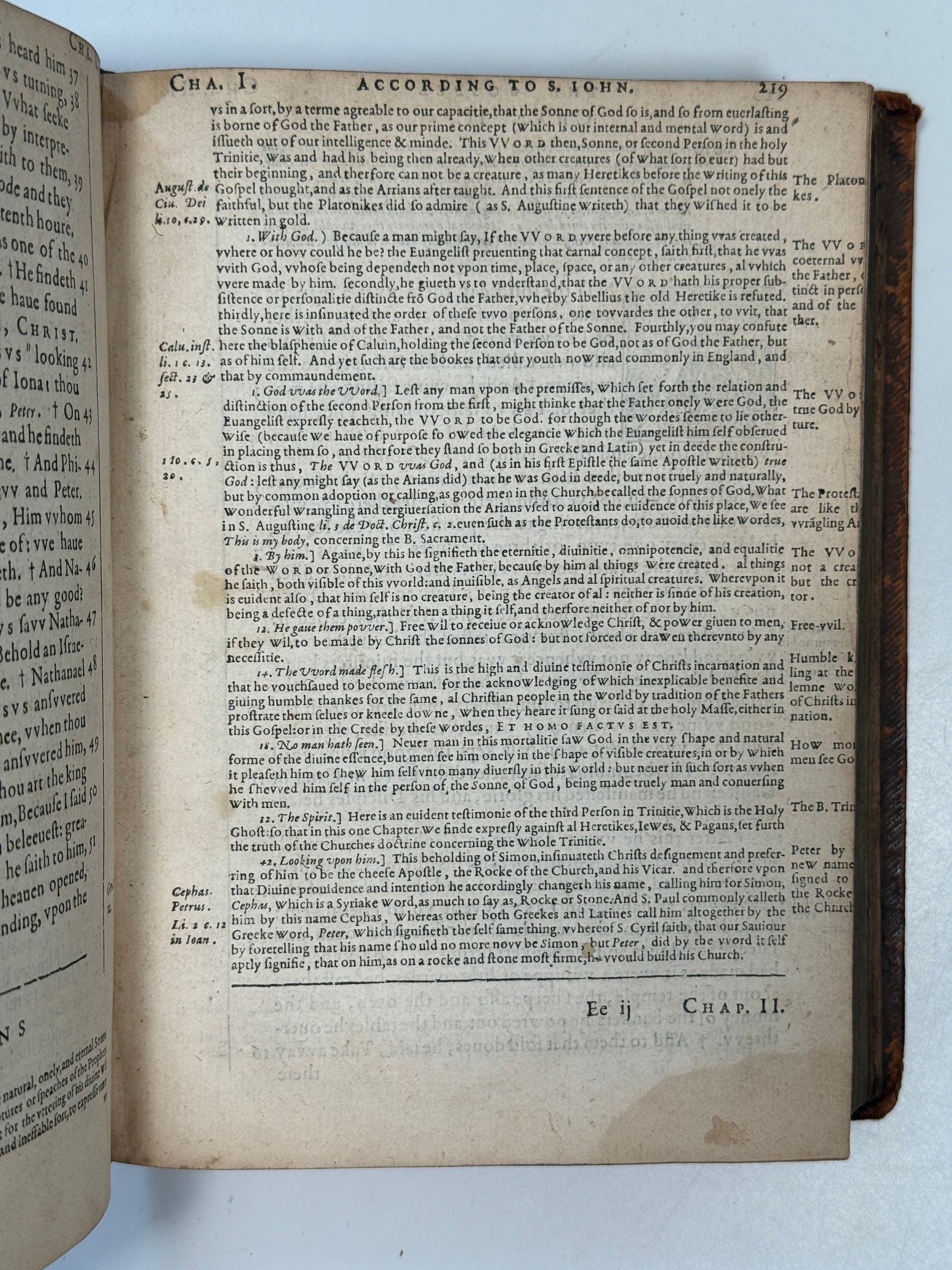 The first edition of the Douay-Rheims New Testament — the first Roman Catholic English translation of the New Testament. Printed at Reims by John Fogny in 1582 under the direction of the English College, this was translated from St. Jerome's Latin Vulgate by members of the exiled English Catholic seminary. It was produced as a deliberate counter to the Protestant English Bibles then circulating, notably the Geneva and Bishops’ versions, and is accompanied by extensive marginal annotations defending Catholic doctrine and refuting Reformation interpretations.