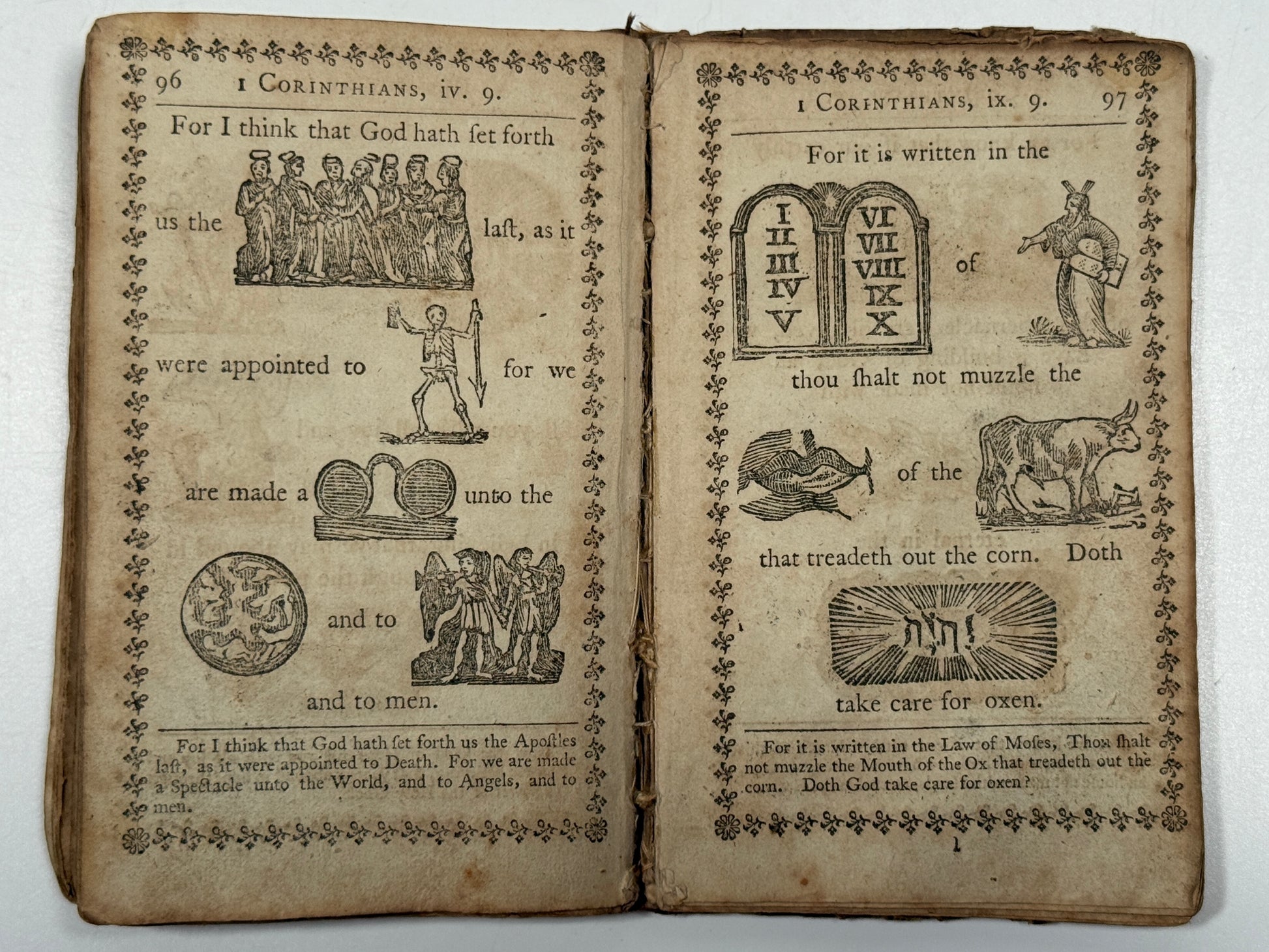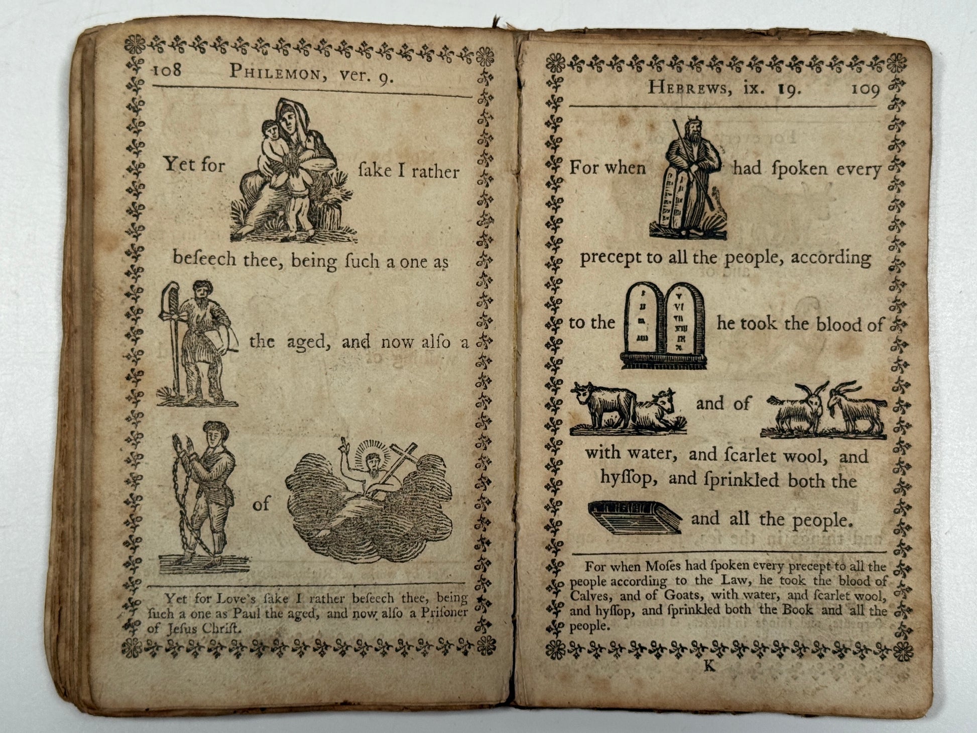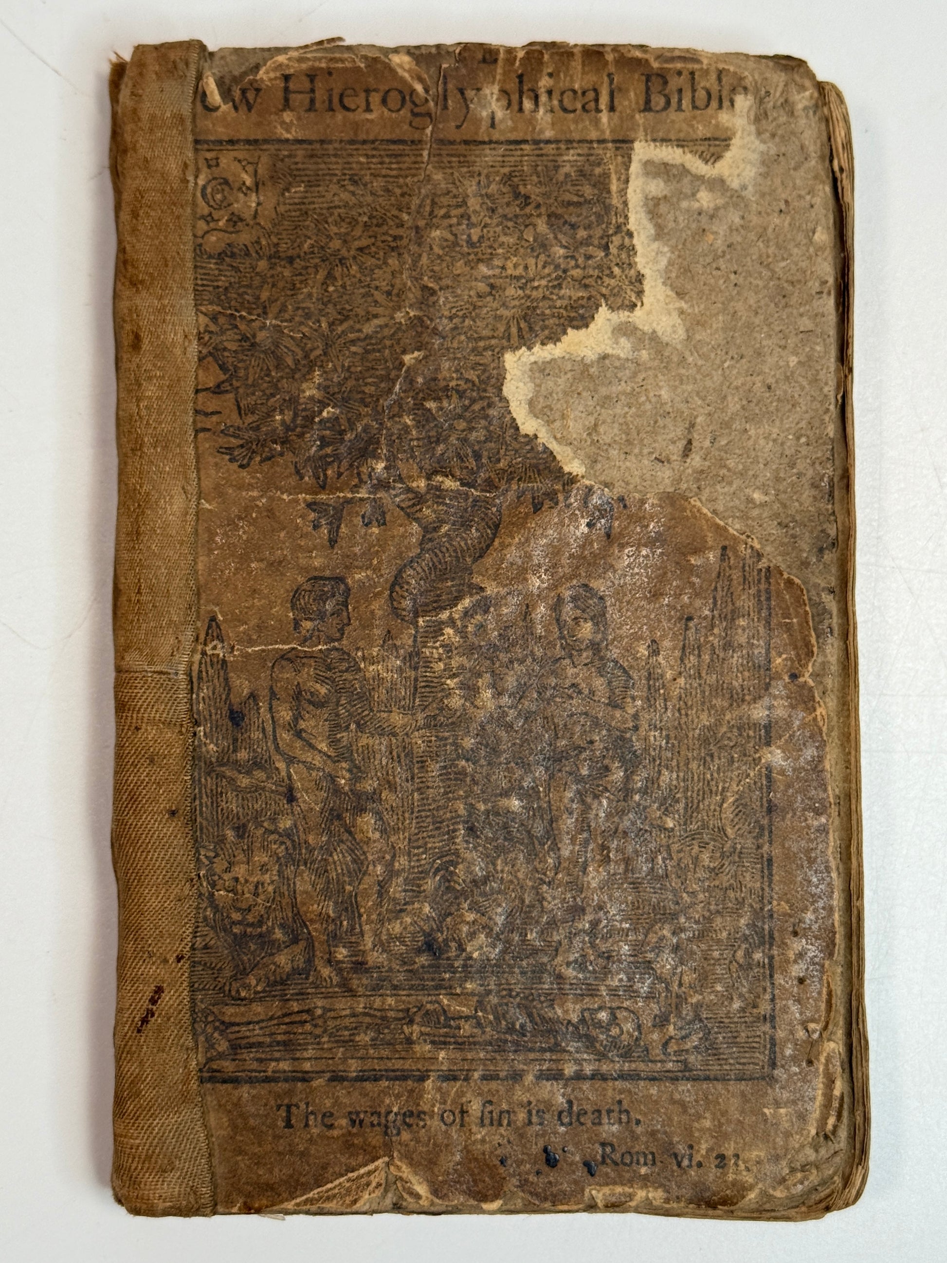 A very rare notably early Hieroglyphic Bible, where Bible stories are explained with key words replaced with pictures. This copy is especially notable for being preserved in its contemporary boards, which is exceedingly rare. This edition was seemingly also released with a different variant title leaf (see ESTC T123482) which is described as the "first edition thus", and so presumably this copy also fits that description.
