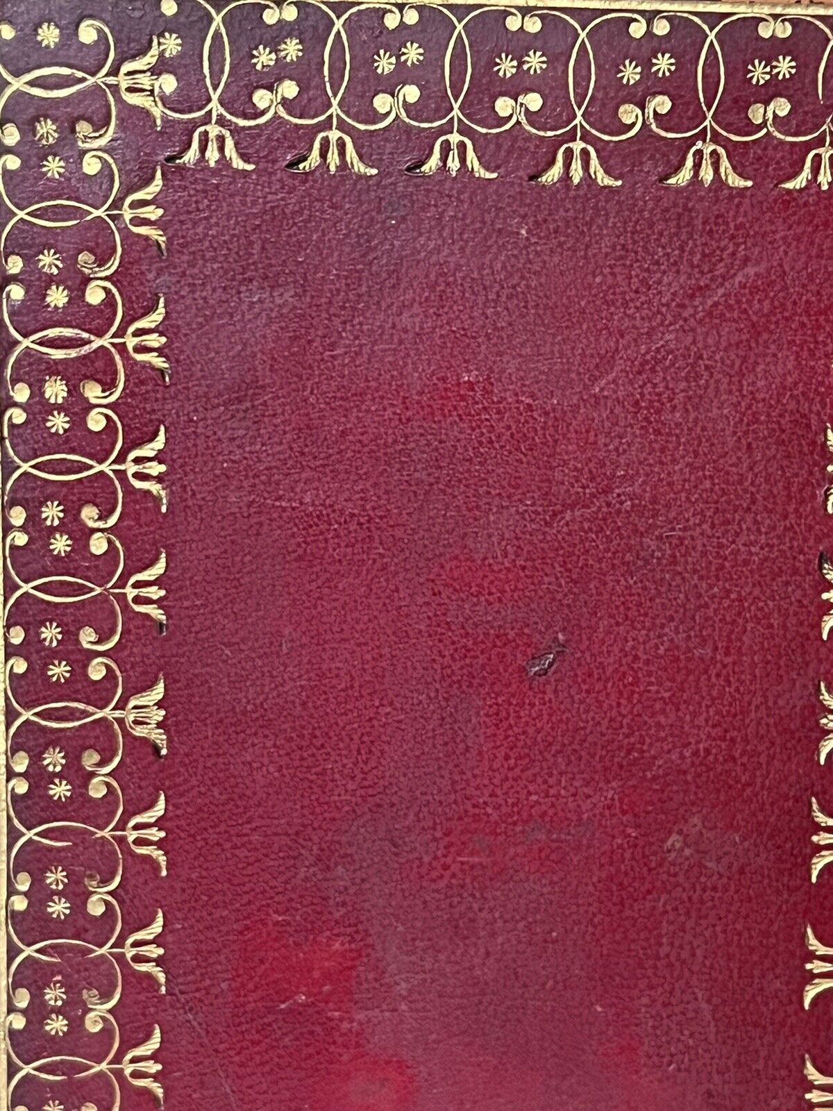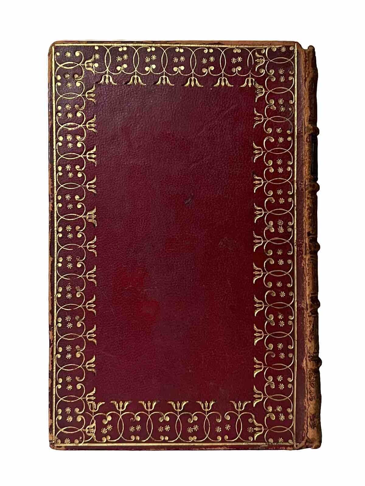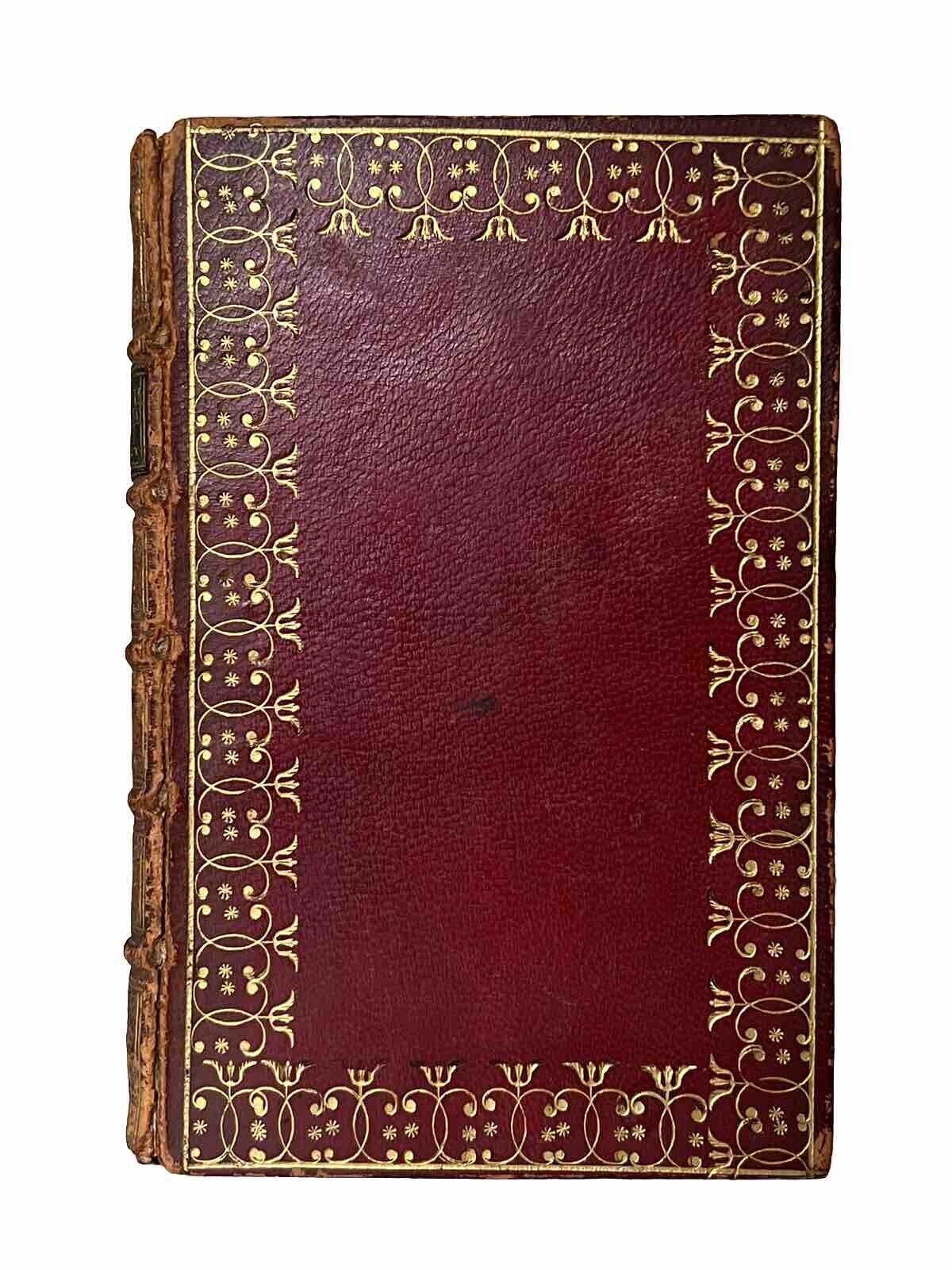 18th century full red morocco binding finely tooled in gilt to spine and both boards in the manner of Roger Payne. Spine faded and rubbed, minor loss at head, retaining its tooled black morocco label. Both boards are bright without significant gilt loss. Joints rubbed, slightly cracked, but with both boards securely attached, the binding secure, and without shelf lean. Edges marbled, contemporaneous to binding. Bookplate to front pastedown. Blanks are replacements, thus lacks the original blanks. A few light pencil writings to endpaper blanks as typically found. Very clean throughout the full text block. Title page and gathering [a] toned else internally excellent.