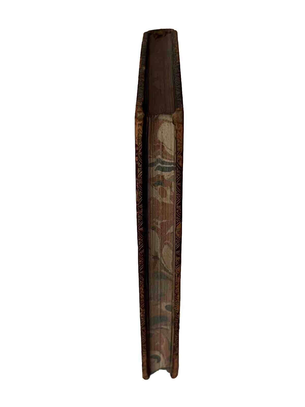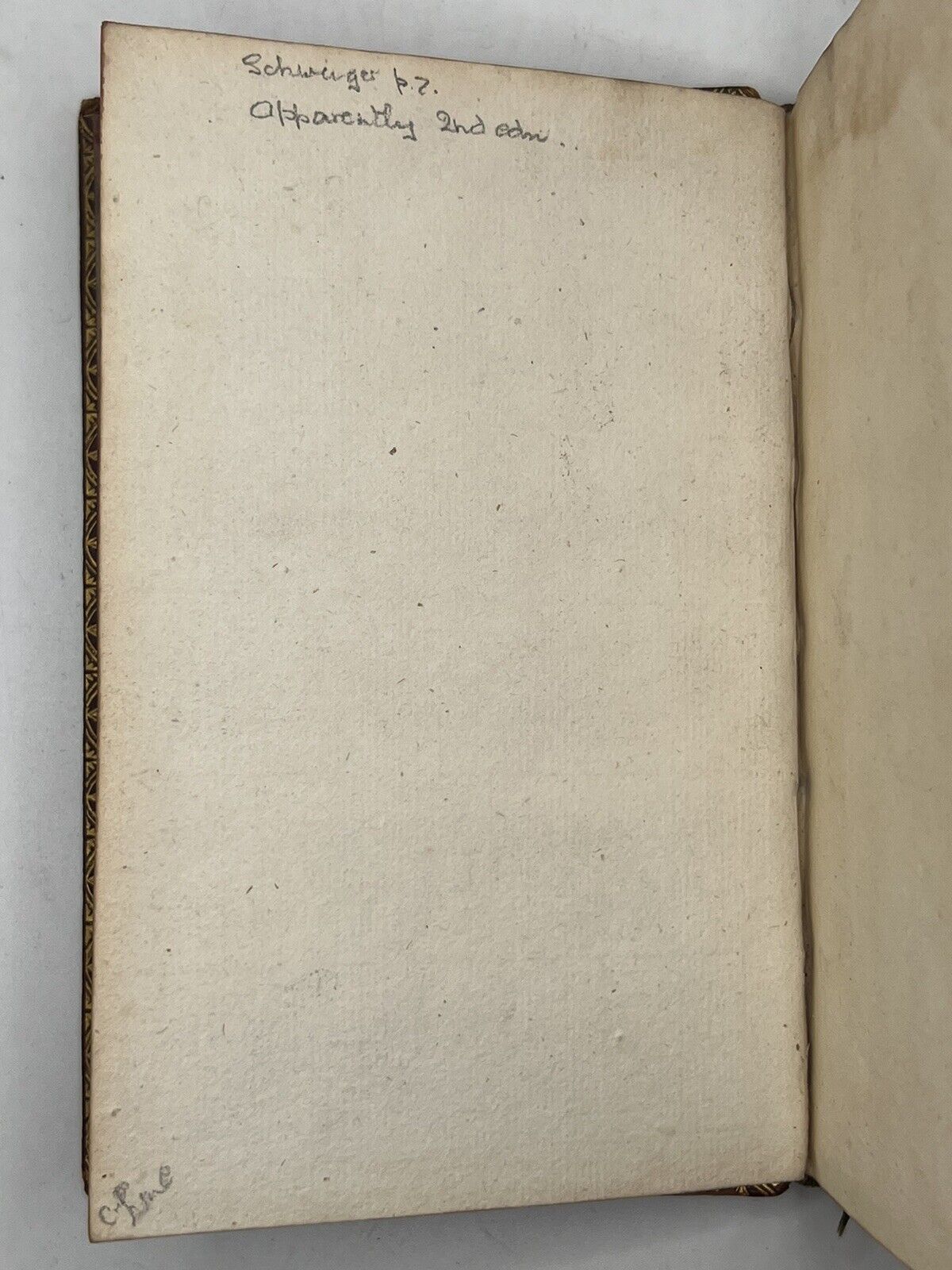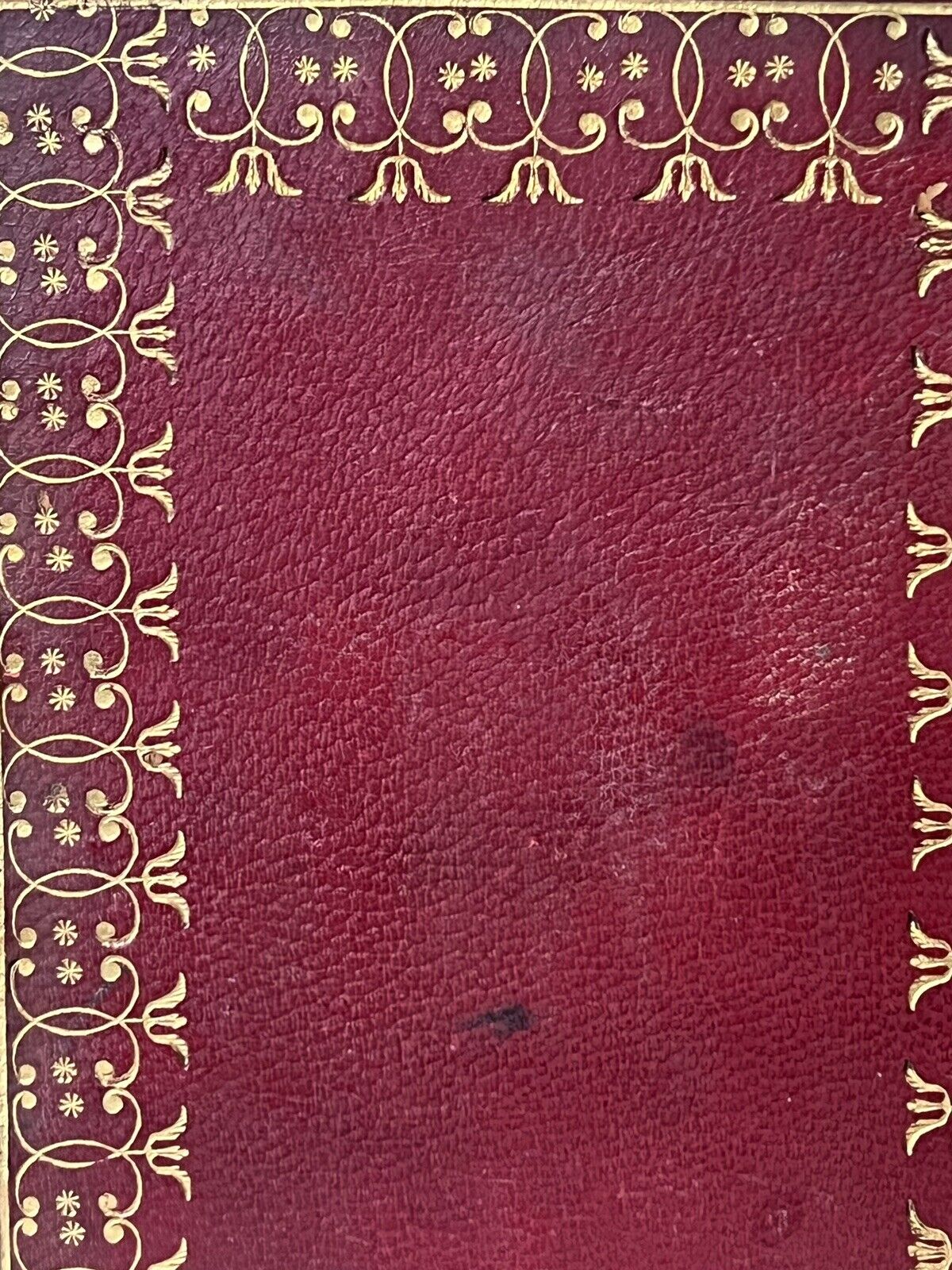 18th century full red morocco binding finely tooled in gilt to spine and both boards in the manner of Roger Payne. Spine faded and rubbed, minor loss at head, retaining its tooled black morocco label. Both boards are bright without significant gilt loss. Joints rubbed, slightly cracked, but with both boards securely attached, the binding secure, and without shelf lean. Edges marbled, contemporaneous to binding. Bookplate to front pastedown. Blanks are replacements, thus lacks the original blanks. A few light pencil writings to endpaper blanks as typically found. Very clean throughout the full text block. Title page and gathering [a] toned else internally excellent.