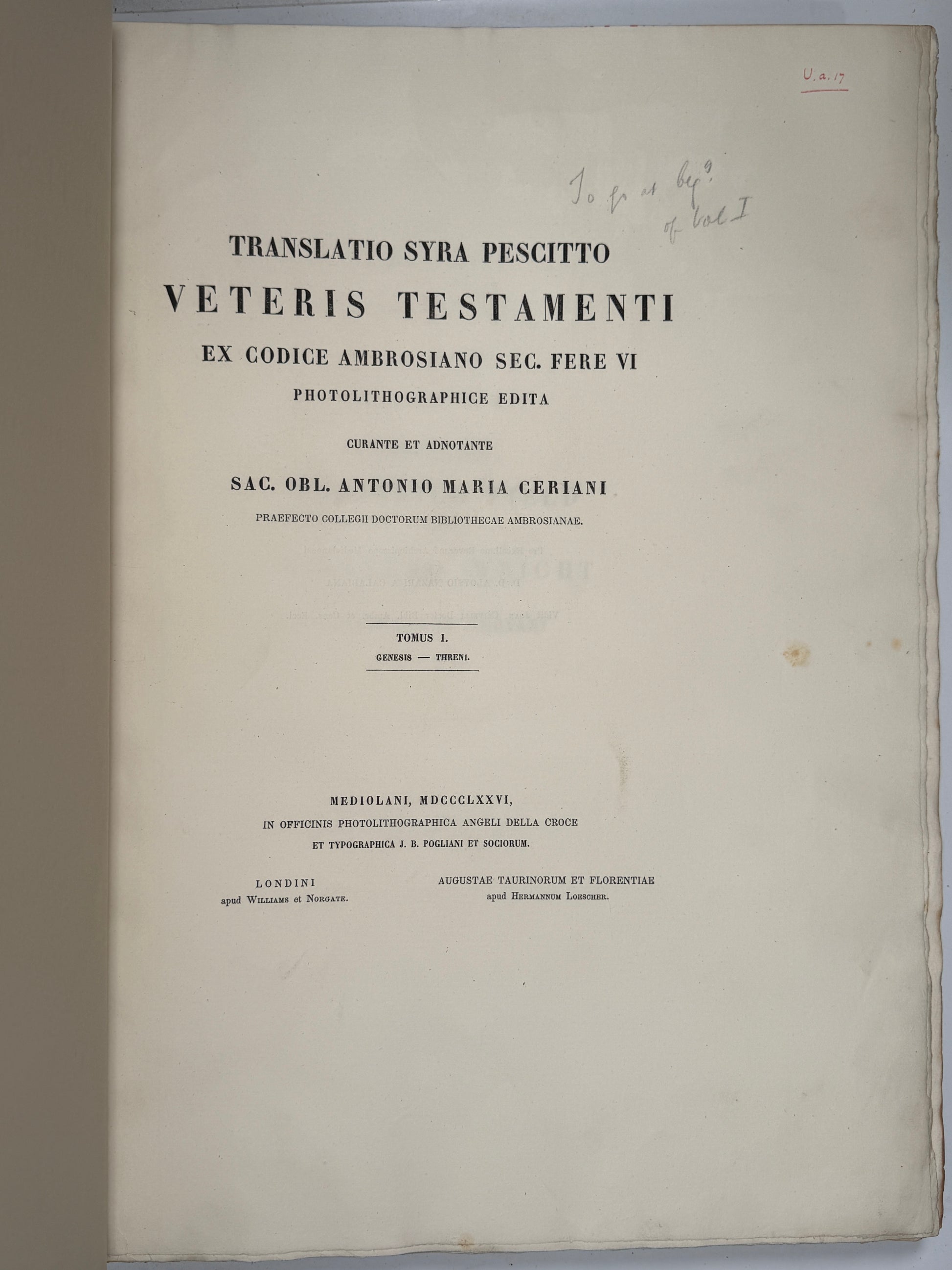 Translatio Syra Pescitto Veteris Testamenti Ex Codice Ambrosiano Sec. Fere VI Photolithographice Edita Curante Et Adnotante Sac. Obl. Antonio Maria Ceriani Praefecto Collegii Doctorum Bibliothecae Ambrosianae. Mediolani, MDCCCLXXVI, In Officinis Photolithographica Angeli Della Croce Et Typographia J. B. Pogliani Et Sociorum. Londini Apud Williams Et Norgate. Augustae Taurinorum Et Florentiae Apud Hermannum Loescher.
