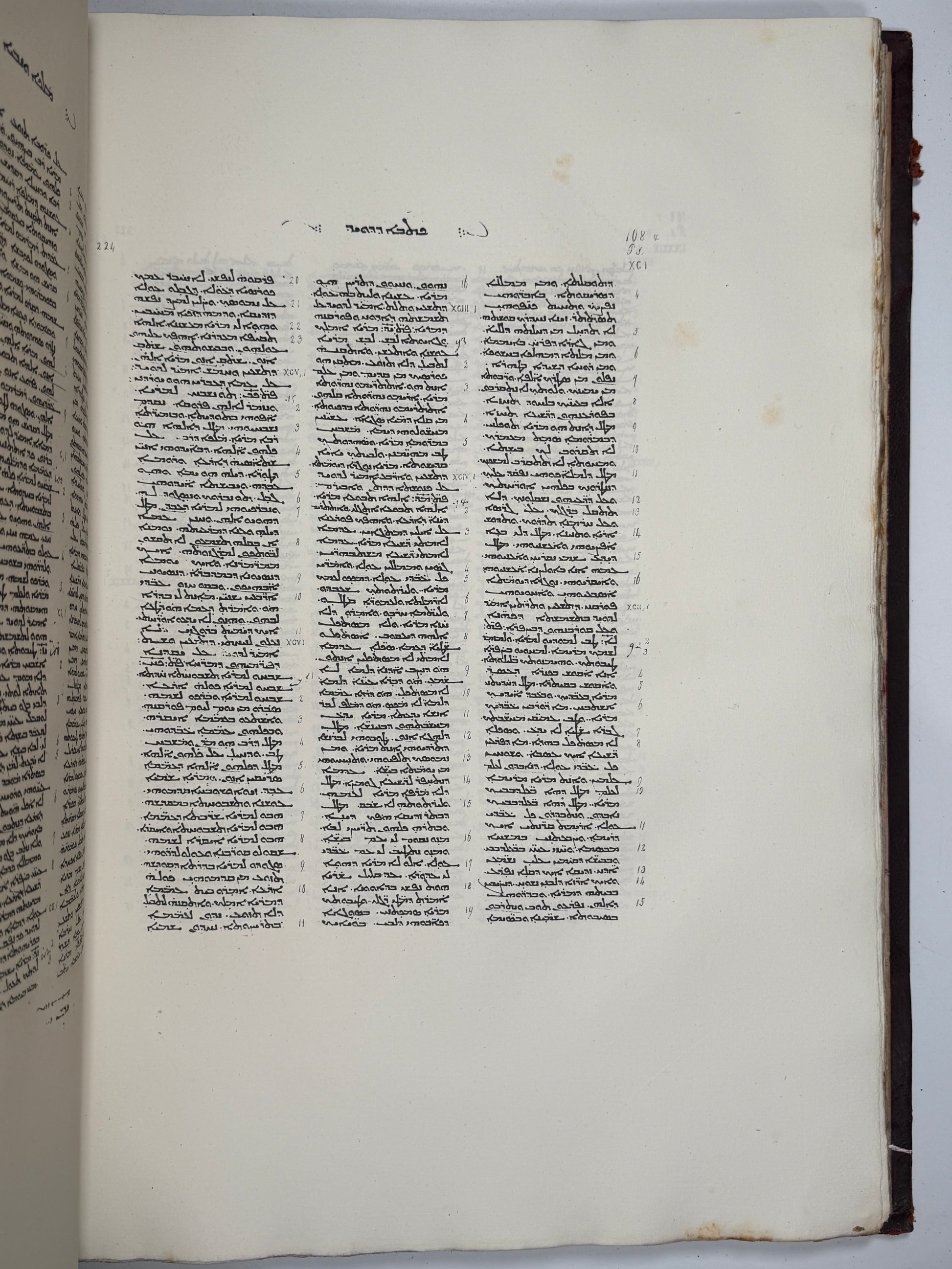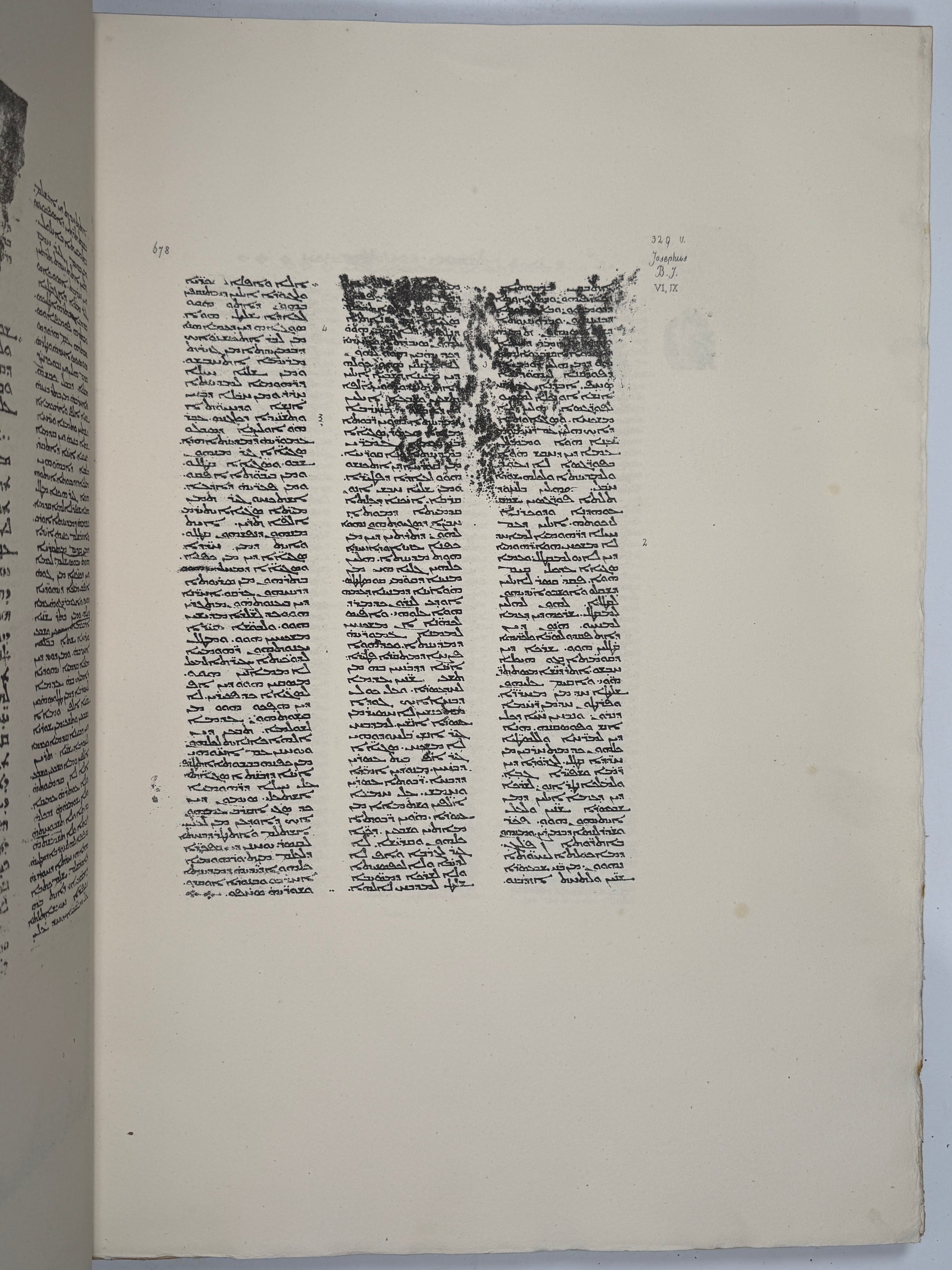 The original codex itself is a remarkably early witness, generally dated to the late sixth or early seventh century, written in elegant Estrangela script and containing the entire Peshitta Old Testament, together with several notable apocryphal and parabiblical texts, including 4 Ezra, 2 Baruch, and the Syriac version of the Maccabean narrative attributed to Josephus. Ceriani’s edition was the first substantial photographic reproduction of a Syriac biblical manuscript and remains an essential scholarly reference. It is extremely rare on the market, and hence the availability of modern facsimiles of this 1876 facsimile. The immense size of the folios of this edition is of particular use for close study of the codex.