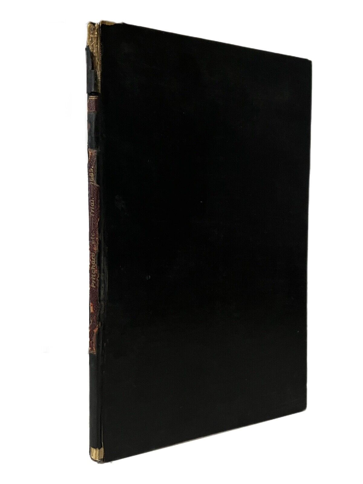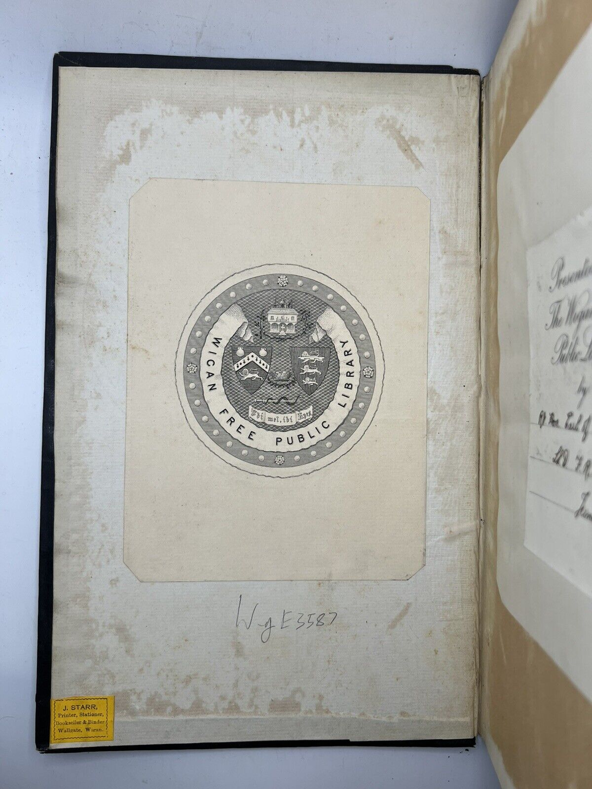 Full cloth binding with an earlier red morocco fragment with the gilt title. Small parts of the cloth backstrip lacking and peeling. Binding lightly rubbed and scuffed. Both boards attached with joints and hinges starting, somewhat fragile. Bookplates attached to the front pastedown and front blank. Ink inscription to the reverso of the title page reading "38720". Text block fairly clean with light toning, some foxing, and occasional pencil marginalia. Occasional library blind-stamping leaves. Toning and offsetting to blanks. Blind-stamp to a small number of leaves.