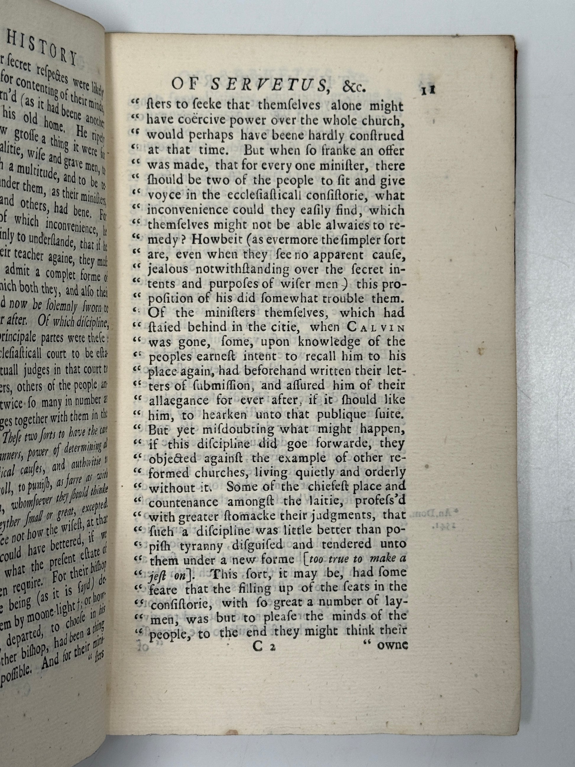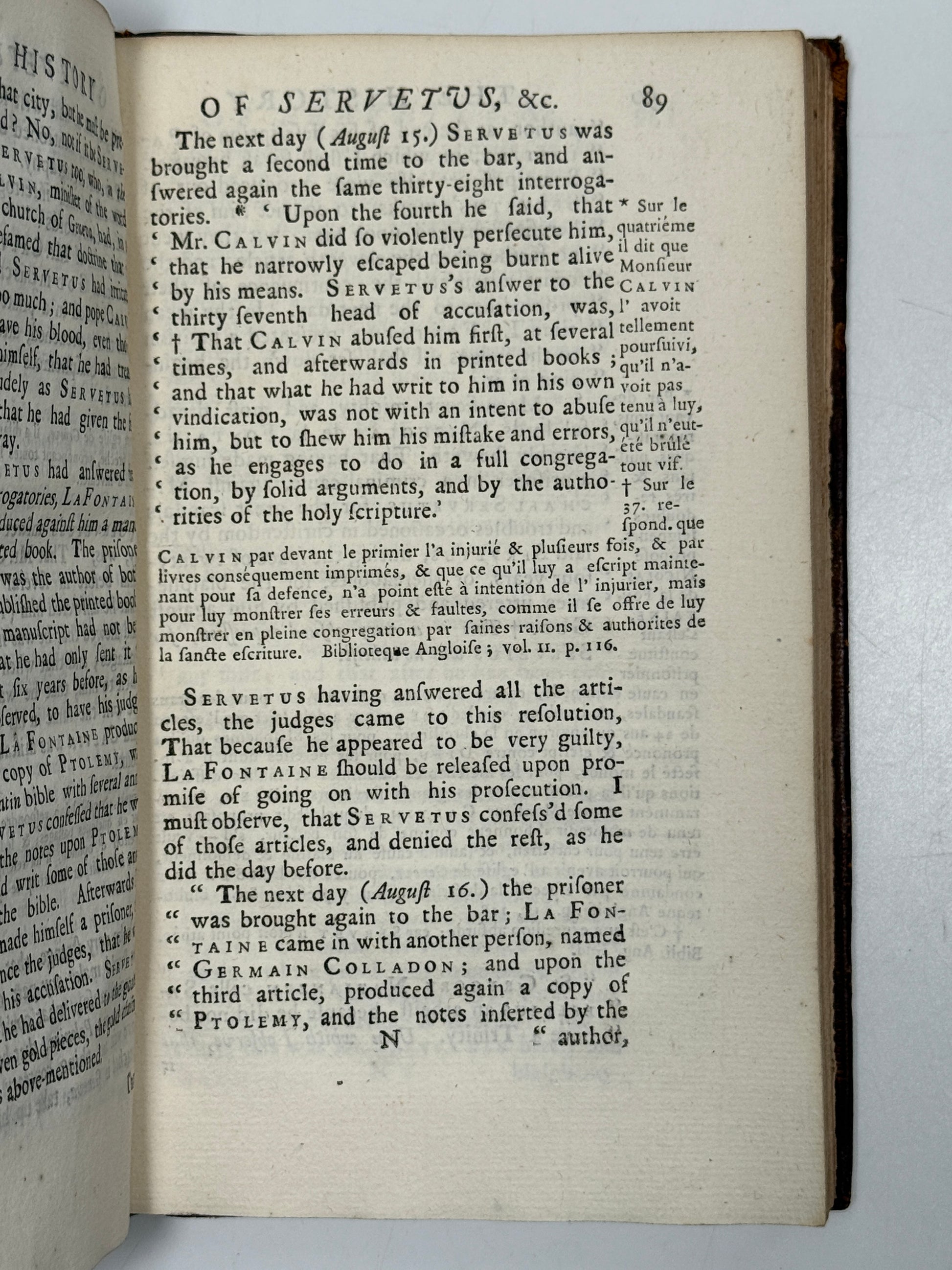FIRST EDITION of this extremely rare and very interesting “impartial” history of one of the most contentious events of the Reformation and Counter Reformation time period, also the first written account of this event in English. It naturally includes extensive discussions concerning John Calvin and looks to be a genuinely fascinating work. This copy supposedly lacks a frontispiece, but no copy we can trace actually has one.