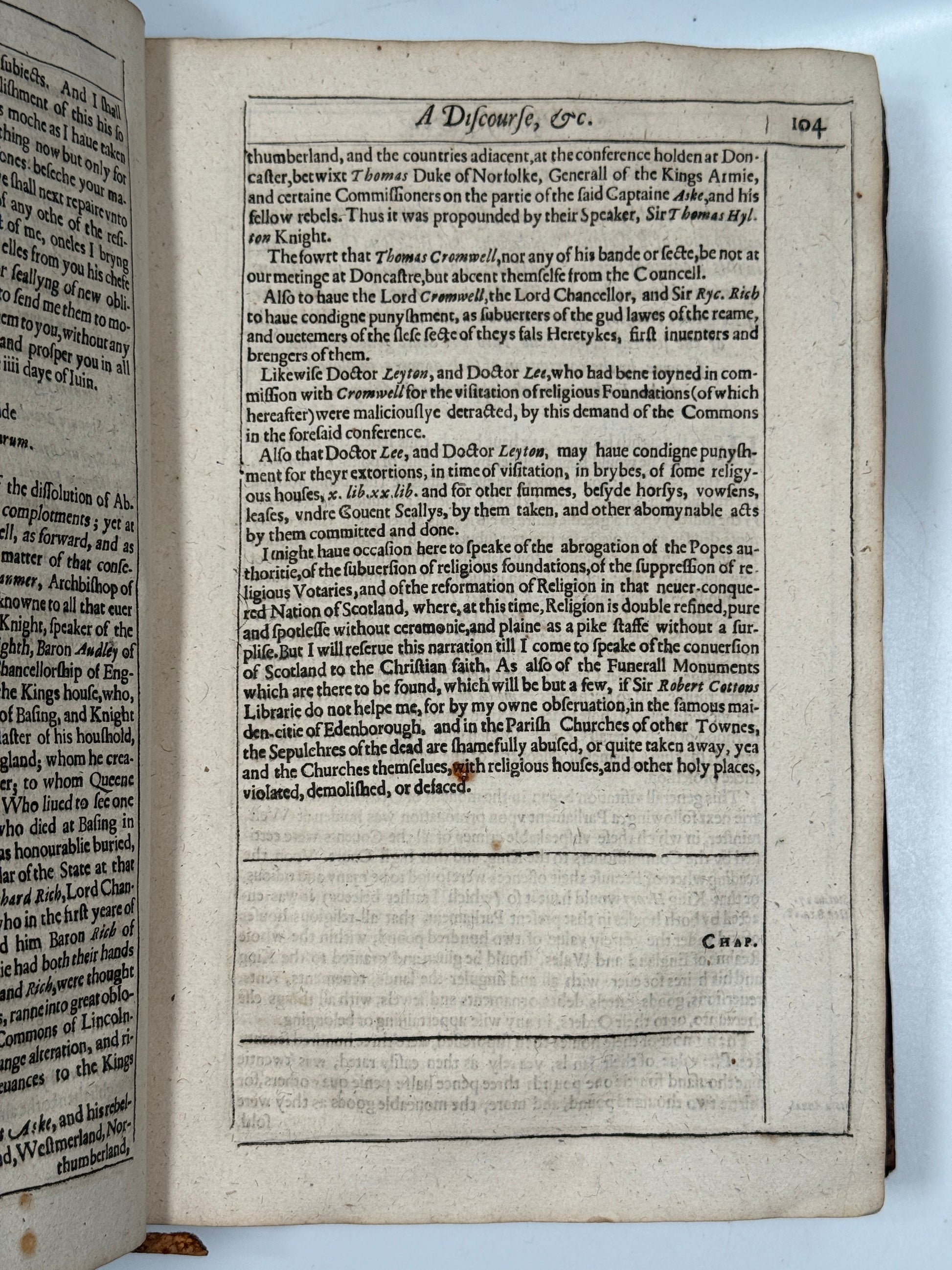 Full brown calf binding with a tooled label in a compartment to the spine between raised bands. Binding rubbed and scuffed. Small tear to the head of the backstrip. Gilt on the tooled label dulled. Shelf and edge wear. Lacking headcap and tailcap. Page edges dulled. Bookplate attached to front pastedown. Ink inscriptions to front and rear blanks. Text block very clean with occasional foxing / marks, and damp staining to the first and last few leaves. Endpapers toned as commensurate with the full leather binding. Holes to the rear blank and pastedown. Uncollated.