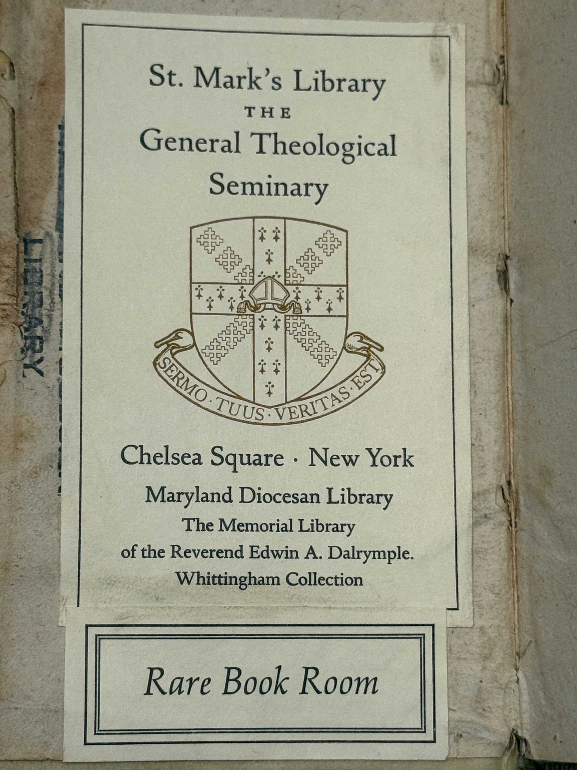 Contemporary full vellum, fresh and clean condition, title in neat MS to head of spine, later sticker below with shelf reference. Both boards securely attached, binding secure. Bookplate to front and rear pastedown from the New York General Theological Seminary Rare Book Room and a stamp to the verso of the engraved title of the Peabody Institute Library Baltimore, Maryland (USA). Collates complete. Text mildly toned else generally very clean throughout.