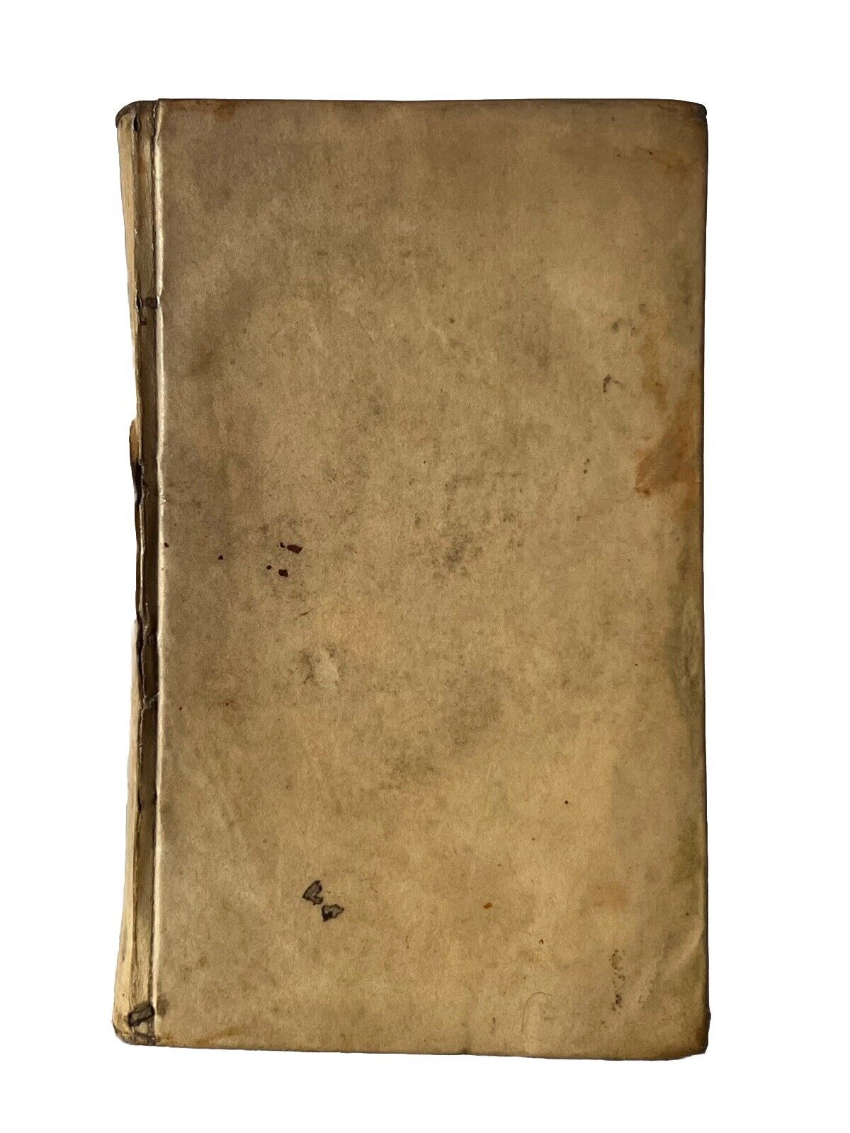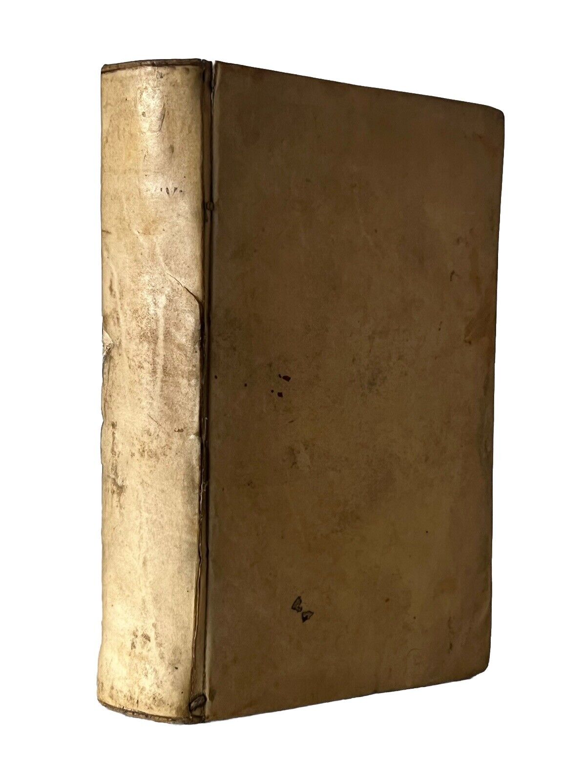 Contemporary full vellum with a dulled ink title to the spine. Binding rubbed and scuffed with some marks. Both boards attached with the front hinge cracked, else minor wear to joints and the rear hinge. Part of the backstrip cracked at the front joint.Text block very clean with light edge toning and very occasional foxing. No attached bookplates. Some damp staining to the first few leaves and few occasional corners. Lacking front blanks. Ink inscription to the head of the front pastedown. Pencil inscriptions to the front and rear pastedown as well as to the rear blank. The main text ends on pp.597(2L7) and restarts on 2M5, thus lacking 5 leaves. Tears with some loss of text to three index pages (2M5-2M7).