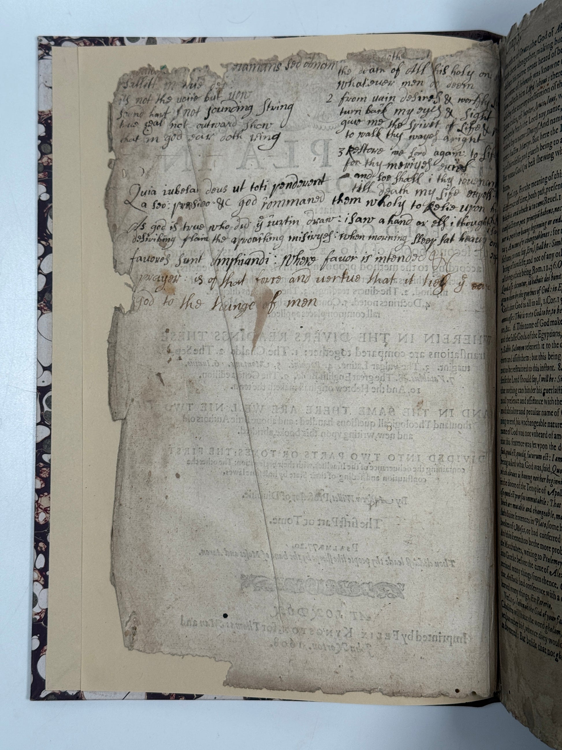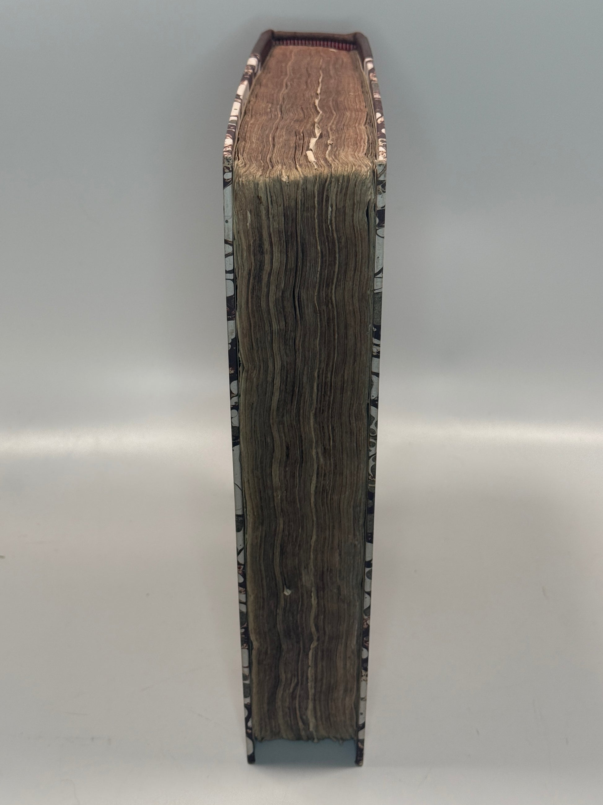 Modern quarter brown calf over marbled paper backed boards with a red tooled label in a compartment to the spine between raised bands. Binding near fine with few minor signs of wear. Both boards securely attached. Shelf and edge wear. Page edges dulled and toned with some gatherings sticking out slightly. Text block clean with light edge toning and sporadic foxing, and with some occasional marks. Title page of Part 1 creased with some loss at the edges, small tears, and inscriptions to the rear side. Some leaves more toned than others. Small edge loss to the first few and last few leaves. Some minor wormholing through most of the text block. Small number of ink marginalia. Some loss to the leaf edge of pp.157/158 / P1, with no loss of text or sense. Numerous ink inscriptions to the back side of the title page of Part 2. Some damp staining to some of the leaves, most prominently to the last few leaves. Small loss to the edge of pp.323-326 with small loss of text. Lacking all leaves between the first title page and pp.39, and then the most of the leaves of the index at the rear, the book should collate as follows: [16], 280, [6], 281-877, [33] pp., (the first leaf is blank).