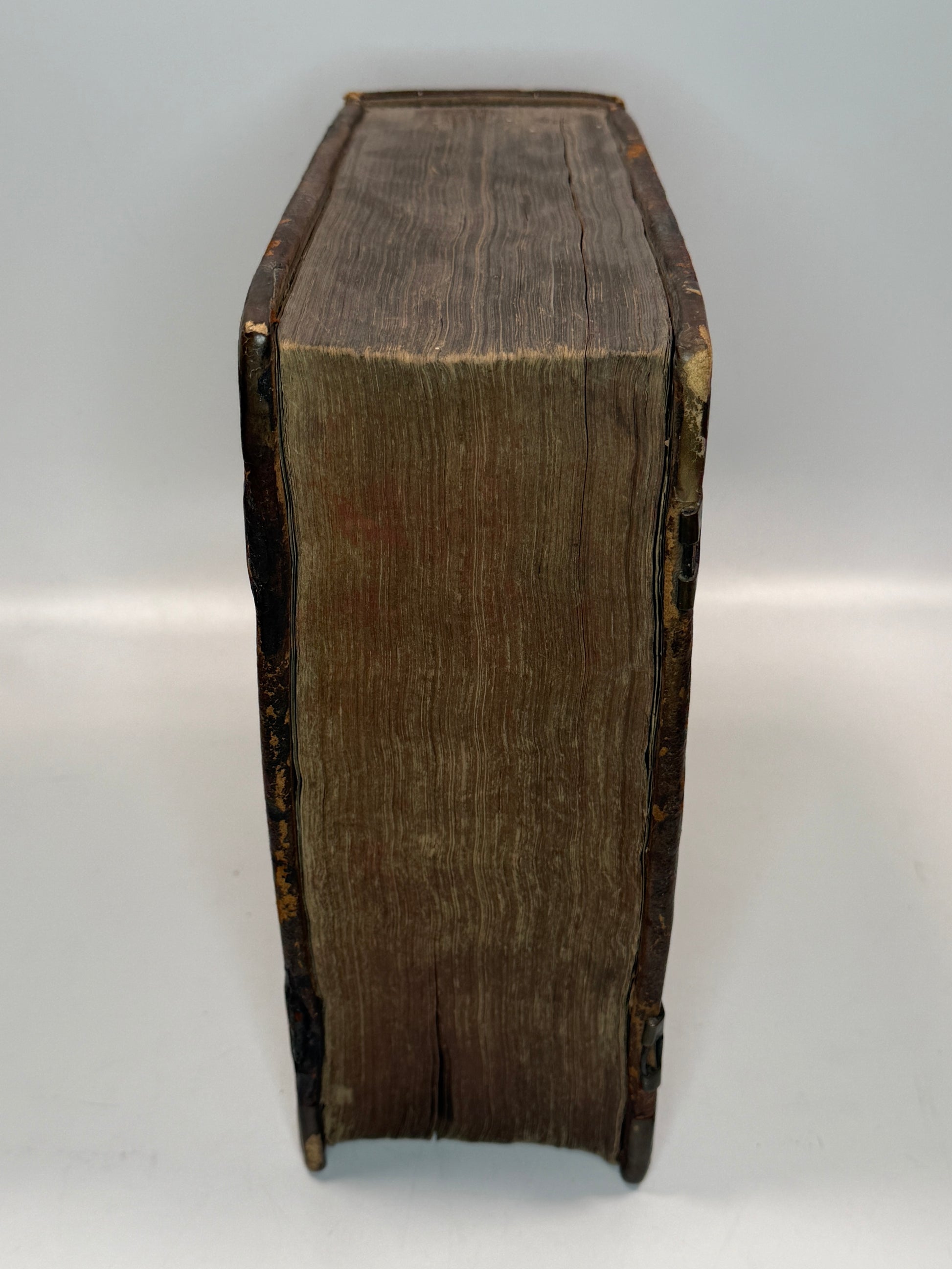The Bible lacks the general title leaf (as usual), else collates as complete - the texts of the Old and New Testaments are complete, as is the Apocrypha. The Concordances section is also complete. The 1585 Psalter at the rear is complete with all 150 Psalms, but lacks the final two leaves which ordinarily follow. The Book of Common Prayer bound at the front lacks all before B1 (i.e. the first quire). Contemporary 16th century English inscription across the edge of F6 (BCP). Preliminary leaves a little ragged up to and including the first two leaves of the Bible text (Genesis), but fully legible. Internally, in general, a well preserved copy, particularly for being largely complete; a scarce thing for Geneva Bibles, especially this early.