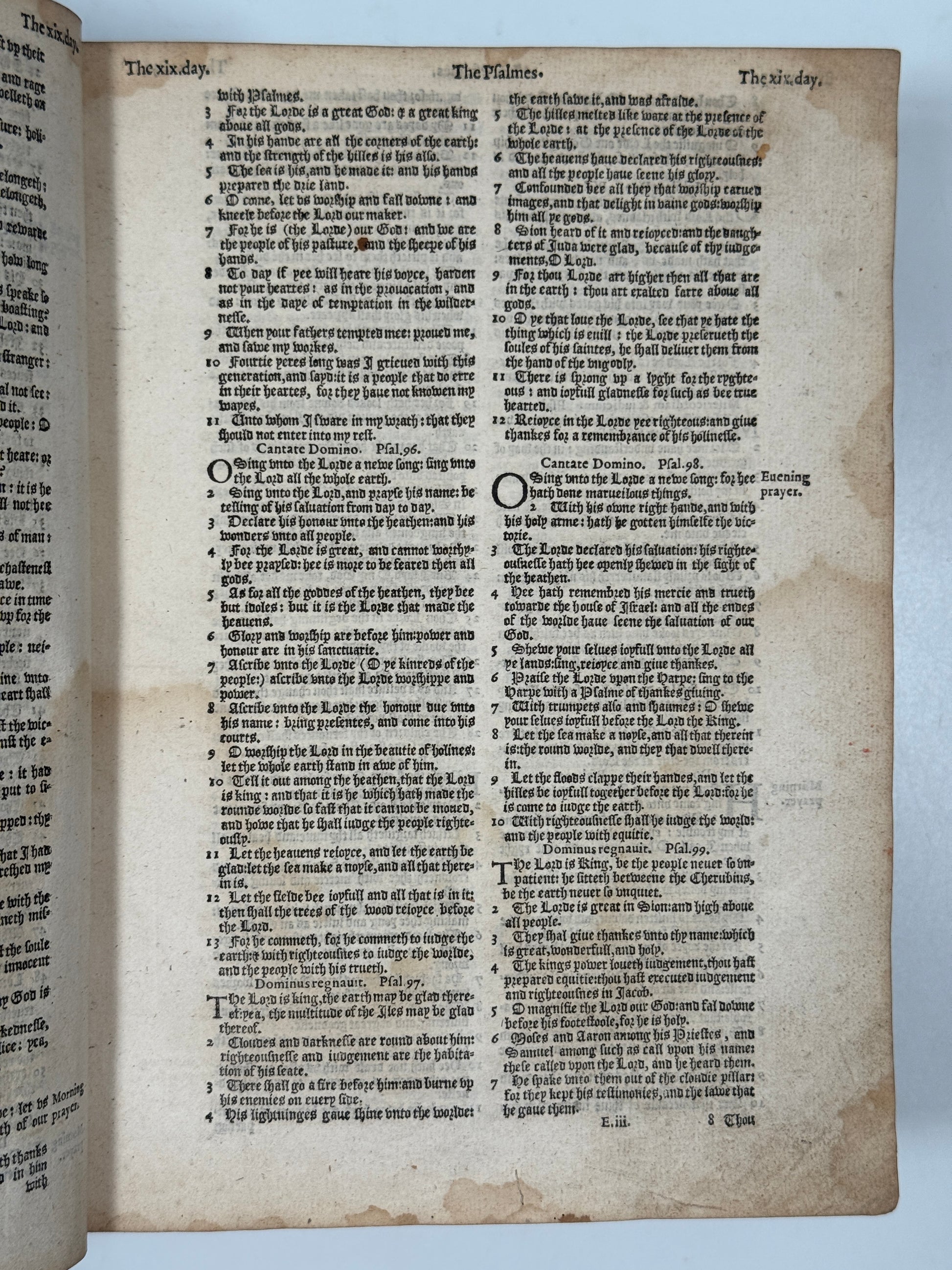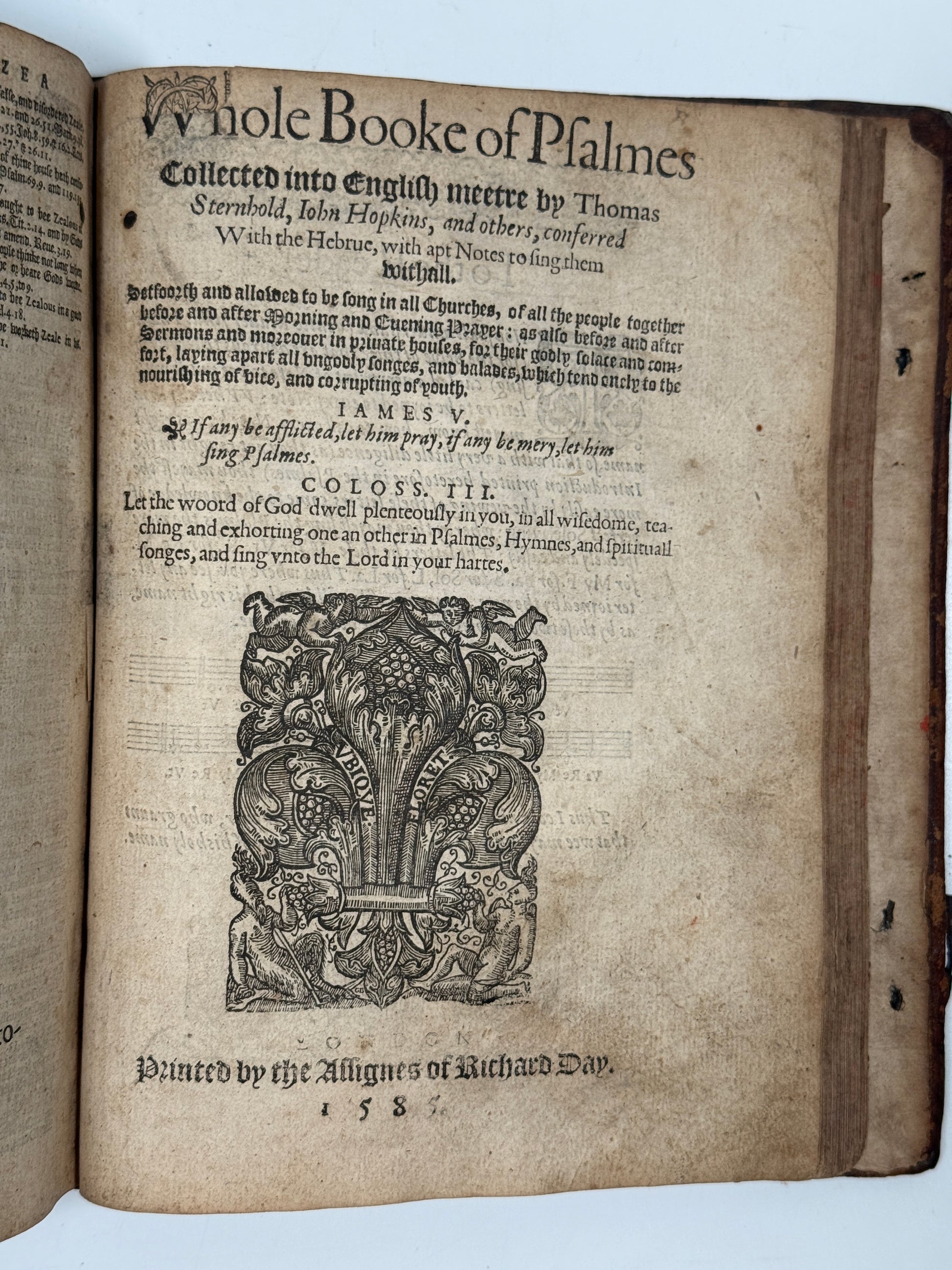 The Bible, Containing the Old and Newe Testament of our Lord Jesus Christ, Conferred diligently with the Greeke, and best approved translations in divers languages. London: Christopher Barker, 1585, 4to. [Together with] Two right profitable and fruitfull Concordances. London: Christopher Barker [c.1585]. [Together with] The Whole Booke of Psalmes Collected into English Meetre by Thomas Sternhold, John Hopkins, and others. London: Richard Day, 1585.