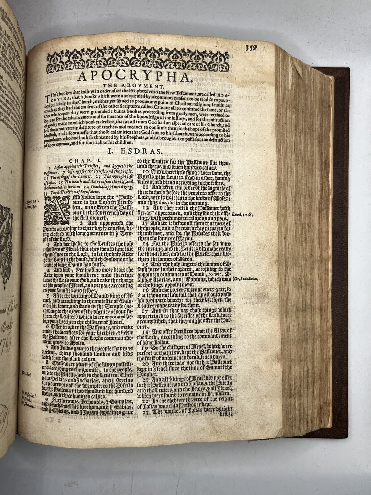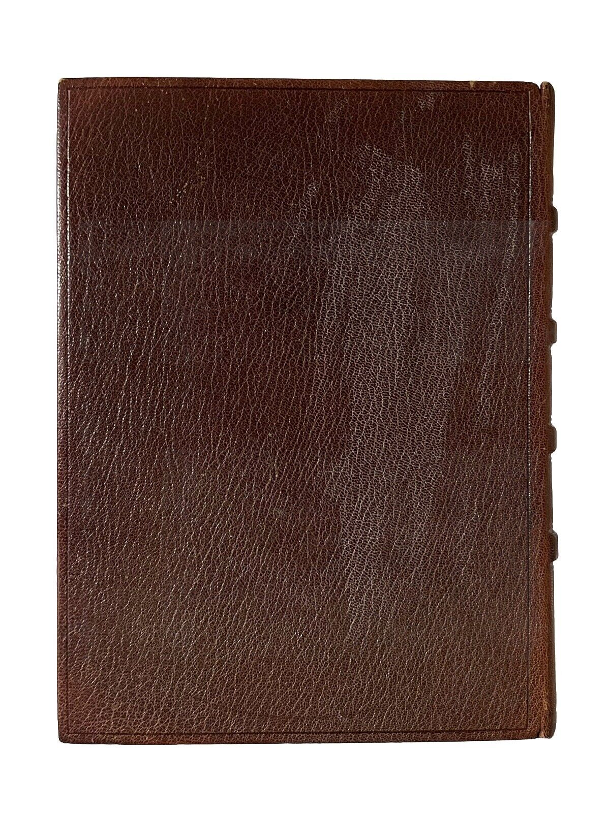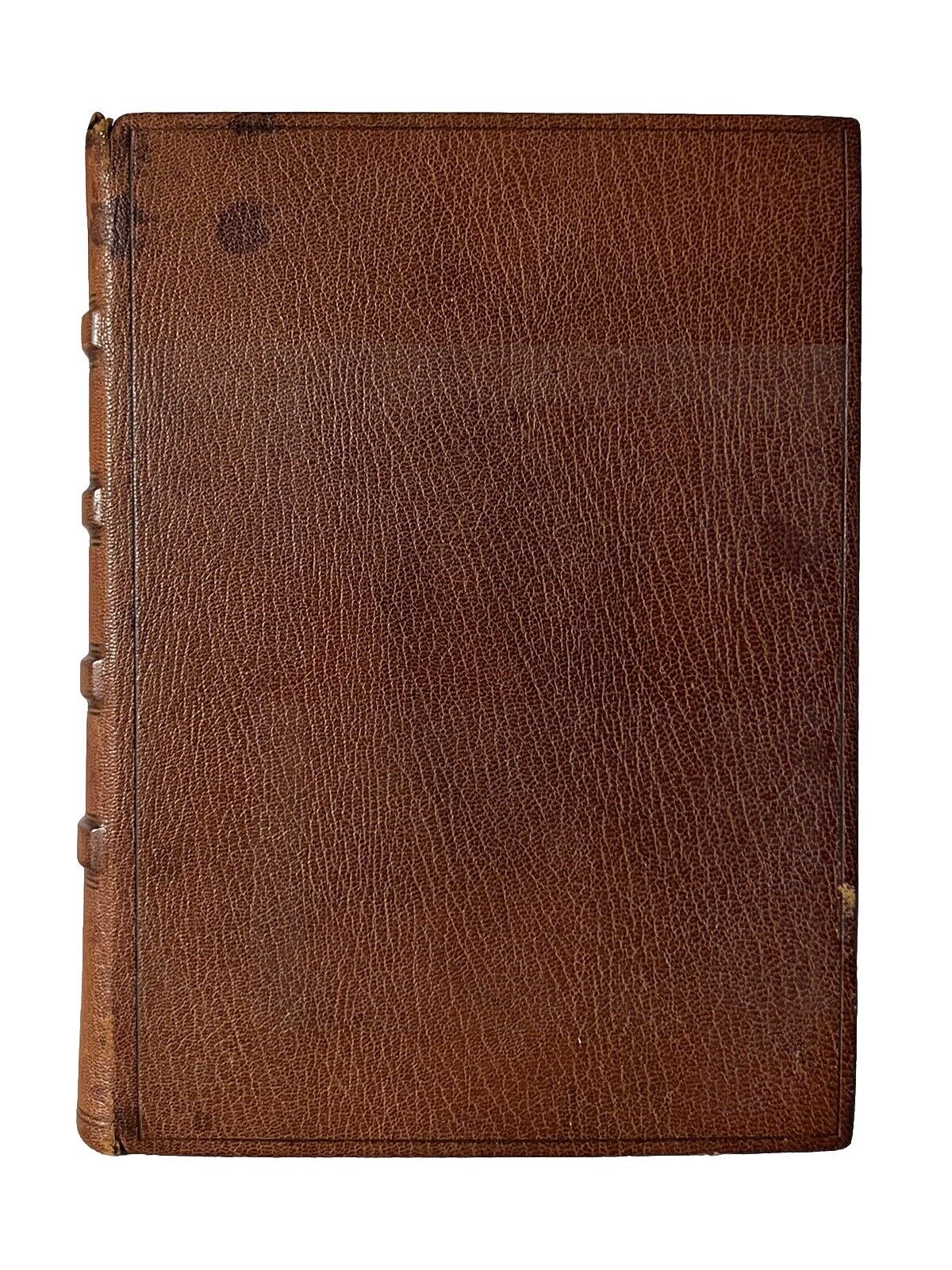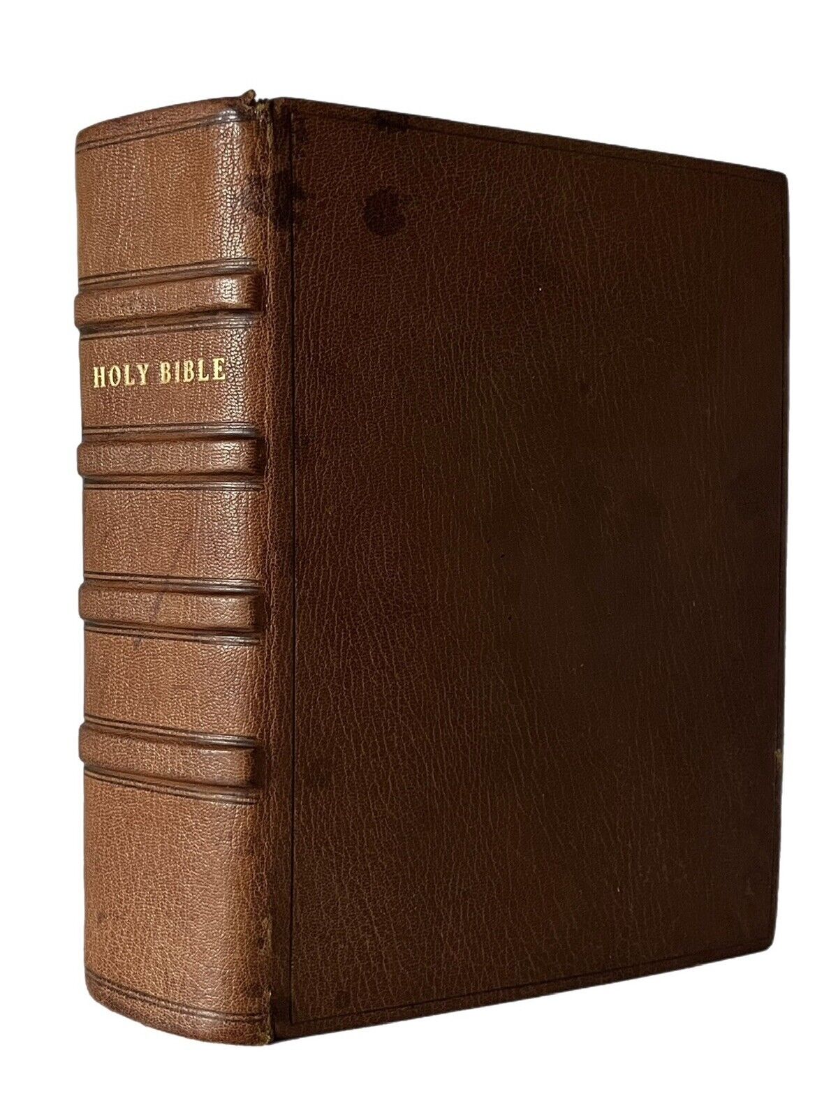 Rebound full brown morocco with a gilt title in a compartment to the spine between raised bands; rebound in 1970 as detailed under provenance, above. Both boards securely attached with reinforced hinges from the endpapers being replaced, retaining one original blank to the front with the corresponding provenance information. Binding lightly rubbed with some stains, and the rear board darker than the front board and spine, but generally very attractive indeed! Light shelf and edge wear. Text block very clean with light edge toning and very sporadic and very minor foxing. Ink inscriptions to the verso of 2S2, 2Y6, 3I2-3, 3B5, the title page of the New Testament and its verso, the verso of *iii, 3Z9, both sides of the colophon leaf, F5 of the Tables, and the verso of L2 of the Tables. Occasional damp staining to the edges, ink stains in a few places, and occasional very minor wormholing mostly to blank spaces and across headers, more prominently to 3P1-3R2 and 3S6-3X6. Leaf numbering skips 388-389 through mispagination but there are no leaves lacking. Very small hole to the blank space of 3I1. Edge repair to the New Testament title page. Small tear to the edge of 3M1, affecting only a small amount of marginalia. Full edge repairs to 3M4 and 3M5. Small edge tear to 3P1. Leaf numbered 490 mis-numbered as 499. Edge repair from 3V1 to 3Y8, with some loss of text to 3Y8, and some edge tears. Ink marginalia to 3V3. Joint repair between L1 and L2 of the Tables. Lacking three leaves 3Y3-3Y6, as detailed in the collation above else collates as complete including both original title pages.