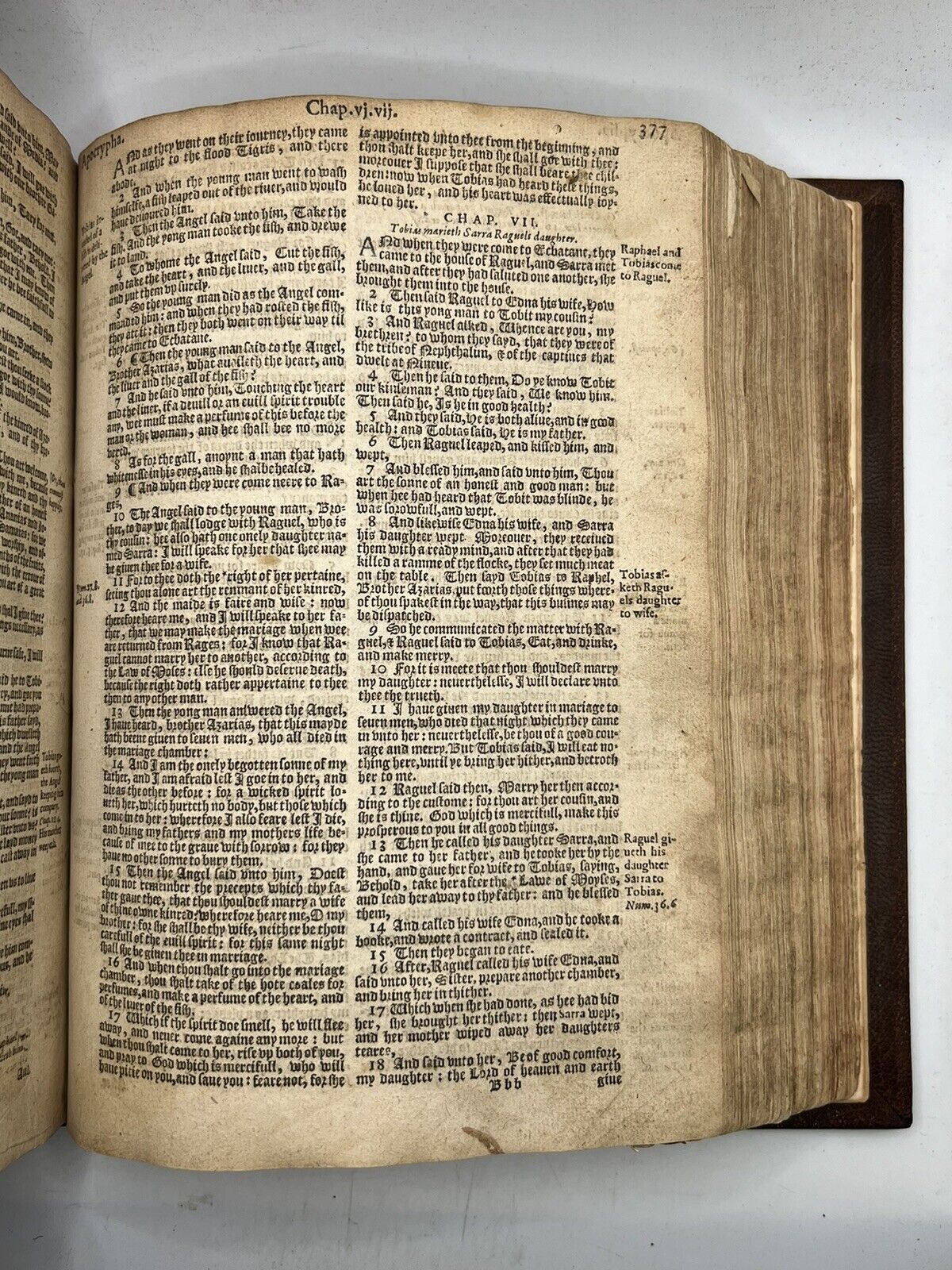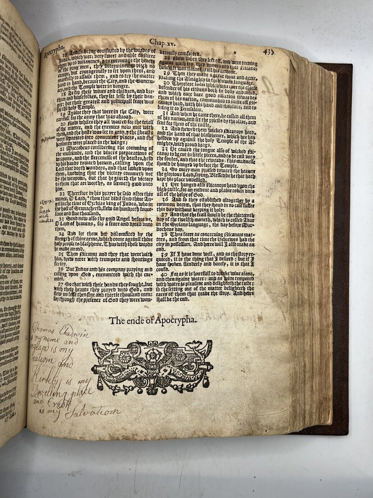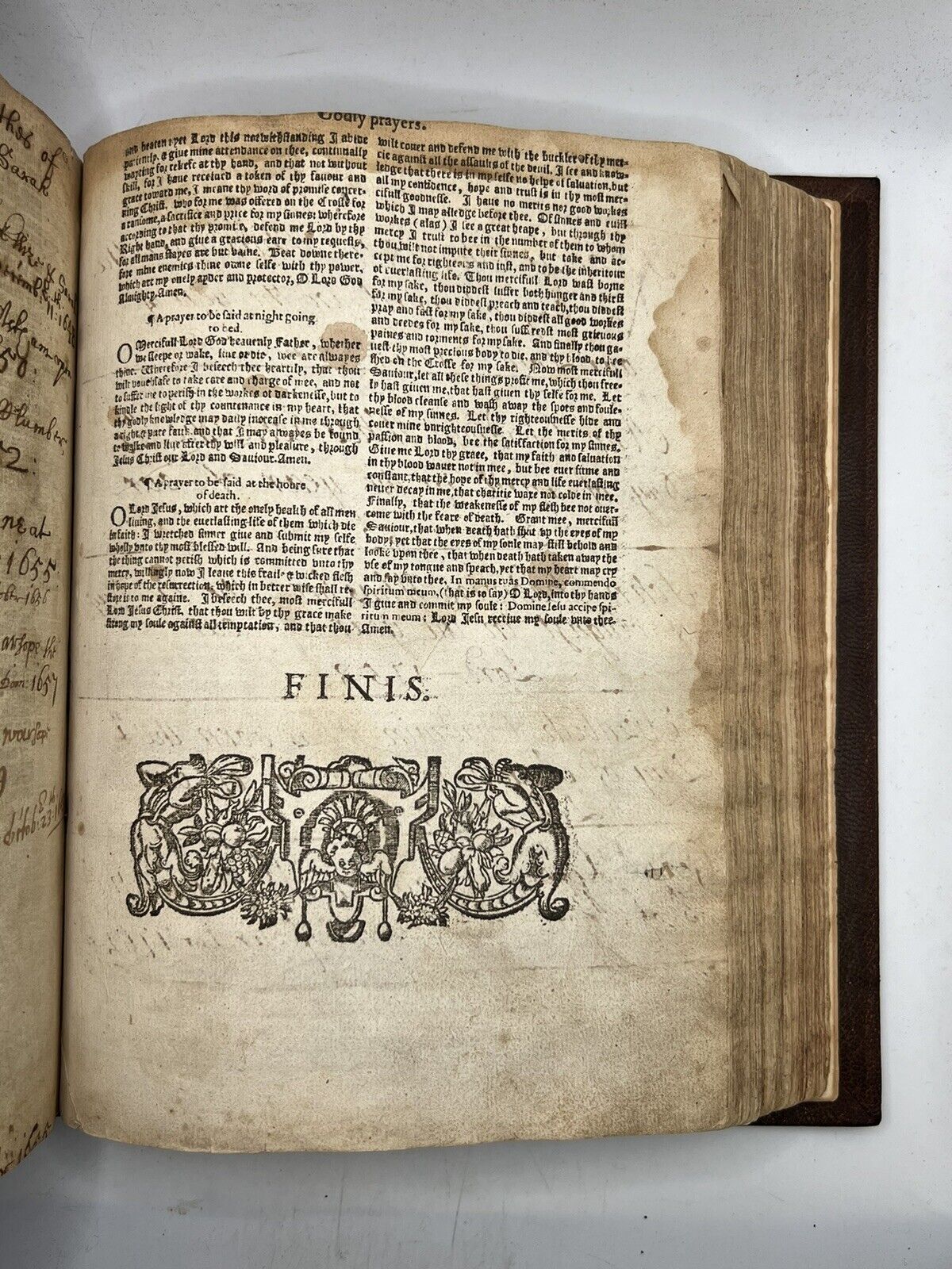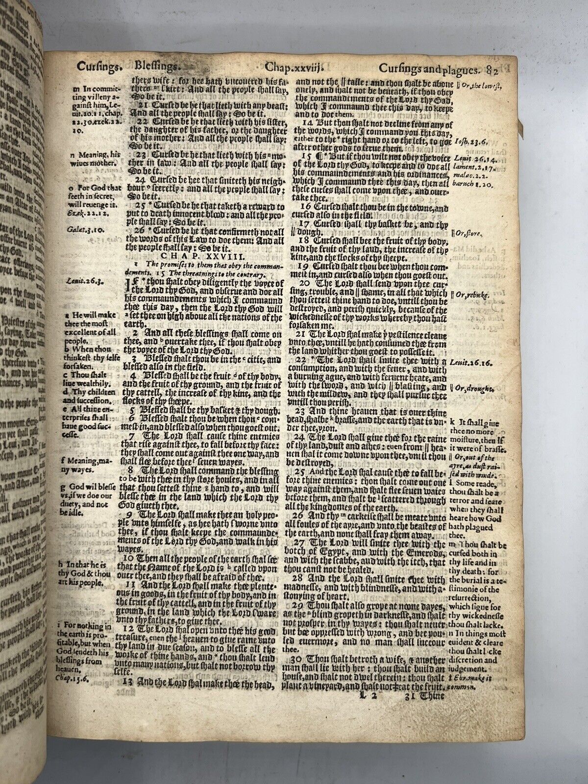 Rebound full brown morocco with a gilt title in a compartment to the spine between raised bands; rebound in 1970 as detailed under provenance, above. Both boards securely attached with reinforced hinges from the endpapers being replaced, retaining one original blank to the front with the corresponding provenance information. Binding lightly rubbed with some stains, and the rear board darker than the front board and spine, but generally very attractive indeed! Light shelf and edge wear. Text block very clean with light edge toning and very sporadic and very minor foxing. Ink inscriptions to the verso of 2S2, 2Y6, 3I2-3, 3B5, the title page of the New Testament and its verso, the verso of *iii, 3Z9, both sides of the colophon leaf, F5 of the Tables, and the verso of L2 of the Tables. Occasional damp staining to the edges, ink stains in a few places, and occasional very minor wormholing mostly to blank spaces and across headers, more prominently to 3P1-3R2 and 3S6-3X6. Leaf numbering skips 388-389 through mispagination but there are no leaves lacking. Very small hole to the blank space of 3I1. Edge repair to the New Testament title page. Small tear to the edge of 3M1, affecting only a small amount of marginalia. Full edge repairs to 3M4 and 3M5. Small edge tear to 3P1. Leaf numbered 490 mis-numbered as 499. Edge repair from 3V1 to 3Y8, with some loss of text to 3Y8, and some edge tears. Ink marginalia to 3V3. Joint repair between L1 and L2 of the Tables. Lacking three leaves 3Y3-3Y6, as detailed in the collation above else collates as complete including both original title pages.