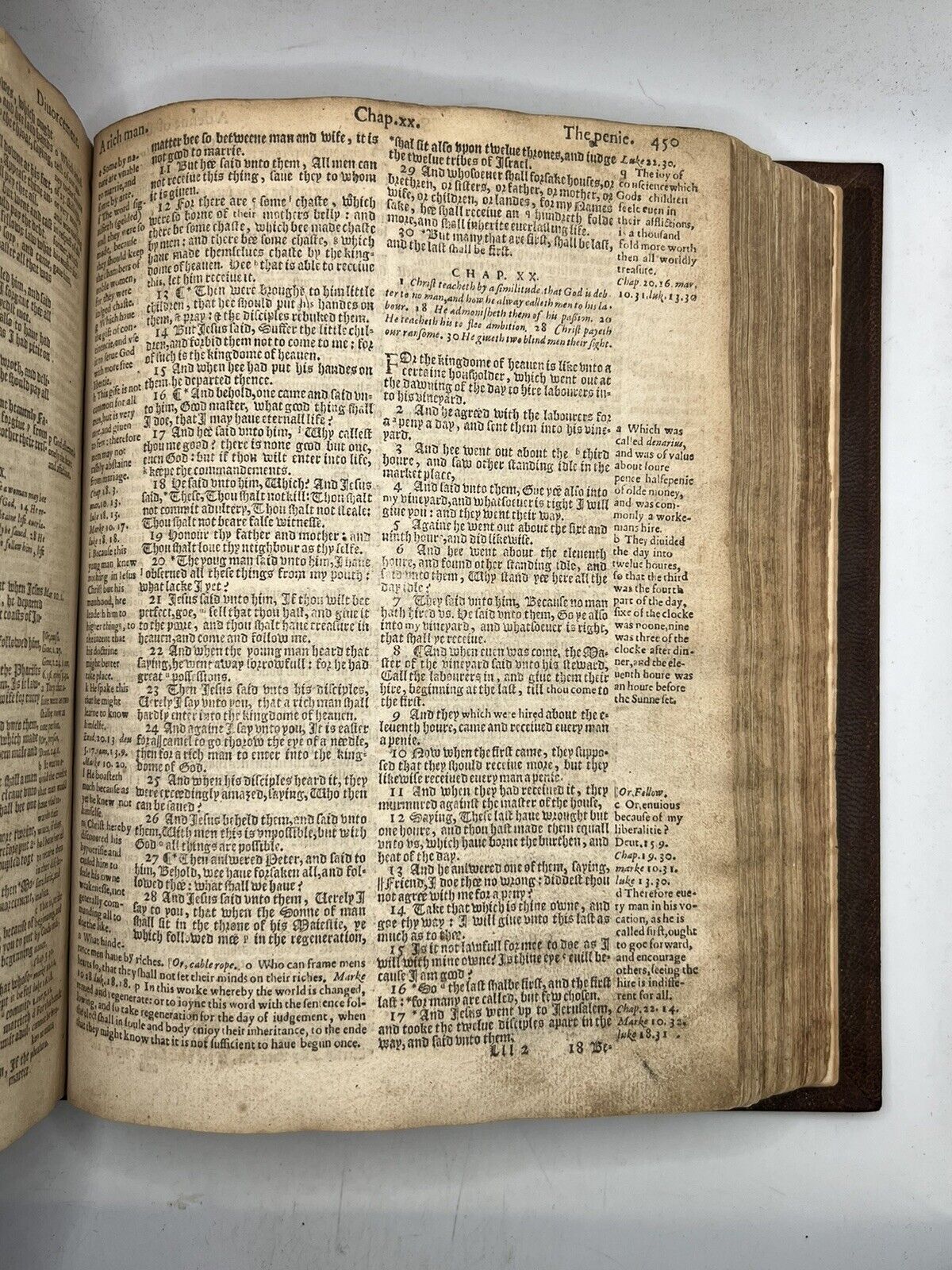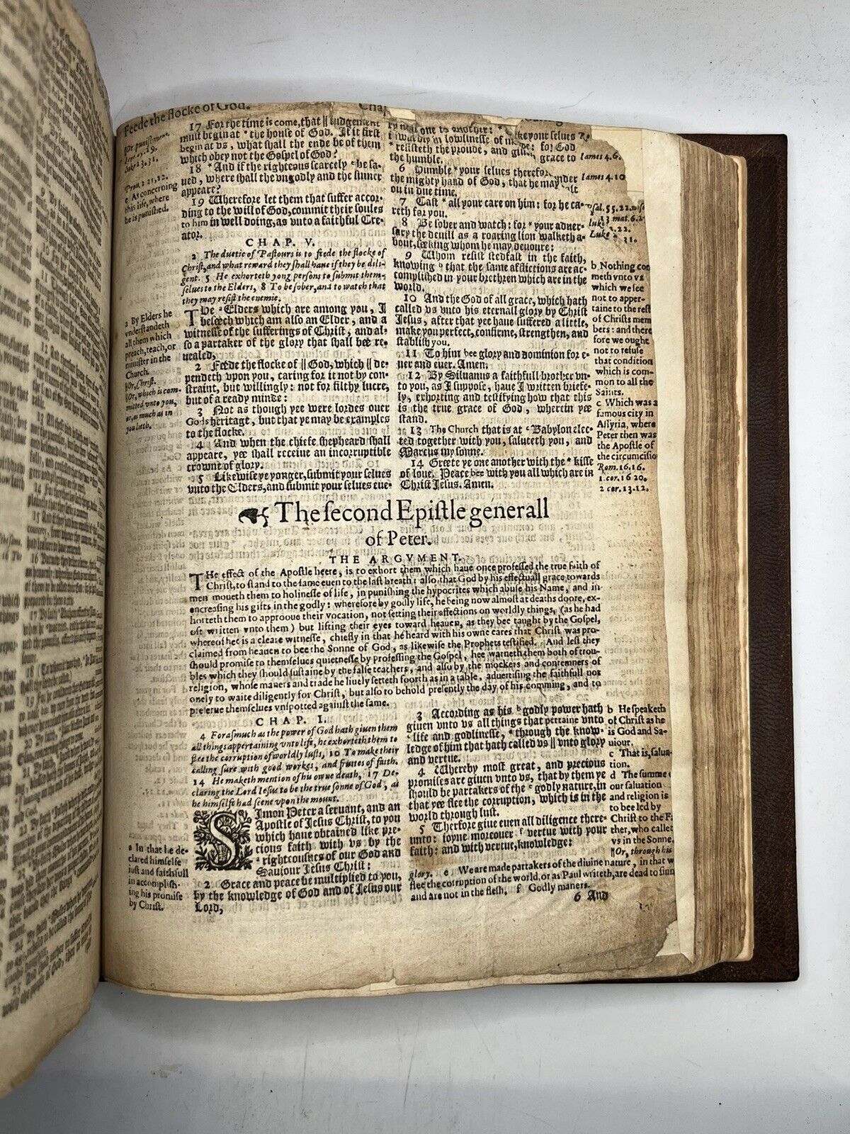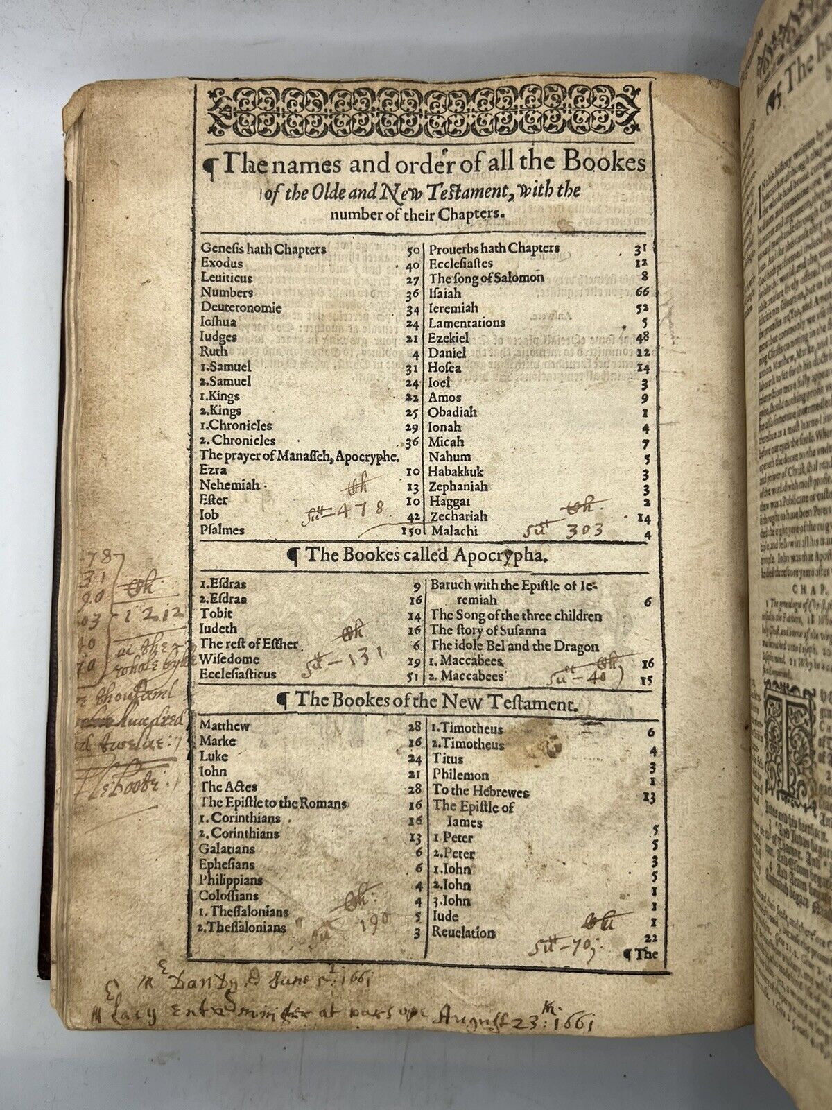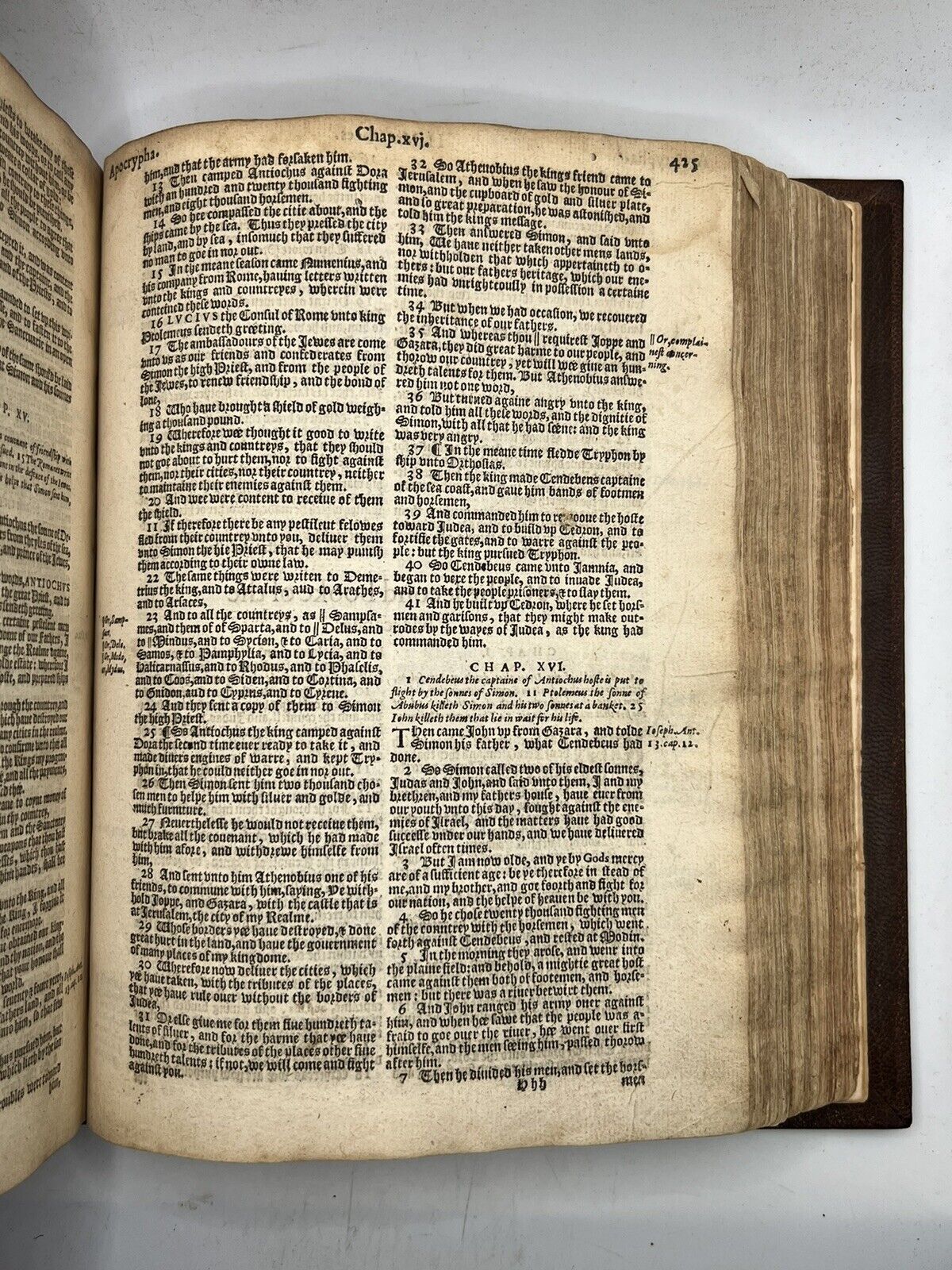 Rebound full brown morocco with a gilt title in a compartment to the spine between raised bands; rebound in 1970 as detailed under provenance, above. Both boards securely attached with reinforced hinges from the endpapers being replaced, retaining one original blank to the front with the corresponding provenance information. Binding lightly rubbed with some stains, and the rear board darker than the front board and spine, but generally very attractive indeed! Light shelf and edge wear. Text block very clean with light edge toning and very sporadic and very minor foxing. Ink inscriptions to the verso of 2S2, 2Y6, 3I2-3, 3B5, the title page of the New Testament and its verso, the verso of *iii, 3Z9, both sides of the colophon leaf, F5 of the Tables, and the verso of L2 of the Tables. Occasional damp staining to the edges, ink stains in a few places, and occasional very minor wormholing mostly to blank spaces and across headers, more prominently to 3P1-3R2 and 3S6-3X6. Leaf numbering skips 388-389 through mispagination but there are no leaves lacking. Very small hole to the blank space of 3I1. Edge repair to the New Testament title page. Small tear to the edge of 3M1, affecting only a small amount of marginalia. Full edge repairs to 3M4 and 3M5. Small edge tear to 3P1. Leaf numbered 490 mis-numbered as 499. Edge repair from 3V1 to 3Y8, with some loss of text to 3Y8, and some edge tears. Ink marginalia to 3V3. Joint repair between L1 and L2 of the Tables. Lacking three leaves 3Y3-3Y6, as detailed in the collation above else collates as complete including both original title pages.
