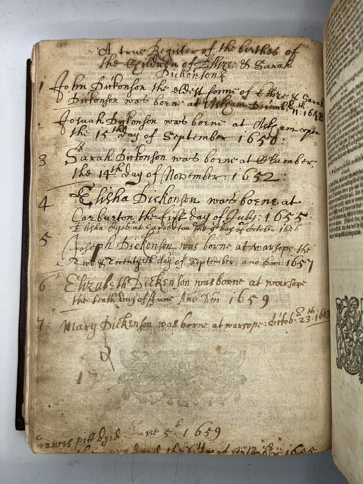 "A ? Register of the births of the births of the ? of Ellize, & Sarah Dickonsons. 1. John Dickonson the will form of ? of Sarah Dickonson was born at ? Deremb: 8th 11: 1648. 2. Josuah Dickonson was born at ? ? the 15th day of September 1650. 3. Sarah Dickonson was born at ? the 14th day of November 1652. 4. Elisha Dickonson was born at Carburton the fifth day of July 1655. Elisha died at Carburton the 9th day of ? 1665. 5. Joseph Dickonson was born at ? the 2nd & ? day of September ano dom 1657. 6. Elizabeth Dickenson sib was born at ? the fourth day of ? Ano ? 1659. 7. Mary Dickenson was born at ? ? ? 23 th 1663."
