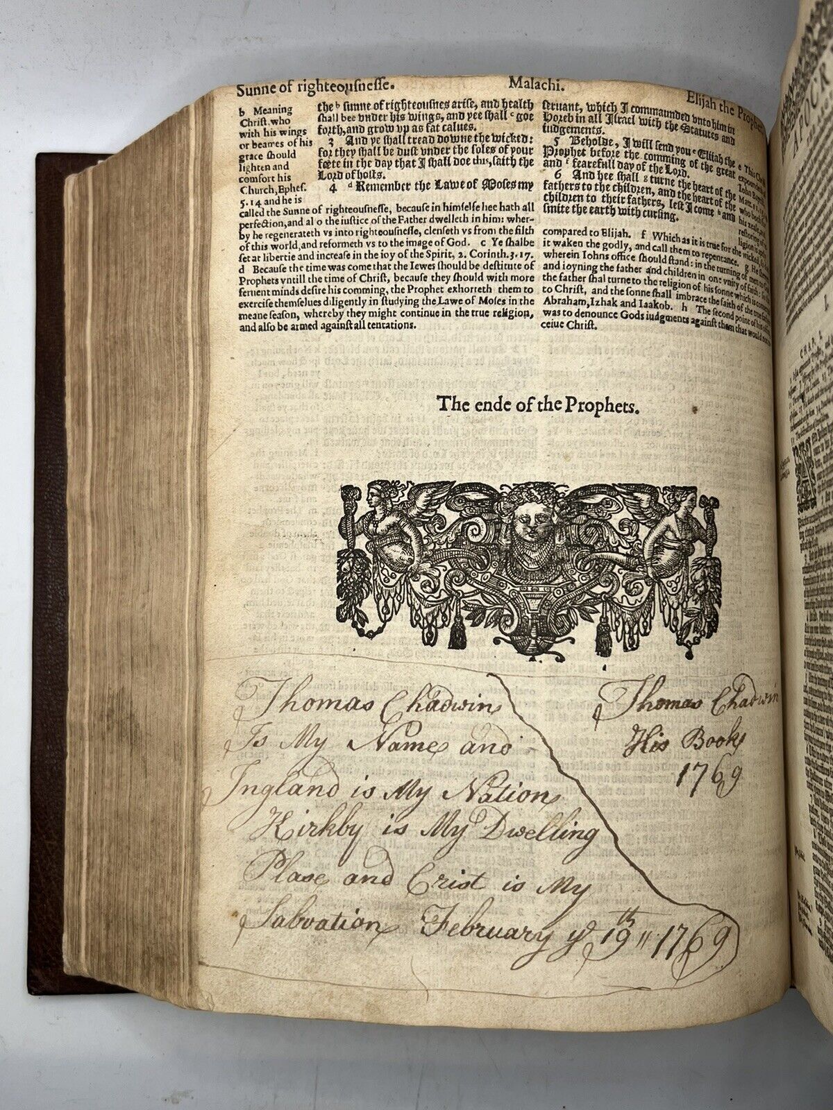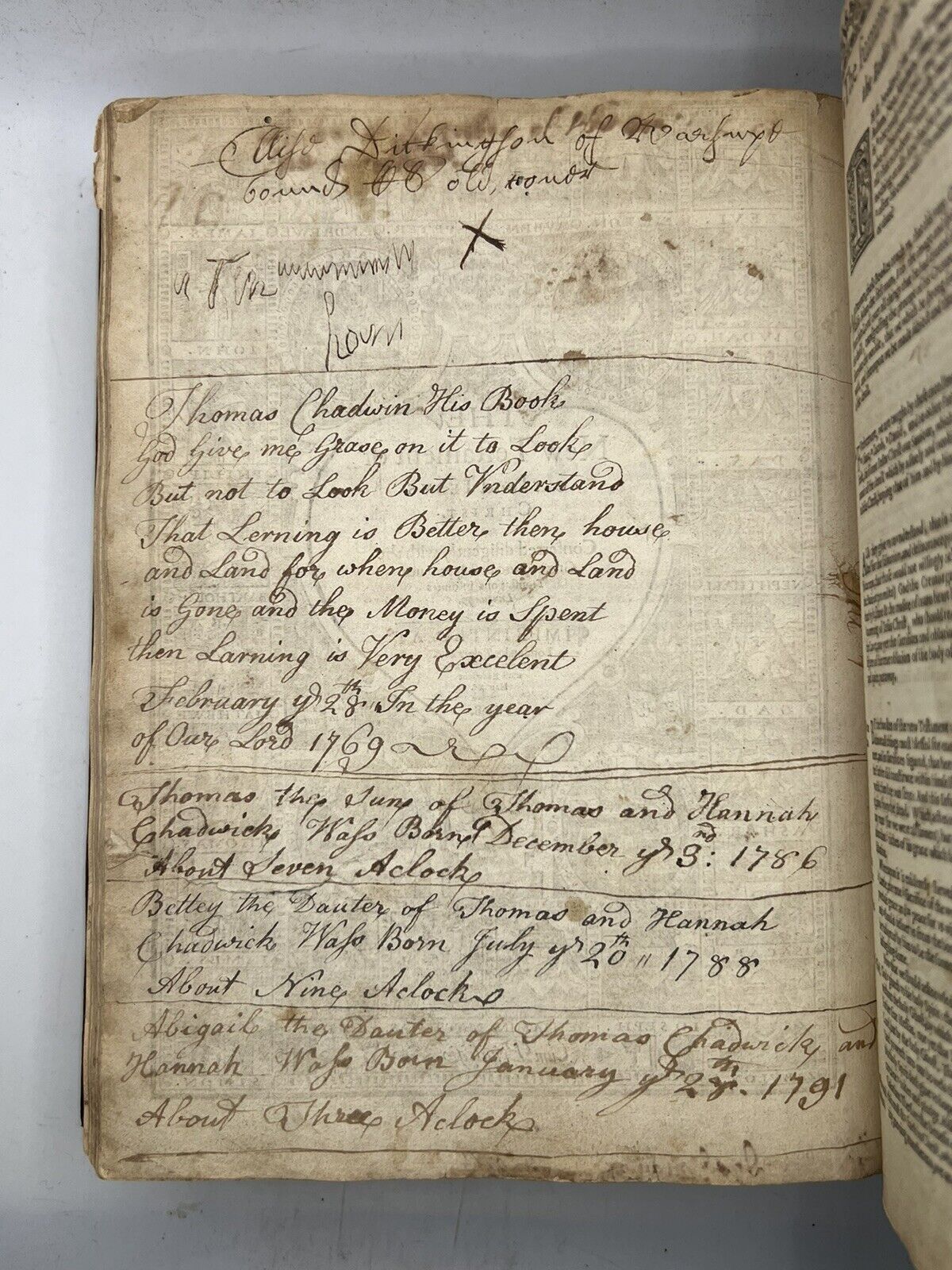 The ownership inscription reading "Thomas Chadwin His Book 1769", as well an ink inscription reading "Thomas Chadwin is my name and England is my nation Kirby is my dwelling place and Crist is my Salvation February ye 19th II. 1769." The same inscription is found in other place in the text, without the date.