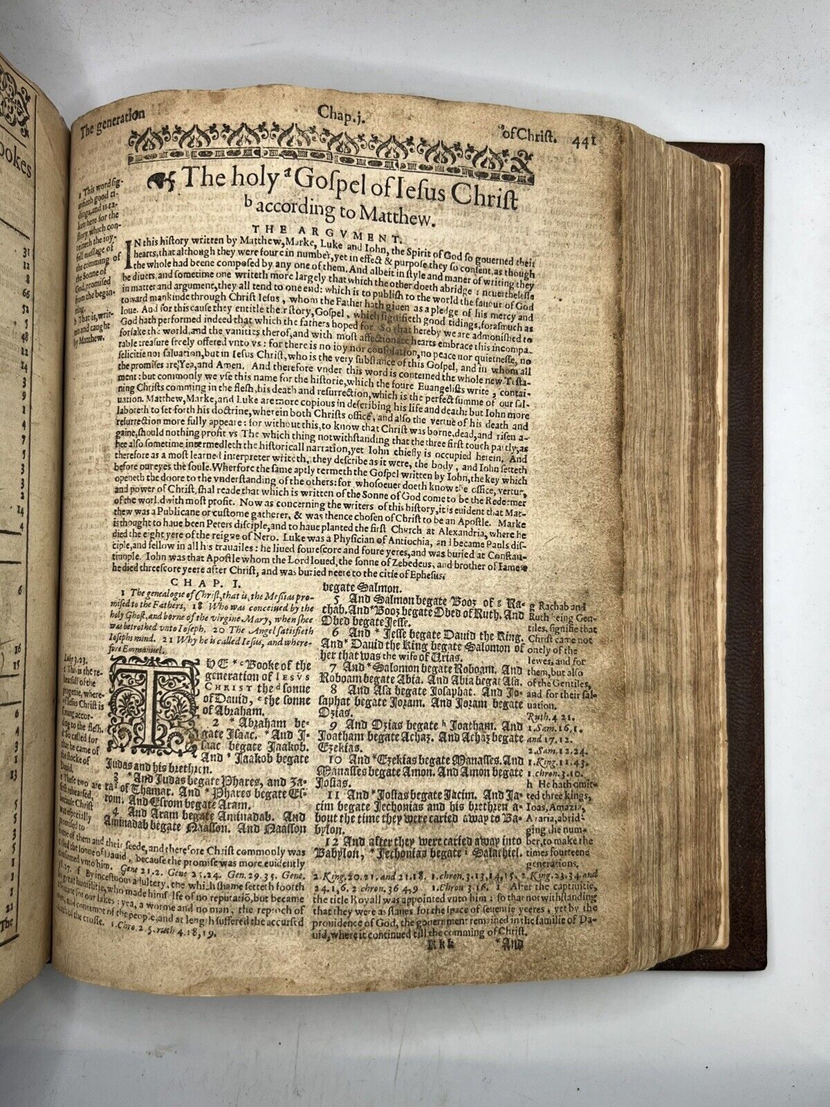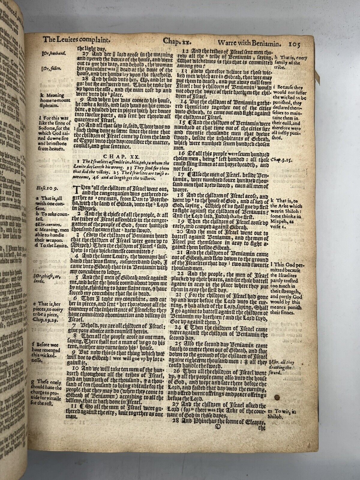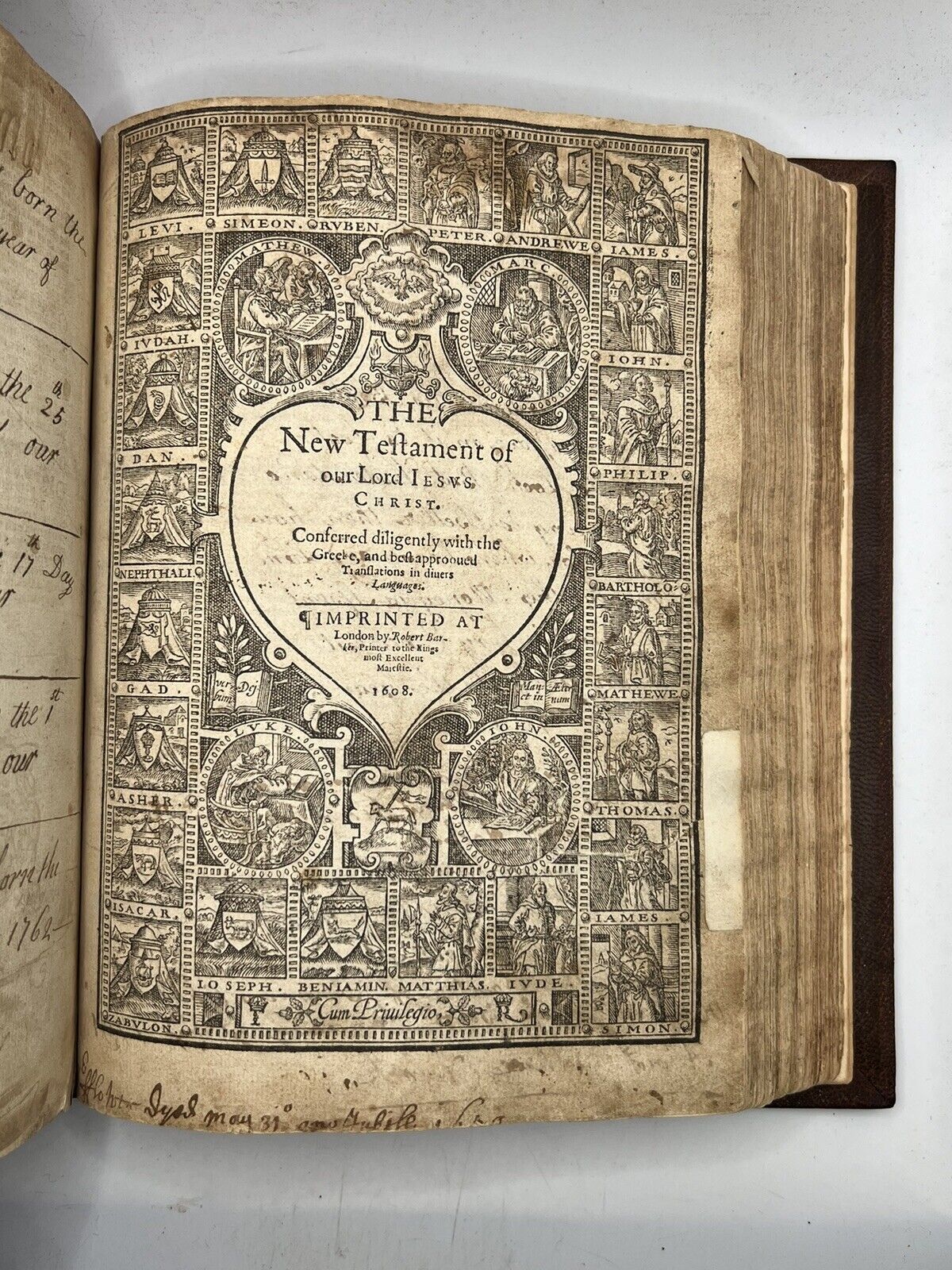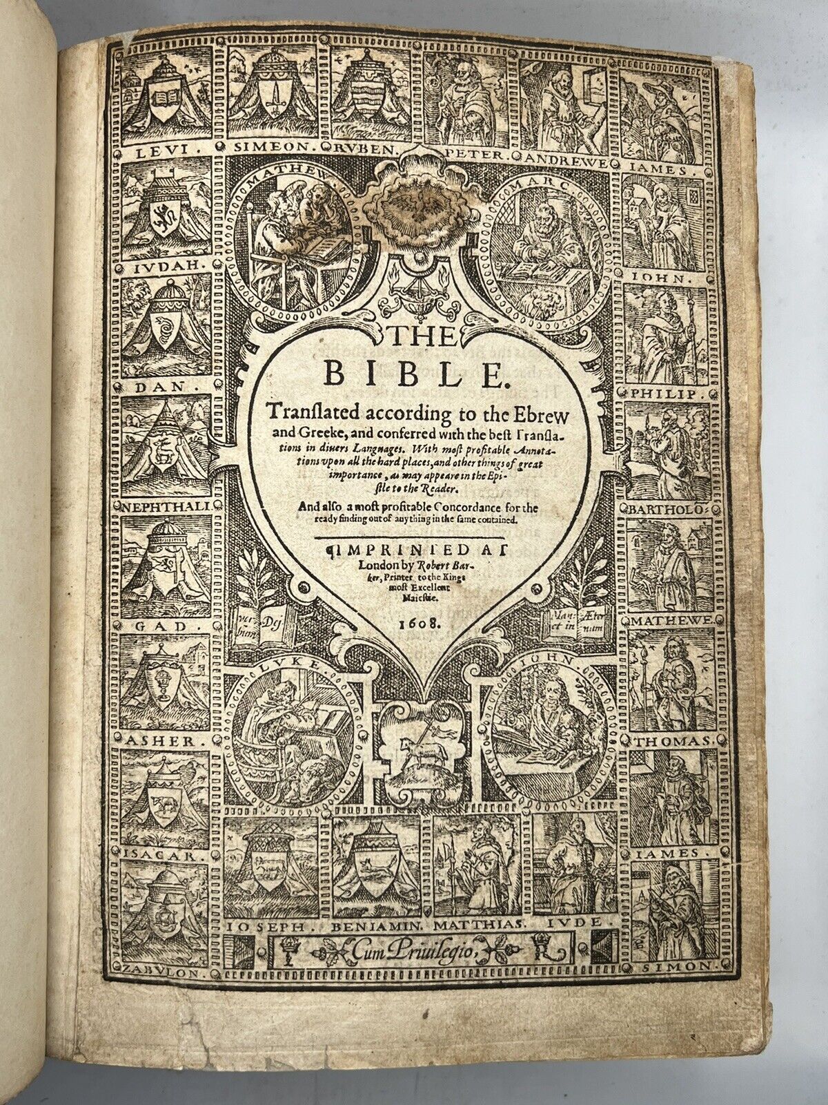 The Bible. Translated According to the Ebrew and Greeke, and Conferred with the Best Translations in Divers Languages. With Most Profitable Annotations Upon All the Hard Places, and Other Things of Great Importance, as May Appeare in the Epistle to the Reader. And Also a Most Profitable Concordance for the Ready Finding Out of Anything in the Same Contained. Imprinted at London by Robert Barker, Printer to the Kings Most Excellent Maiestie. 1608.