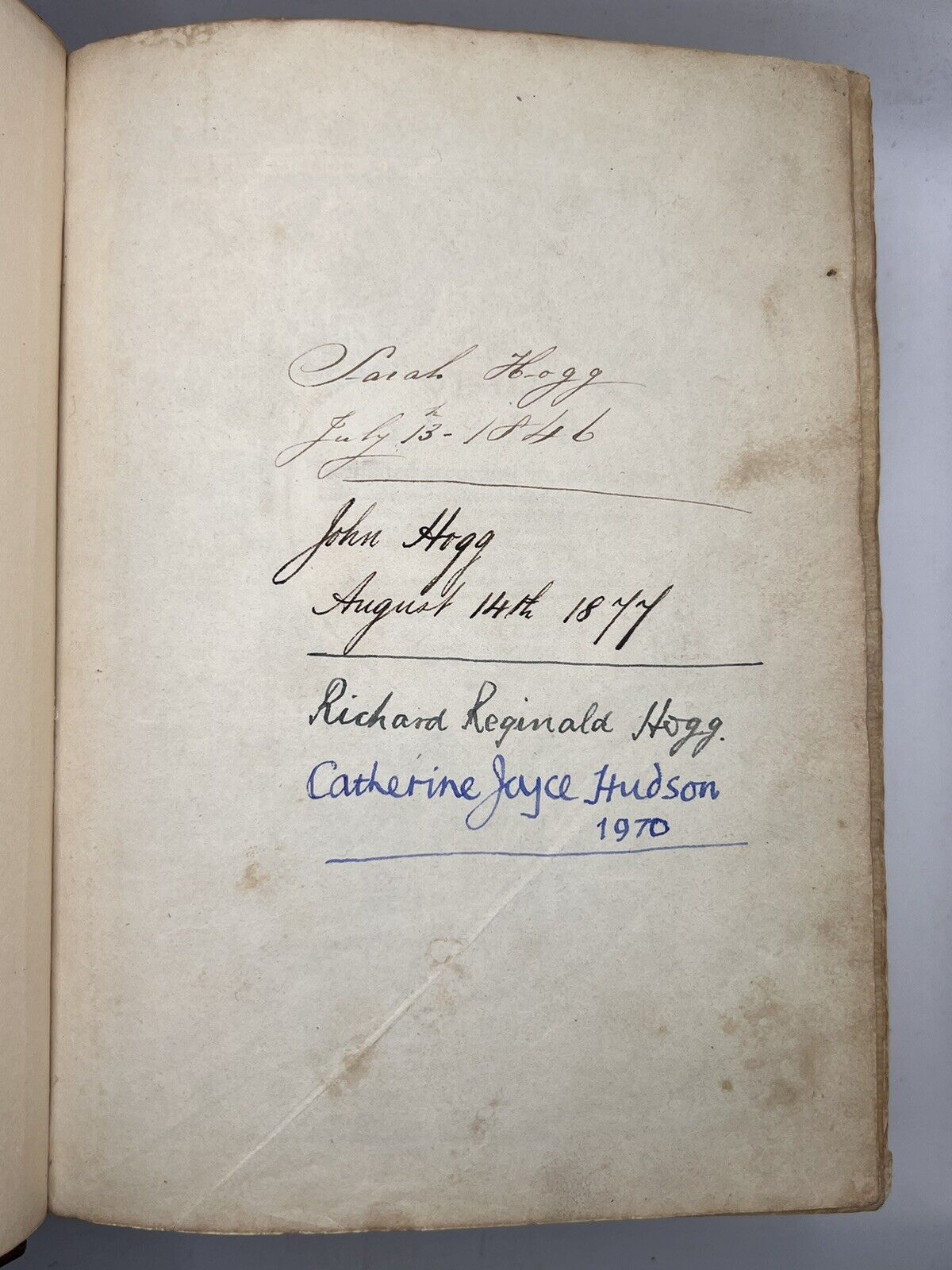 Ink ownership inscriptions reading "Sarah Hogg July 13th 1846", "John Hogg August 14th 1877", "Richard Reginald Hogg", and "Catherine Joyce Hudson 1970".