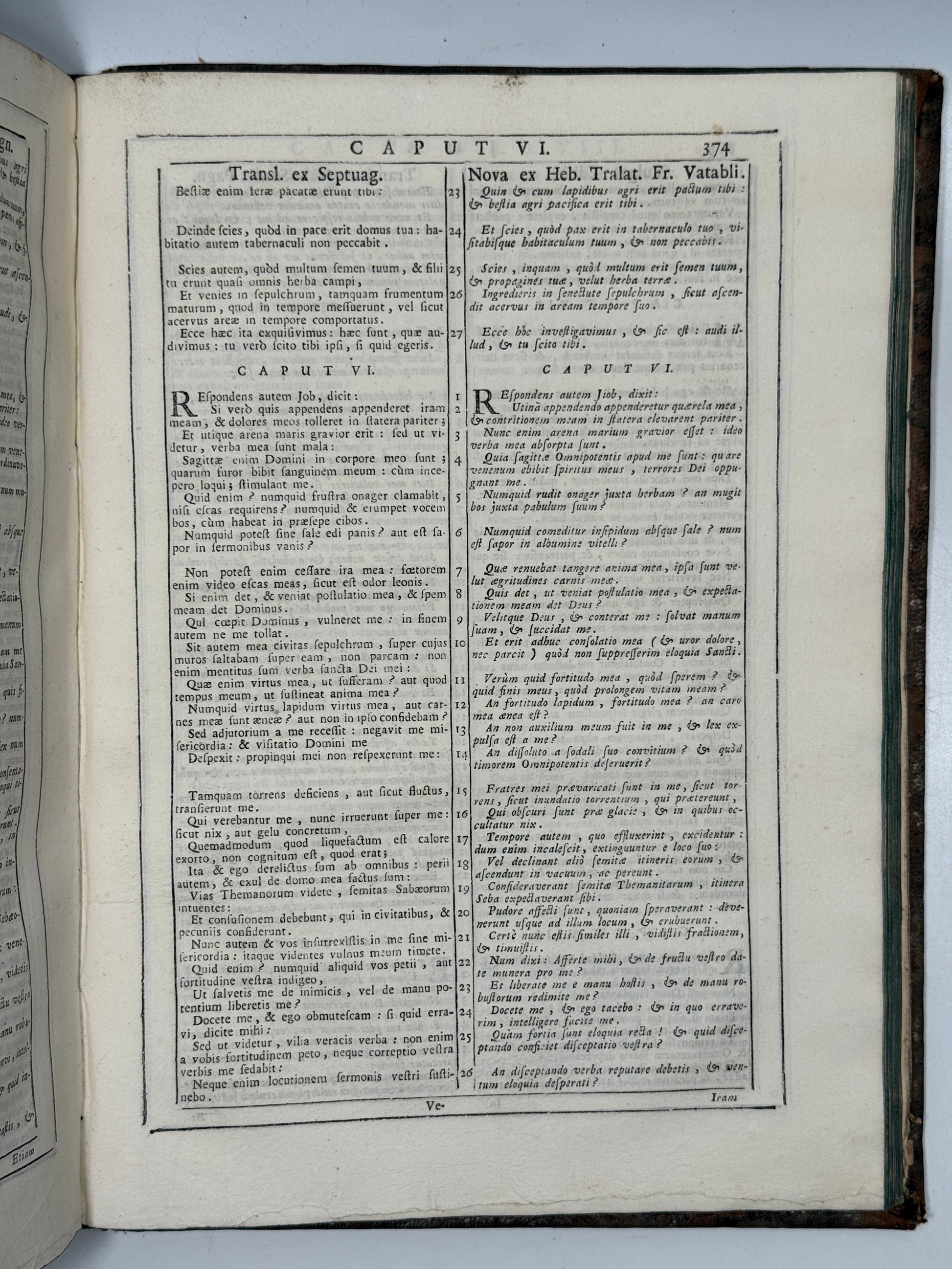 Sacra Biblia Variarum Translationum Complectens Praeter Vulgatam, Sanctis Pagnini Ex Hebraeo, Septuaginta Interpretum, & Alteram Ex Hebraeo Francisci Vatabli Versiones; Insuper Ubi Deerant Aliquae Ex Supradictis Versionibus, Additae Sunt Nunc Chaldaica & Arabica, Nunc Vero Syriaca & Arabica Translationes, Quae In Antuerpiensi Desiderantur. Venetiis, MDCCXLVII. Typis Nicolai Pezzana. Superiorum Permissu, Ac Privilegio.