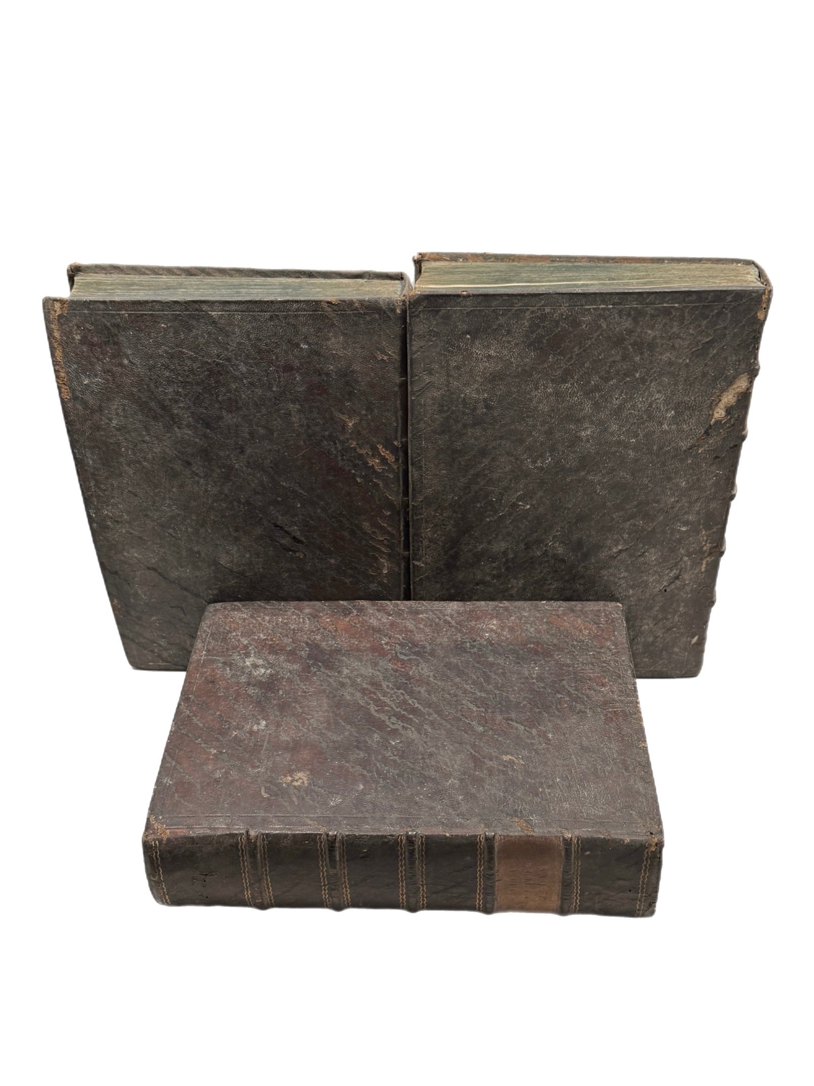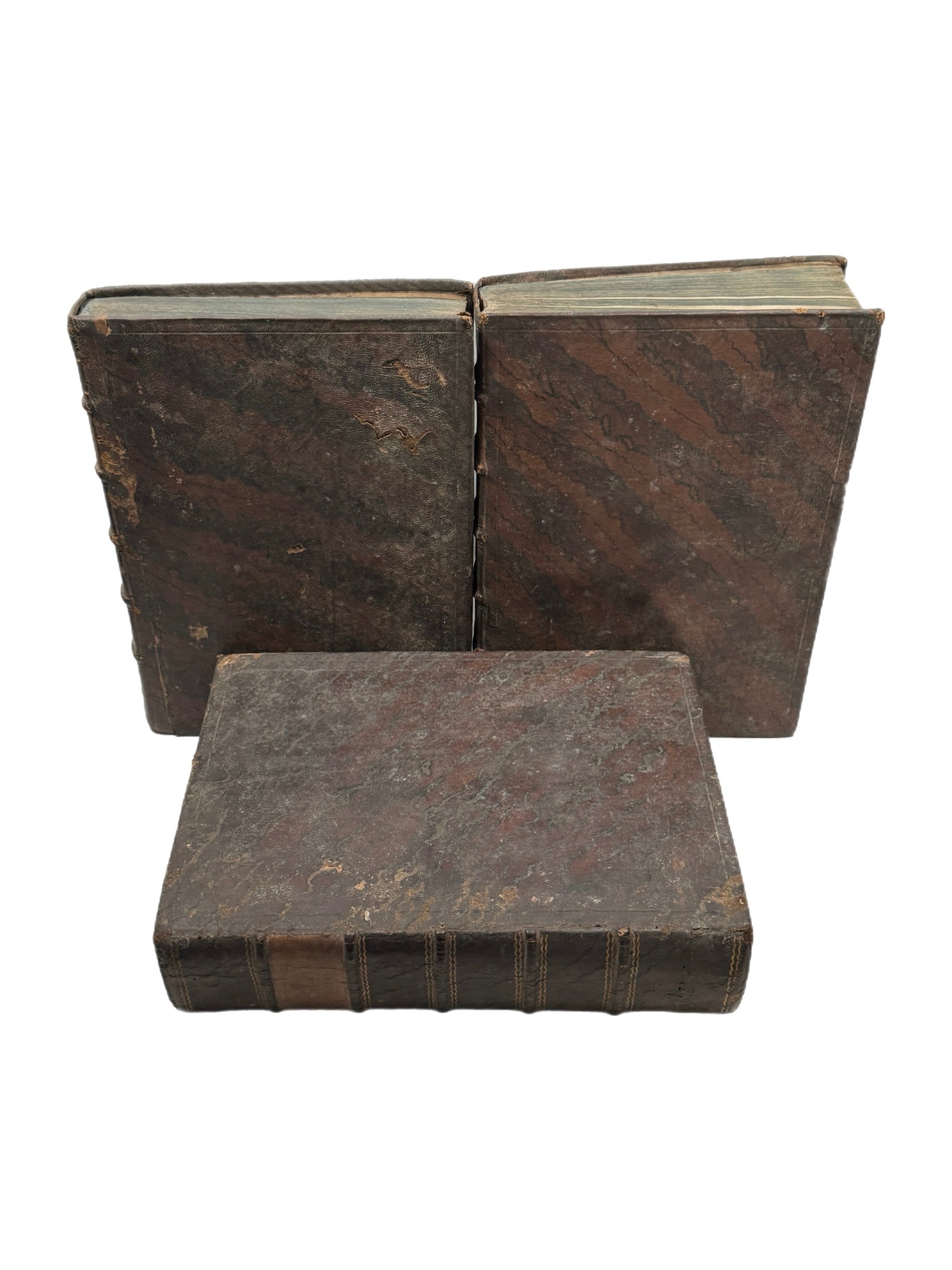 Full brown calf bindings, rubbed and scuffed, and with some wormholing. Lacking tooled labels. All boards attached with rubbing along joints, some joint and hinges starting. Text block detached from the spine of volume two, rear board attached to the backstrip. Shelf and edge wear. Blue page edges dulled. Text block very clean with light toning and occasional foxing. Small number of stamps from the Holy Cross Abbey in a few places in each volume. Pastedowns partially detached. Edge toning to endpapers as commensurate with the full leather bindings. Minor wormholing to the top of the gutters from pp.276 to pp.320 in volume two. Uncollated.