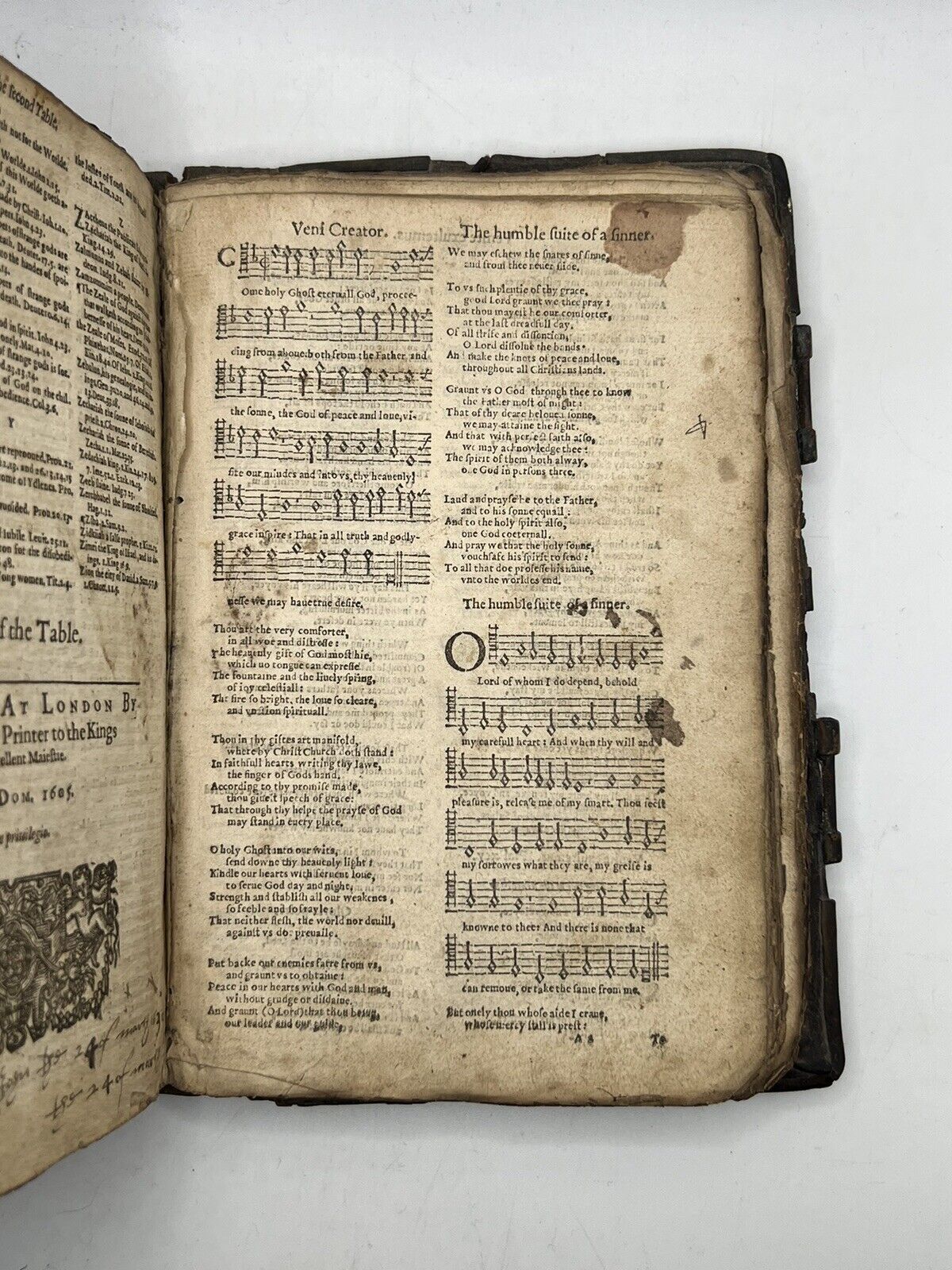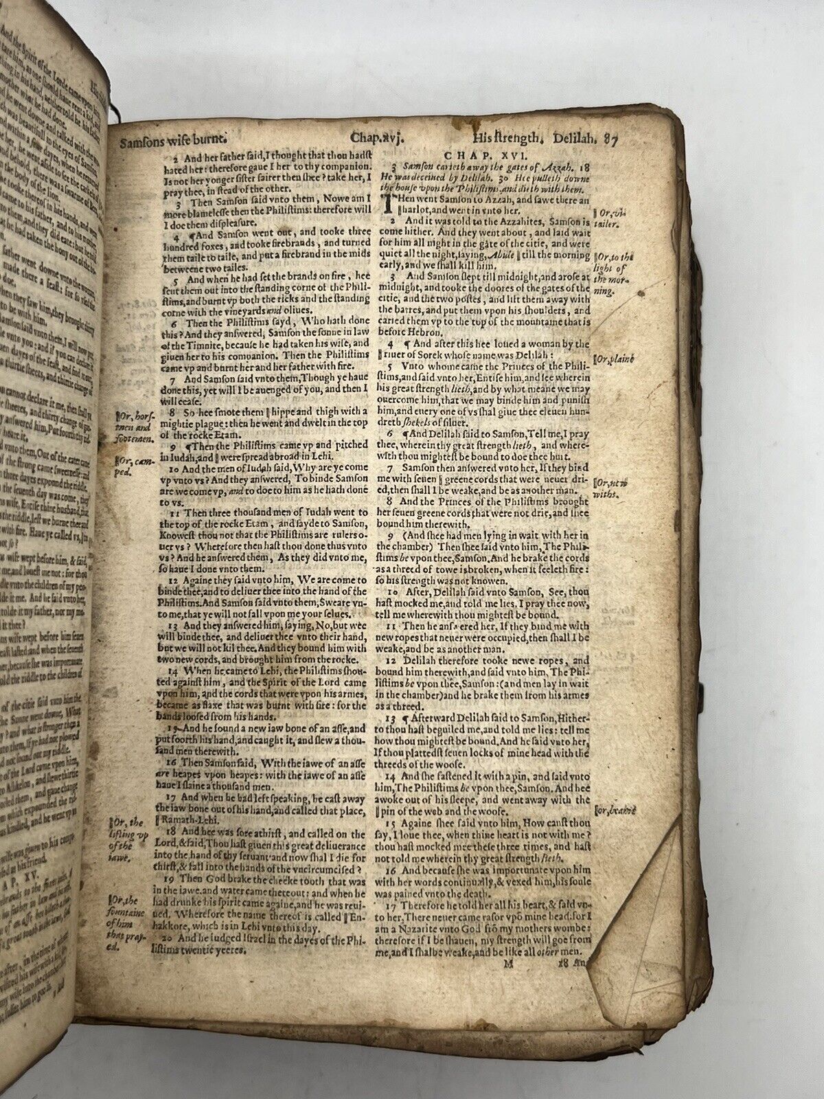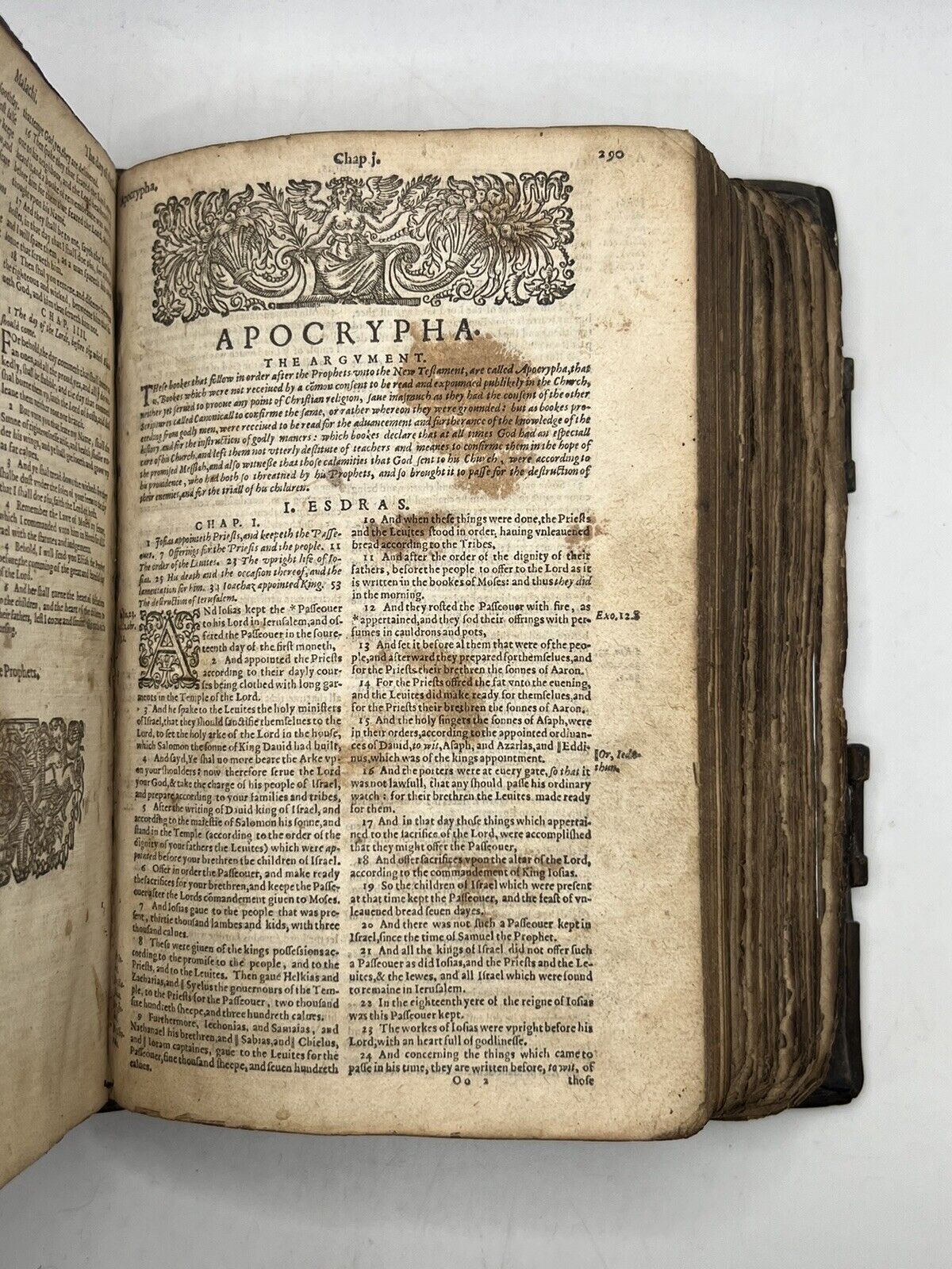 Lacks gatherings h-j, u-x, 2a (fo.55-70, 151-166, 183-190), lacks 3K4, a1 (first leaf of the Psalter at the rear). Lacks pp.39-58 of the Psalter and all after 88. Final Psalm in the Psalter is 139. Heavy staining to the three leaves 2k8-2o2 at the start of the apocrypha, not obscuring the legibility of the text. 2z1 present but torn, lacking approx. 3/4 of the leaf. 3a1 & 3c7 lacking a portion of the upper corner of the leaf, but largely complete. Very erratic pagination throughout as printed. Very early ownership inscription at final leaf of the second table (3M8) dated 1630. Sporadic toning/dampstaining in places, many leaves with marginal losses but mostly not losing any text. Some leaves/gatherings are partially loose in the binding.
