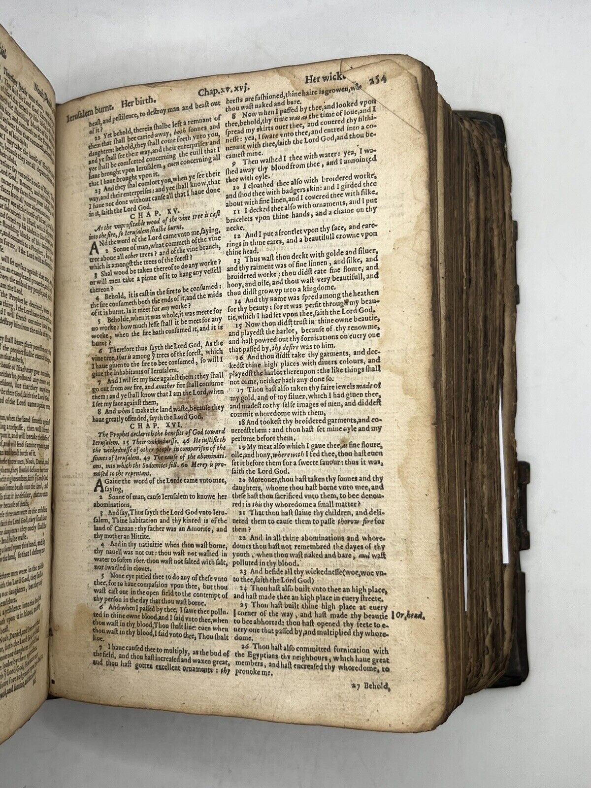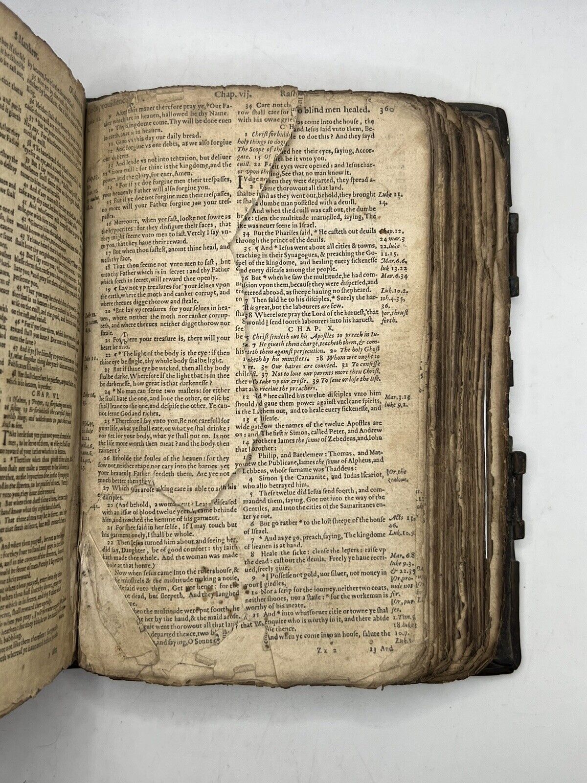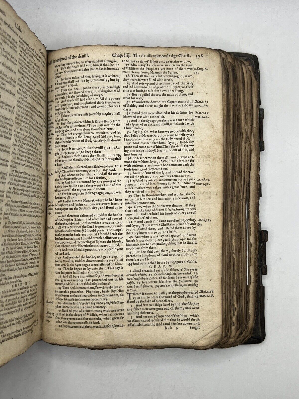 Lacks gatherings h-j, u-x, 2a (fo.55-70, 151-166, 183-190), lacks 3K4, a1 (first leaf of the Psalter at the rear). Lacks pp.39-58 of the Psalter and all after 88. Final Psalm in the Psalter is 139. Heavy staining to the three leaves 2k8-2o2 at the start of the apocrypha, not obscuring the legibility of the text. 2z1 present but torn, lacking approx. 3/4 of the leaf. 3a1 & 3c7 lacking a portion of the upper corner of the leaf, but largely complete. Very erratic pagination throughout as printed. Very early ownership inscription at final leaf of the second table (3M8) dated 1630. Sporadic toning/dampstaining in places, many leaves with marginal losses but mostly not losing any text. Some leaves/gatherings are partially loose in the binding.
