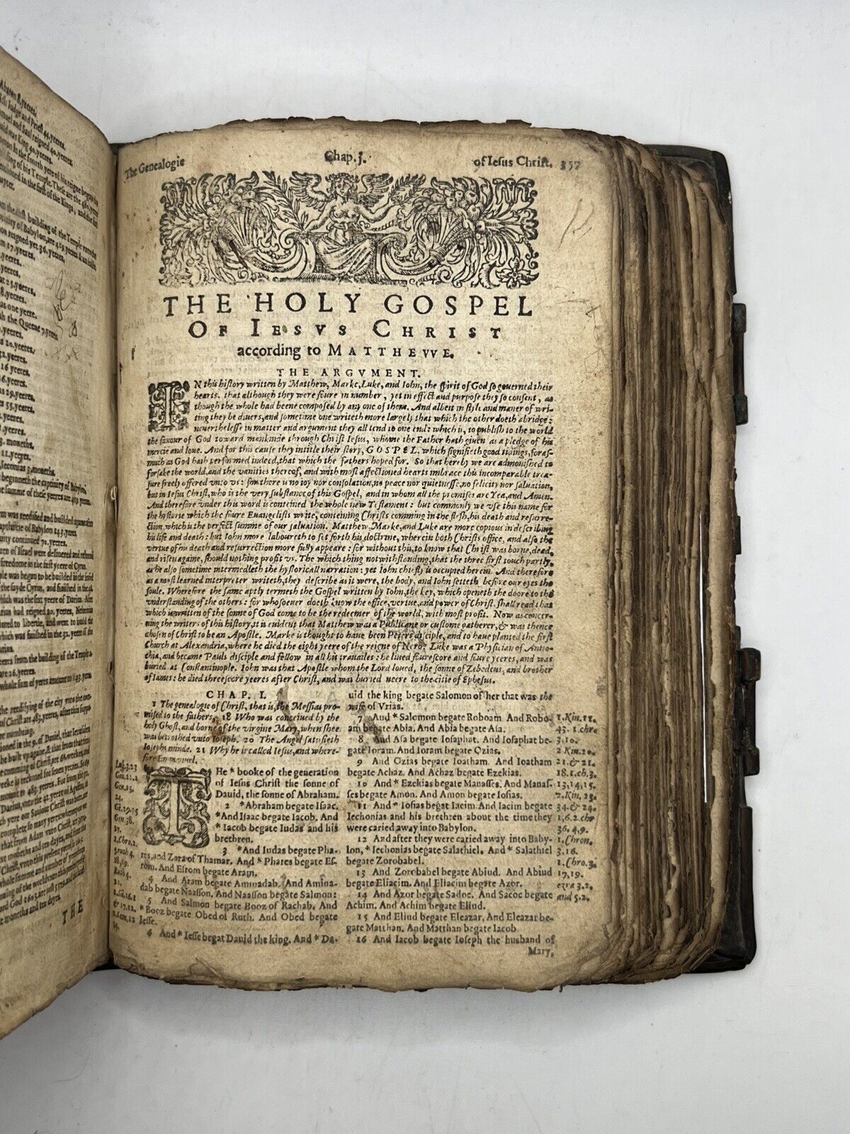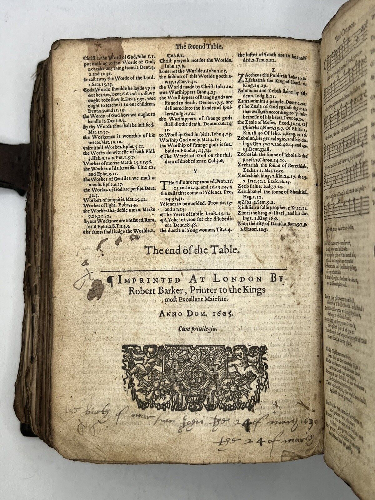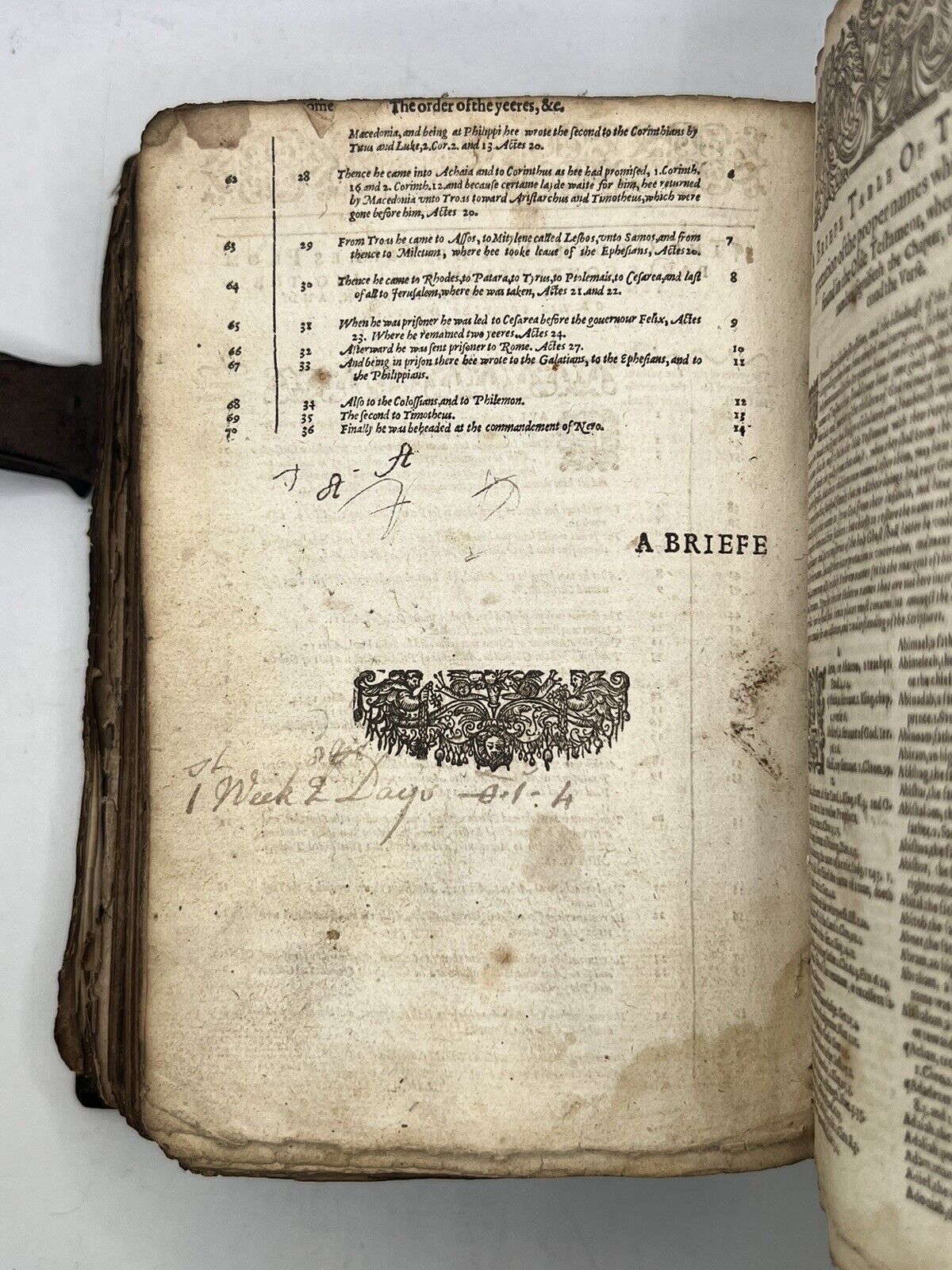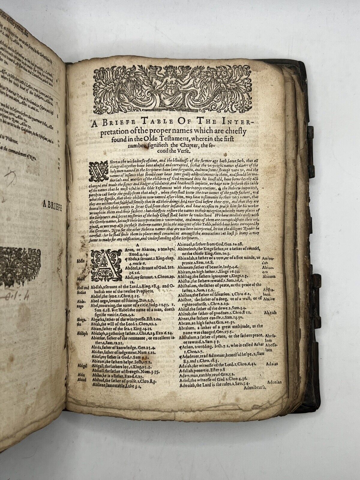 A very rare original 1605 "Breeches" Geneva Bible, so named for the reading in Genesis 3:7 describing Adam and Eve as having made "breeches" to cover their nakedness instead of "aprons" or "loincloths".