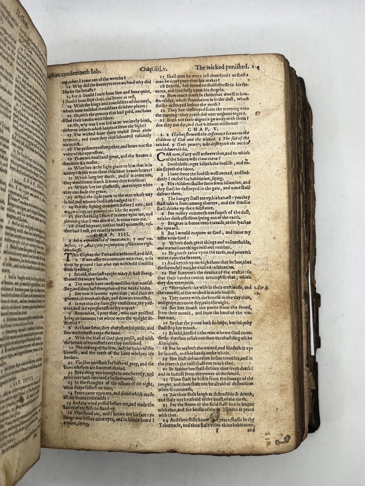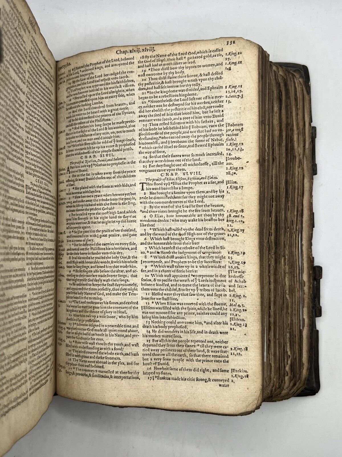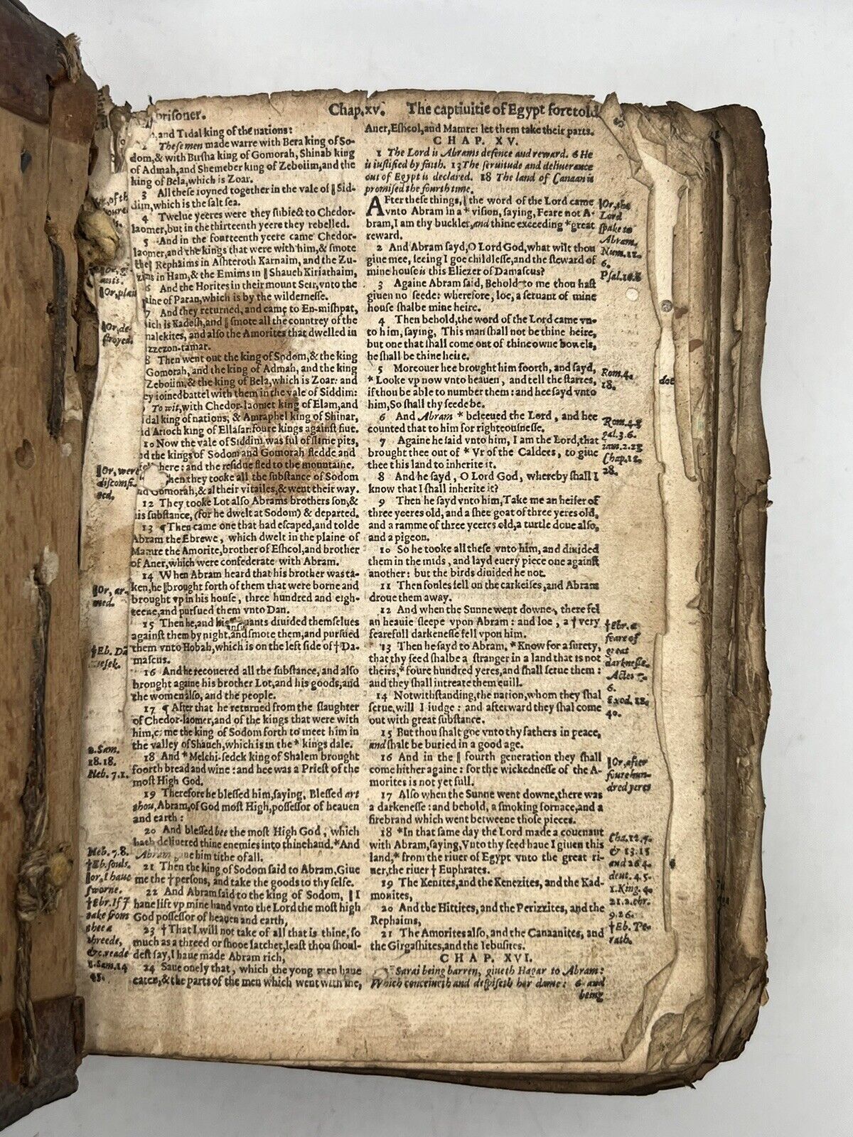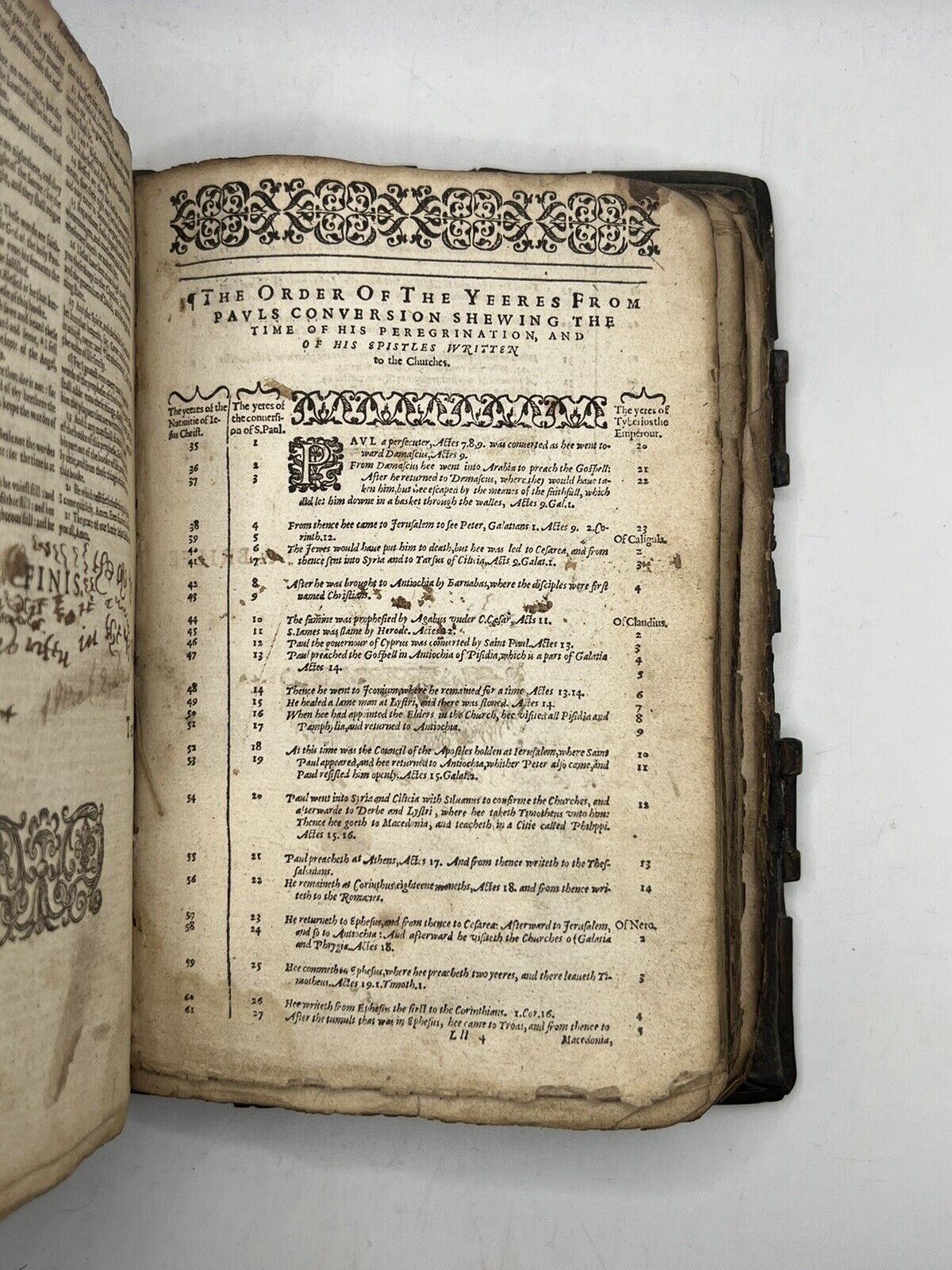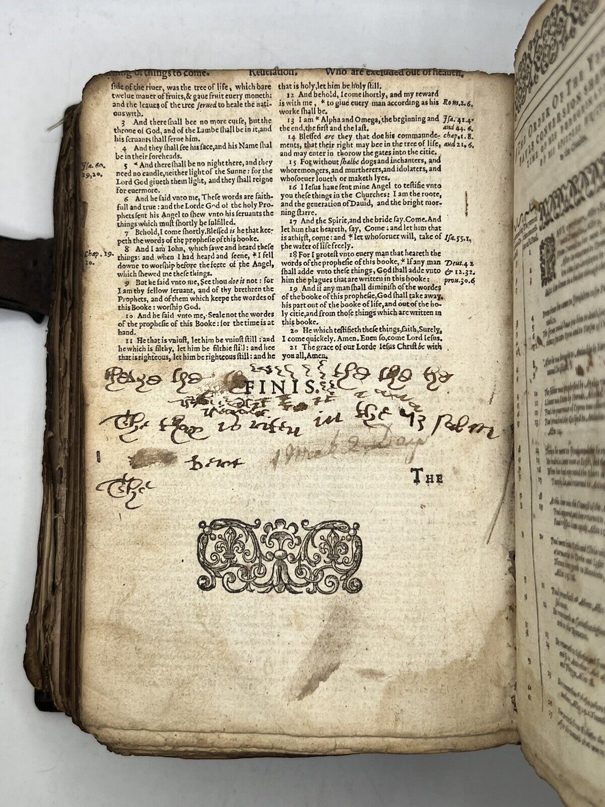 A very rare original 1605 "Breeches" Geneva Bible, so named for the reading in Genesis 3:7 describing Adam and Eve as having made "breeches" to cover their nakedness instead of "aprons" or "loincloths".