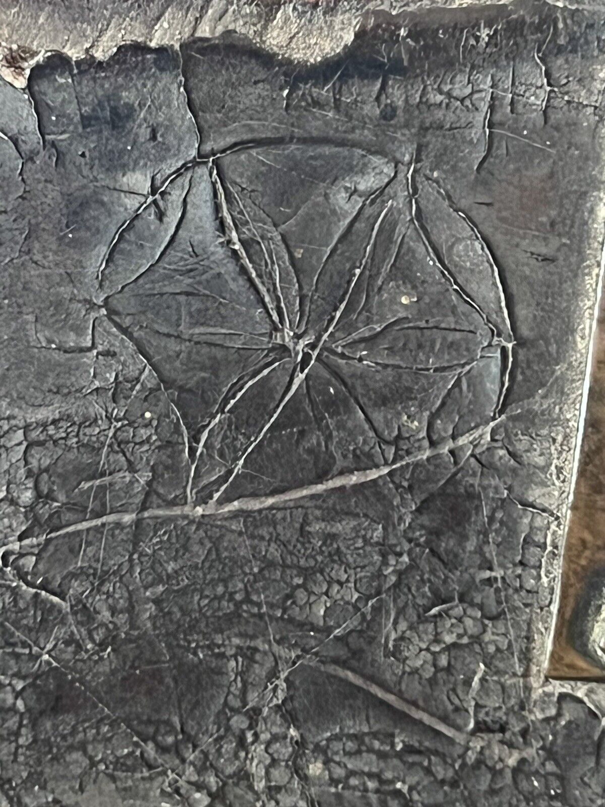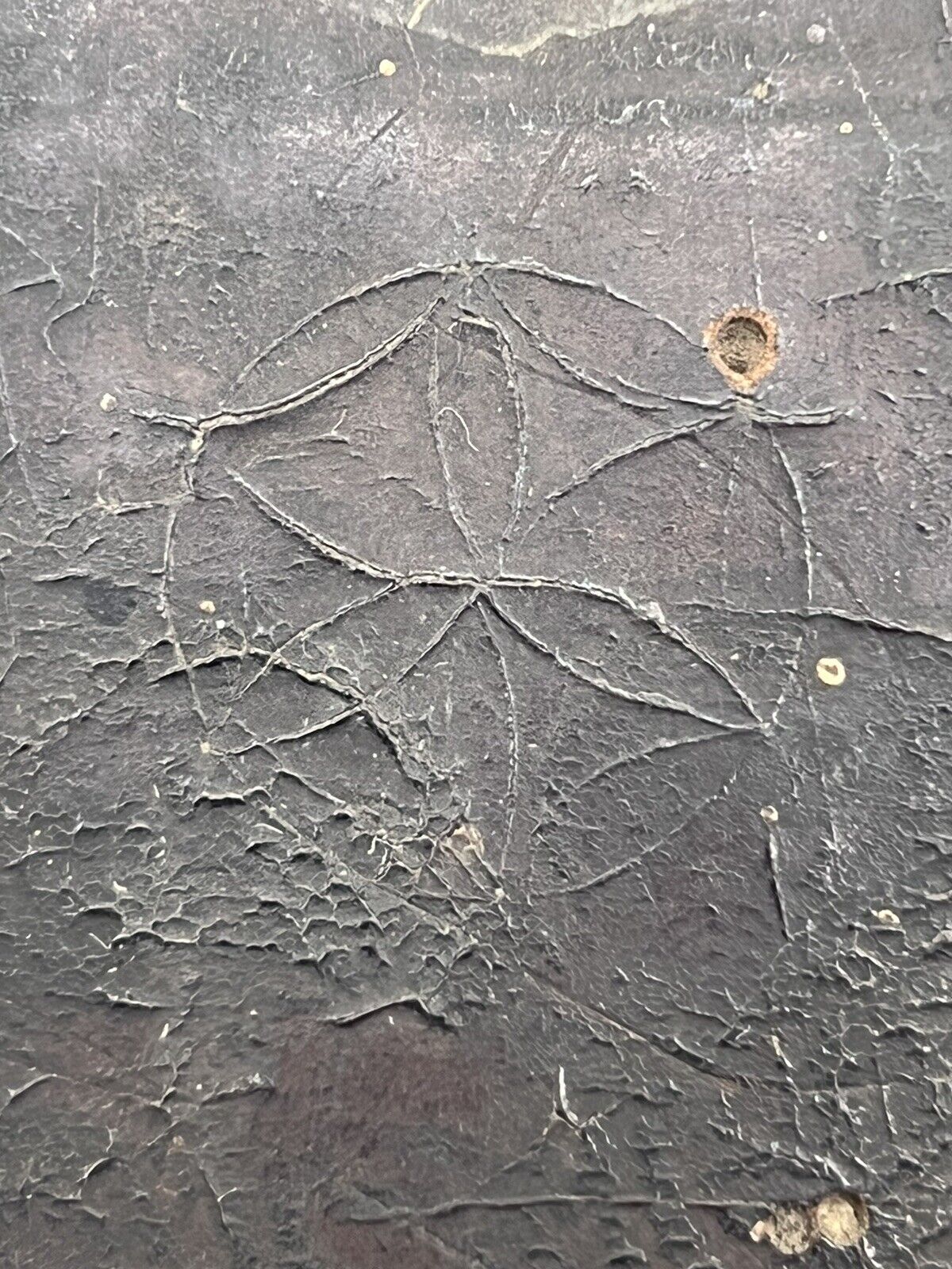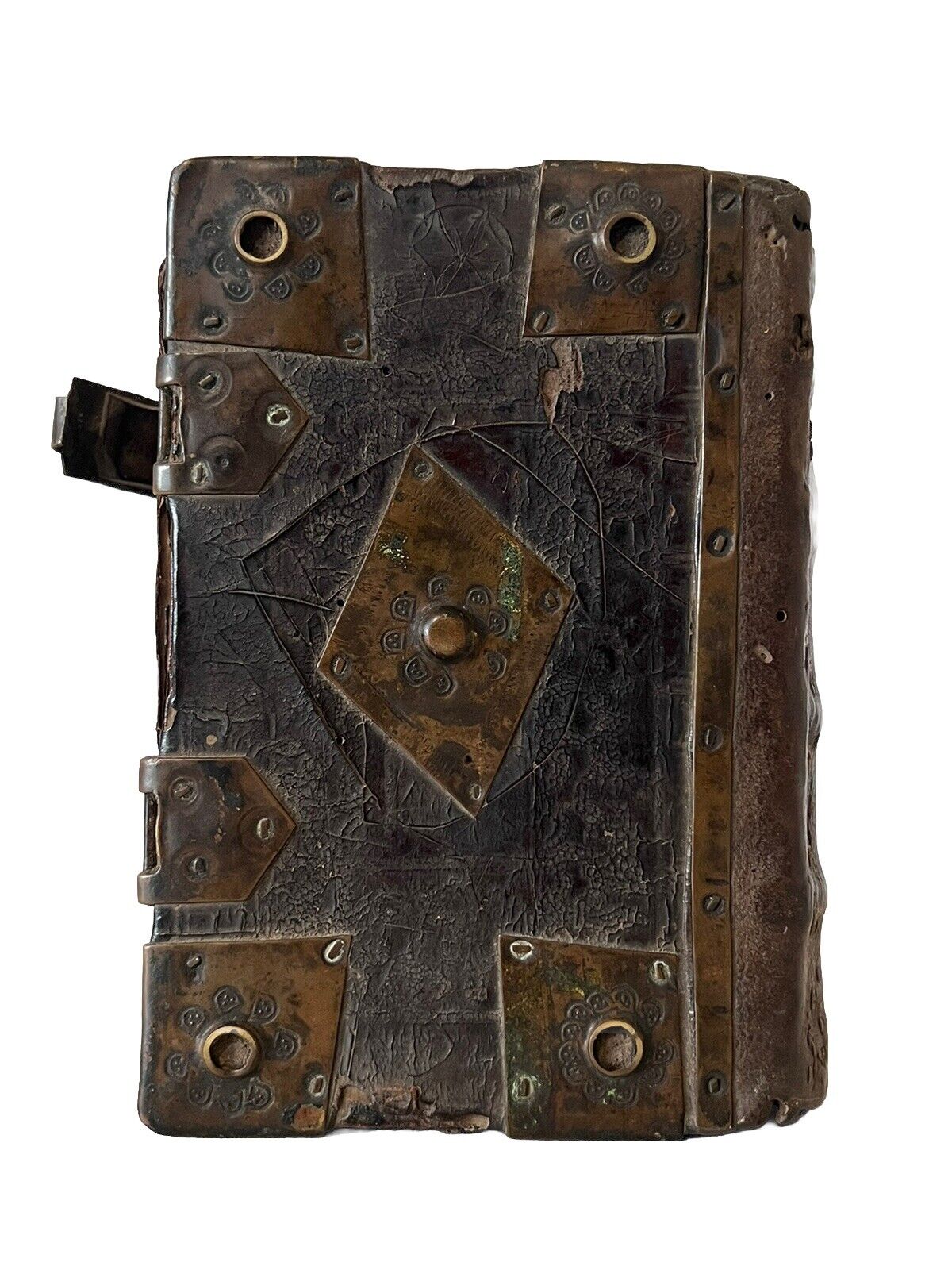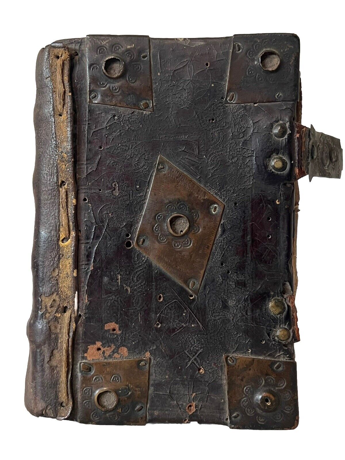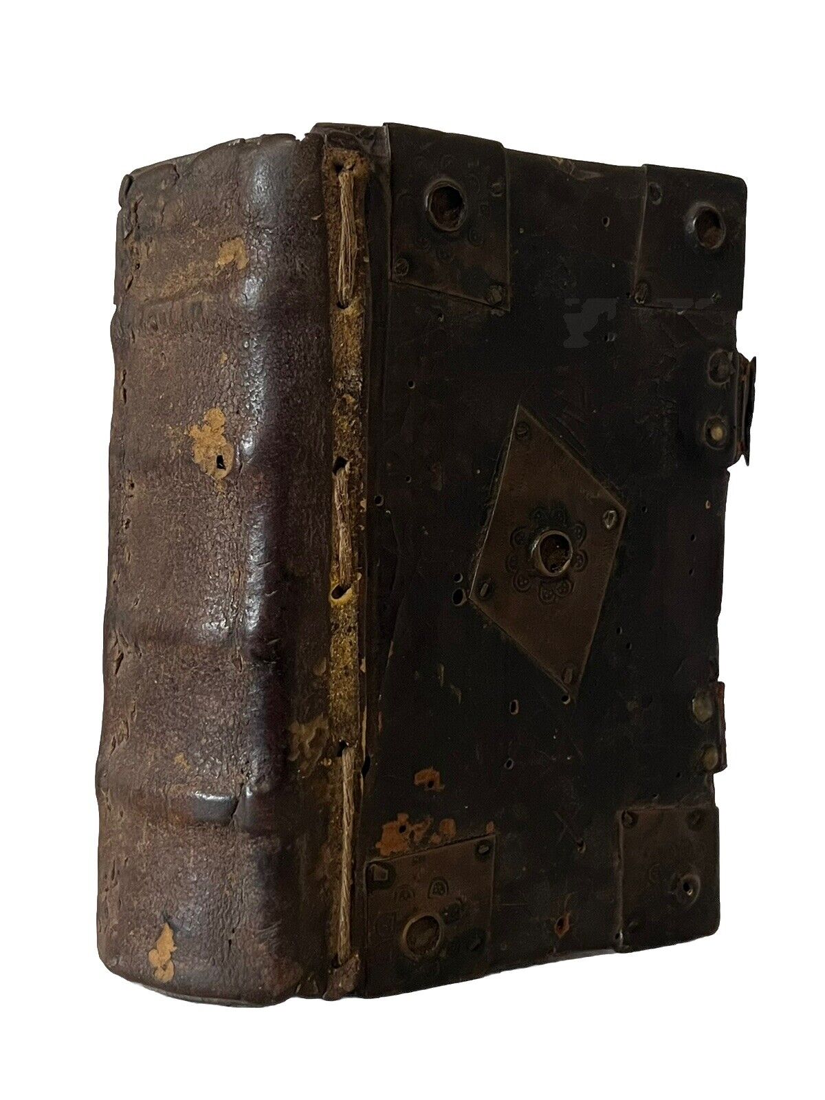 Contemporary full calf binding with contemporary metalwork laid on to the boards. The binding appears to have been rebacked but it is our opinion that this is not a rebacking but is rather the original design of the binding, especially as the leather covering the spine is backed with the contemporary metalwork and the aging is consistent with the rest of the binding, thus it is our opinion that the binding is original to the book and therefore rather remarkable indeed. One clasp is retained and remains functional, the other is now lacking. The remaining clasp is leather overlaid with metalwork which has been engraved as with the rest of the metalwork. Some scratches to the leather of the boards, seemingly intentional (and contemporary), certainly with a magical protective purpose, especially the hexafoil variant rune to the head of both boards, used as a protective rune against witchcraft and evil spirits.