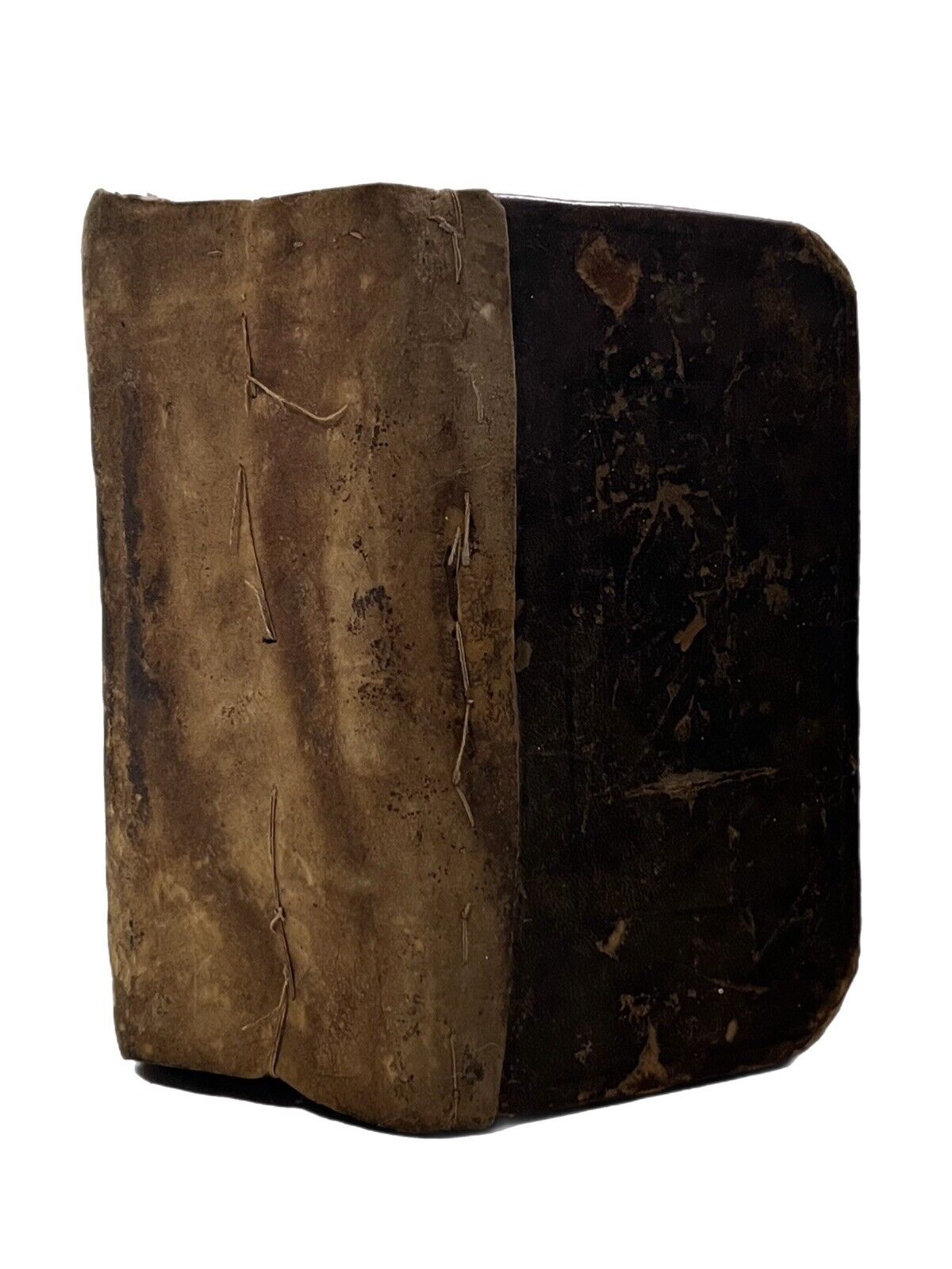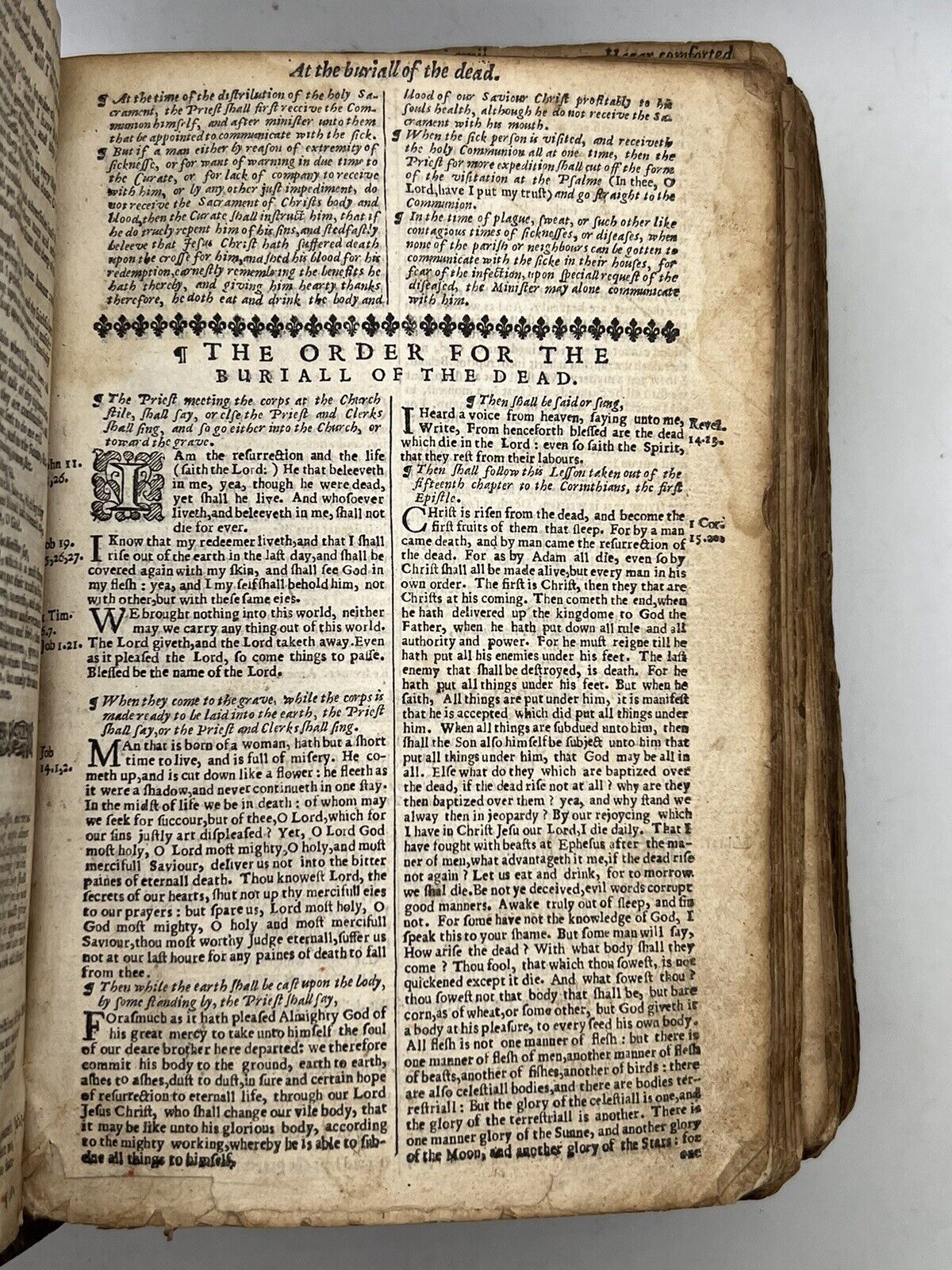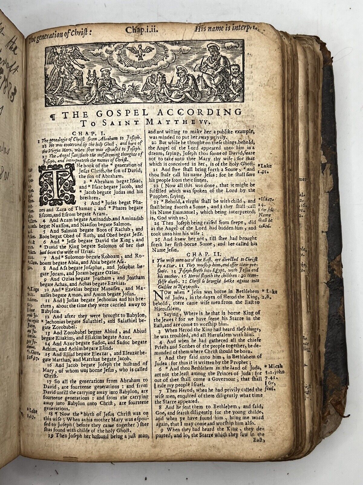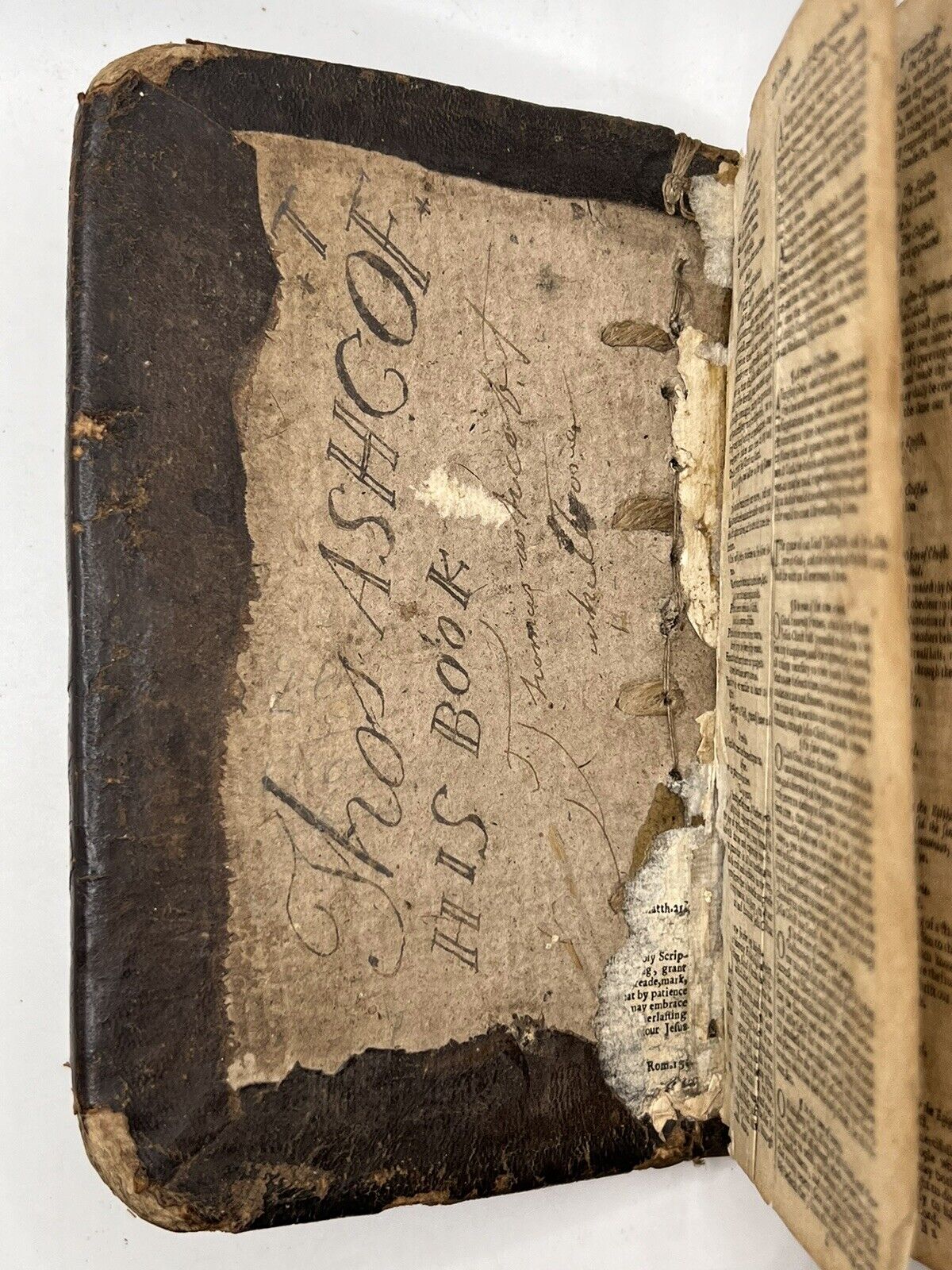 Contemporary full calf, the boards blindstamped in a simple panelled manner typical of the period. The binding is rebacked, having been done fairly early. Interestingly it appears the original spine is present underneath; the rebacking seems to have been to resecure the boards but quite possibly in the same century as printing. Subsequently, both boards are securely attached and the binding is secure. Binding rubbed with some losses, including to the corners as typical, but remains original save for the rebacking and so is rather charming indeed. Some non-uniformity to the page edges due to some leaves & gatherings being partially detached as often, or misbound. An incomplete copy, uncollated, but lacks many leaves in all sections, including the BCP and OT title pages, though retains the NT title. The majority of the text of the Bible itself is complete, though notably lacks gathering A of Genesis. Several ink ownership inscriptions throughout dating between 1680 and the late 1800s, and so much of the provenance of this copy can be traced. The text is mildly toned throughout as commensurate with the period, largely clean through the text block but with the typical sporadic damp staining, generally not affecting the legibility of the text. A very charming early King James Bible printed in the 1630s.