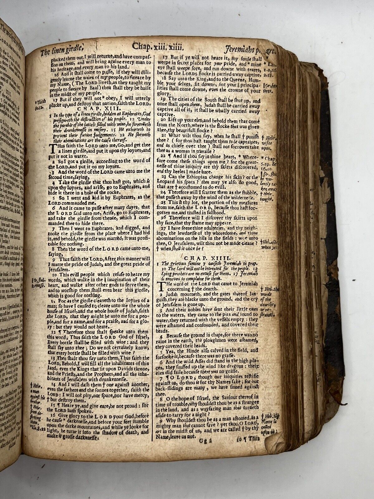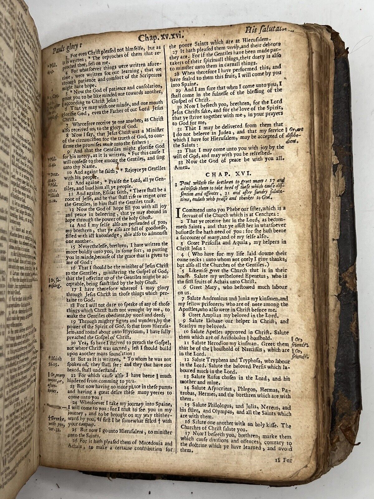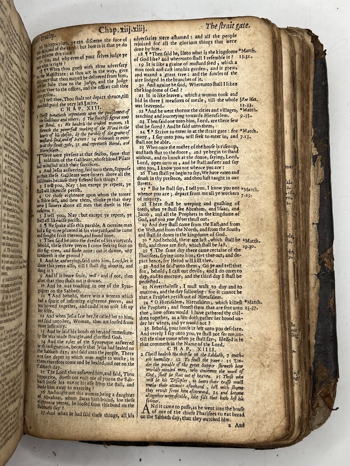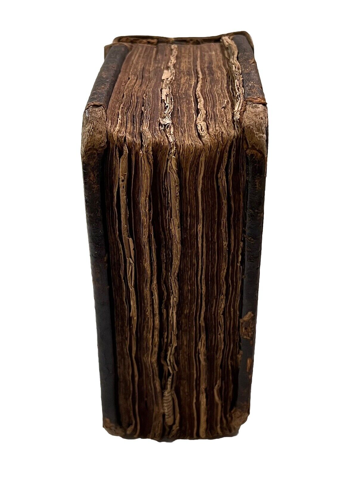 Contemporary full calf, the boards blindstamped in a simple panelled manner typical of the period. The binding is rebacked, having been done fairly early. Interestingly it appears the original spine is present underneath; the rebacking seems to have been to resecure the boards but quite possibly in the same century as printing. Subsequently, both boards are securely attached and the binding is secure. Binding rubbed with some losses, including to the corners as typical, but remains original save for the rebacking and so is rather charming indeed. Some non-uniformity to the page edges due to some leaves & gatherings being partially detached as often, or misbound. An incomplete copy, uncollated, but lacks many leaves in all sections, including the BCP and OT title pages, though retains the NT title. The majority of the text of the Bible itself is complete, though notably lacks gathering A of Genesis. Several ink ownership inscriptions throughout dating between 1680 and the late 1800s, and so much of the provenance of this copy can be traced. The text is mildly toned throughout as commensurate with the period, largely clean through the text block but with the typical sporadic damp staining, generally not affecting the legibility of the text. A very charming early King James Bible printed in the 1630s.