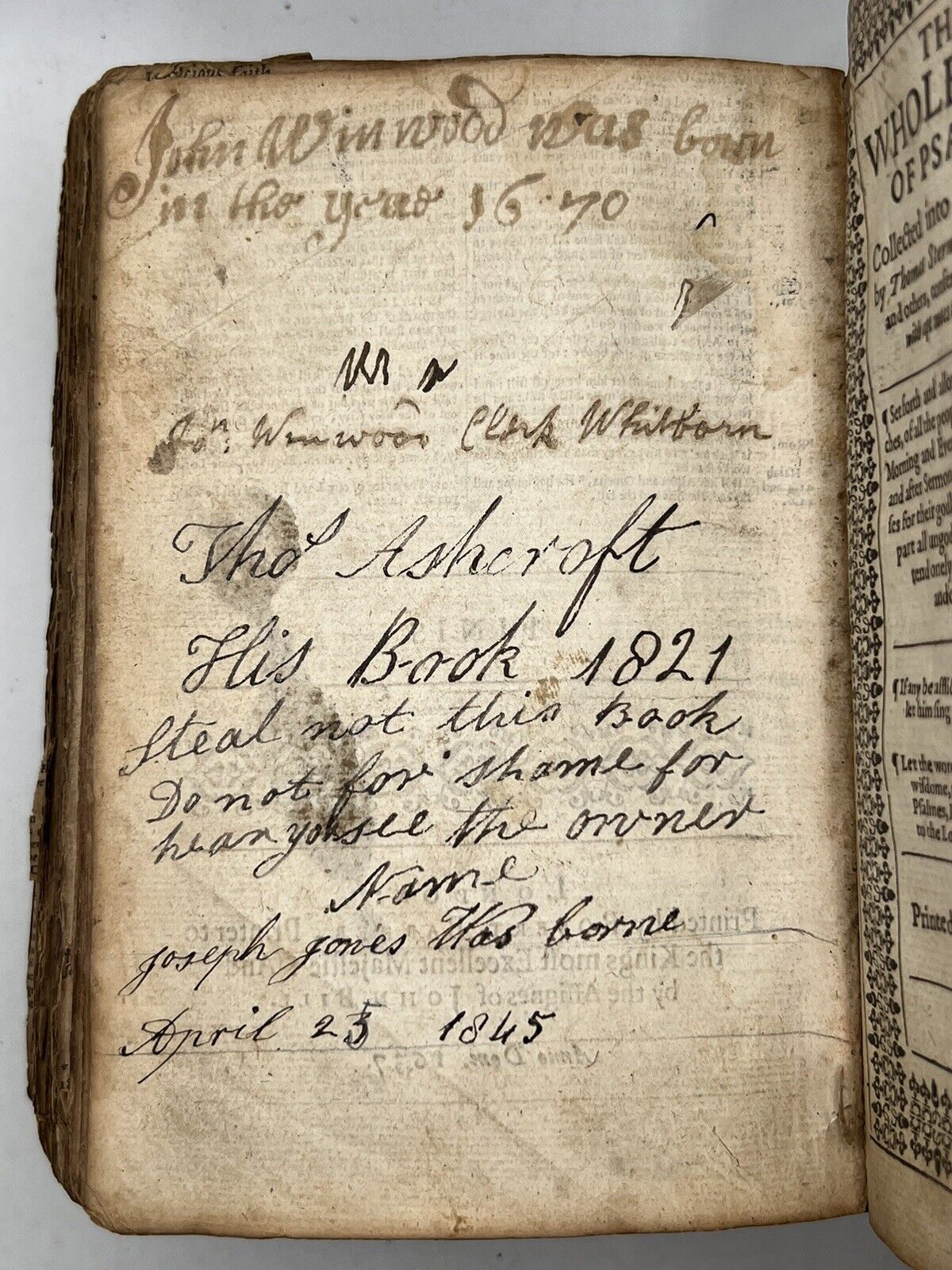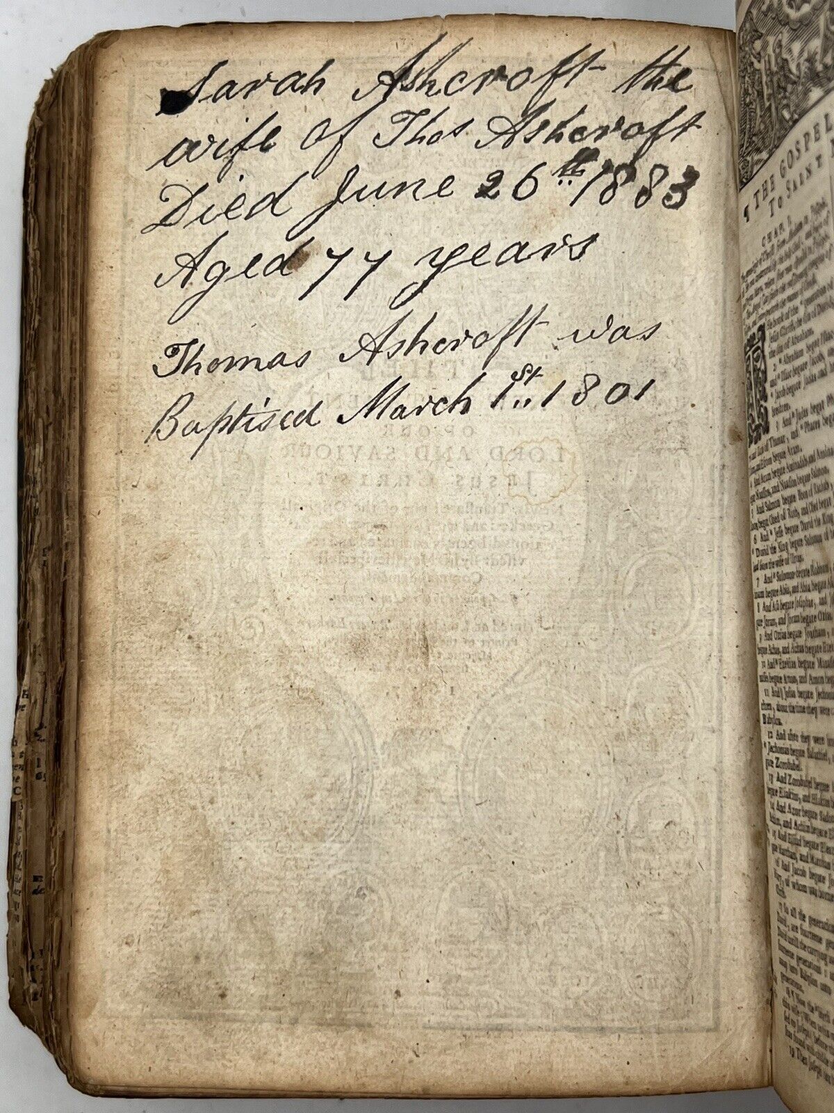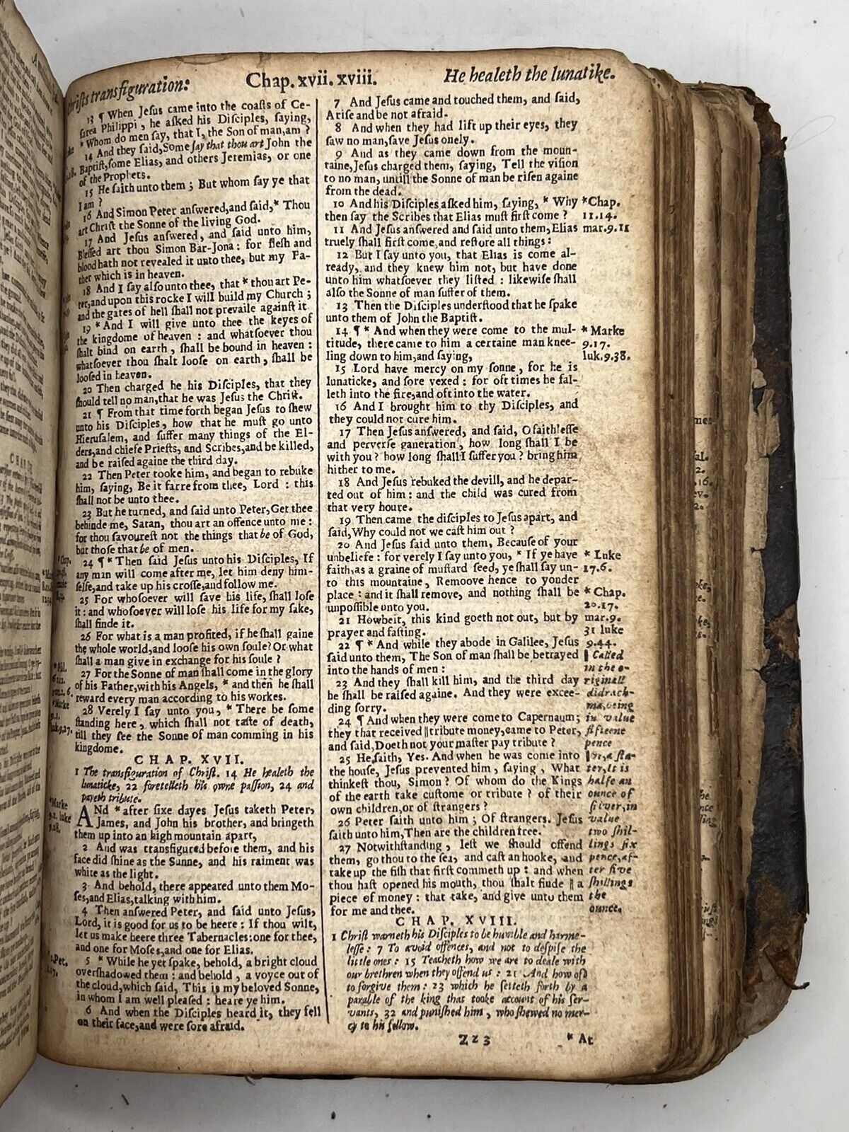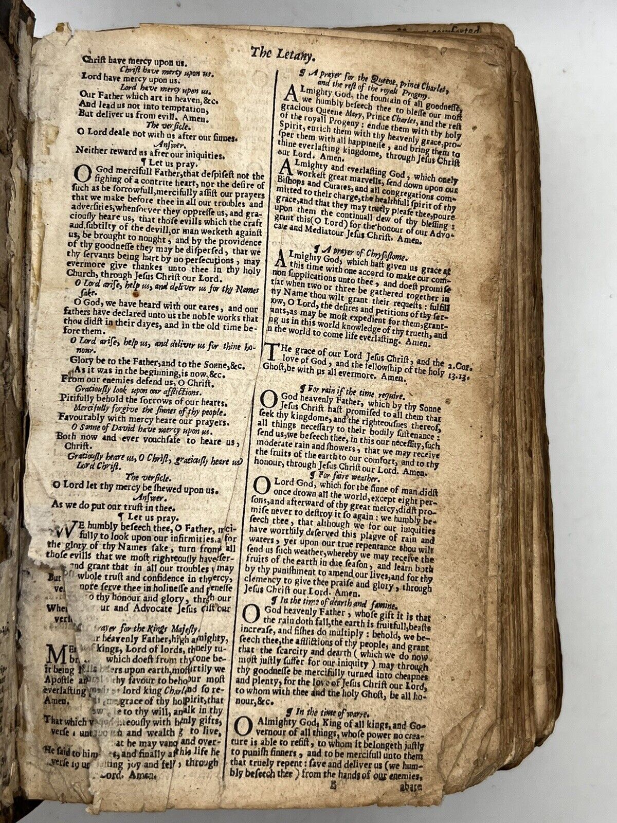 Contemporary full calf, the boards blindstamped in a simple panelled manner typical of the period. The binding is rebacked, having been done fairly early. Interestingly it appears the original spine is present underneath; the rebacking seems to have been to resecure the boards but quite possibly in the same century as printing. Subsequently, both boards are securely attached and the binding is secure. Binding rubbed with some losses, including to the corners as typical, but remains original save for the rebacking and so is rather charming indeed. Some non-uniformity to the page edges due to some leaves & gatherings being partially detached as often, or misbound. An incomplete copy, uncollated, but lacks many leaves in all sections, including the BCP and OT title pages, though retains the NT title. The majority of the text of the Bible itself is complete, though notably lacks gathering A of Genesis. Several ink ownership inscriptions throughout dating between 1680 and the late 1800s, and so much of the provenance of this copy can be traced. The text is mildly toned throughout as commensurate with the period, largely clean through the text block but with the typical sporadic damp staining, generally not affecting the legibility of the text. A very charming early King James Bible printed in the 1630s.