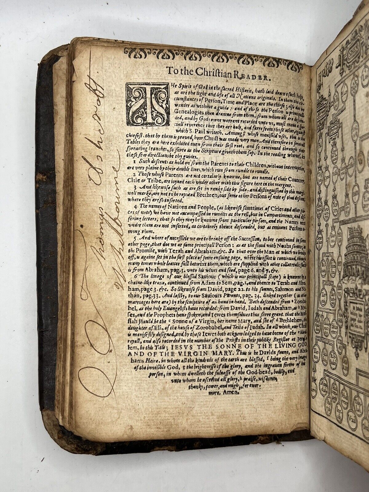 A fantastic early printing of the King James Bible from 1637, here bound with the beautiful illustrated Genealogies as was printed in the first edition of the KJV, and was scarcely included following around this period. This copy also includes an incomplete Book of Psalms also from 1637, and an early incomplete Book of Common Prayer, being particularly special as this is printed prior to the 1662 revision. A wonderful early KJV Bible in a rebacked contemporary full calf binding.