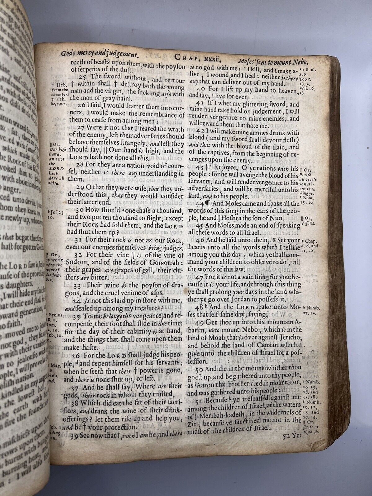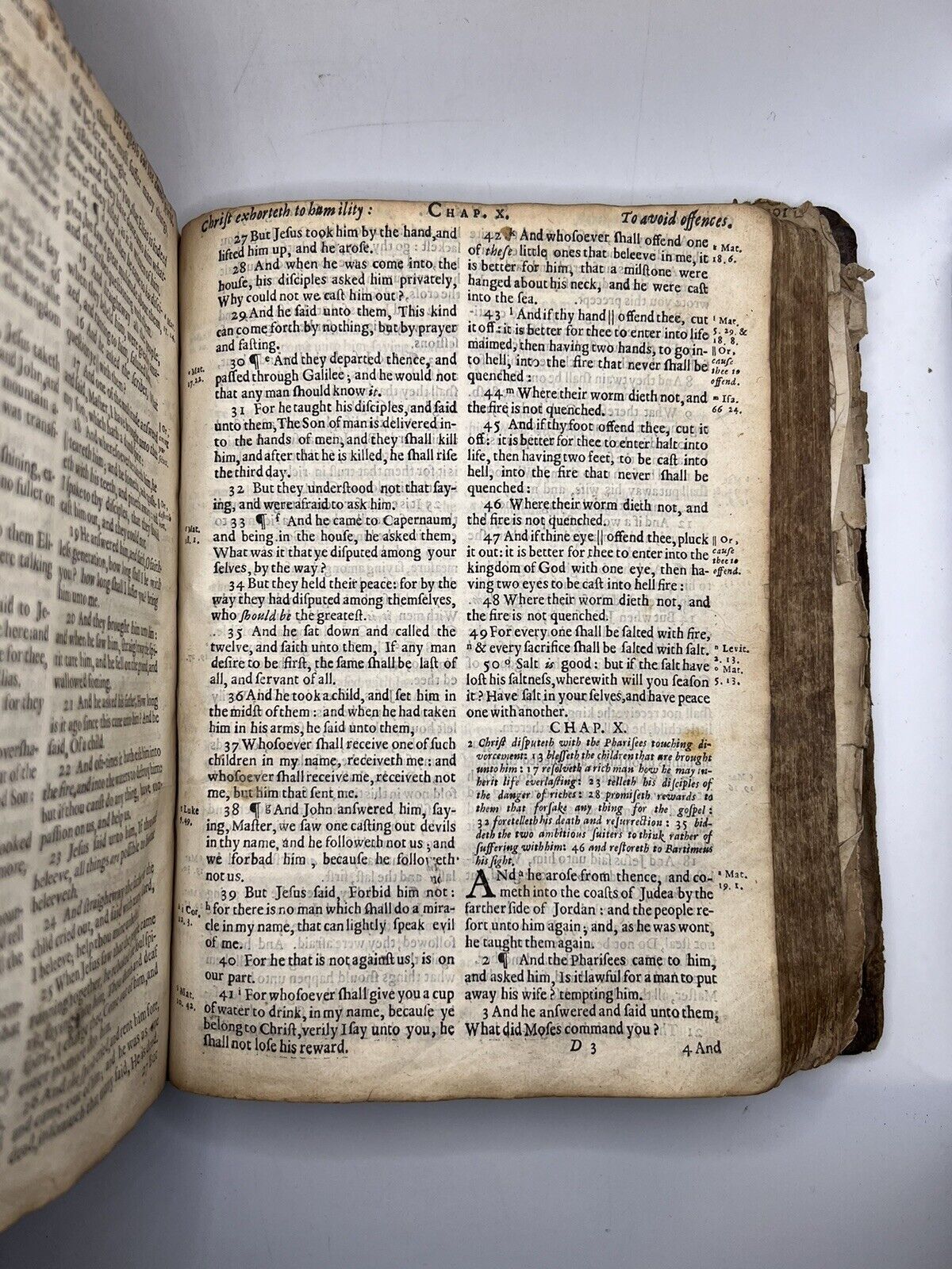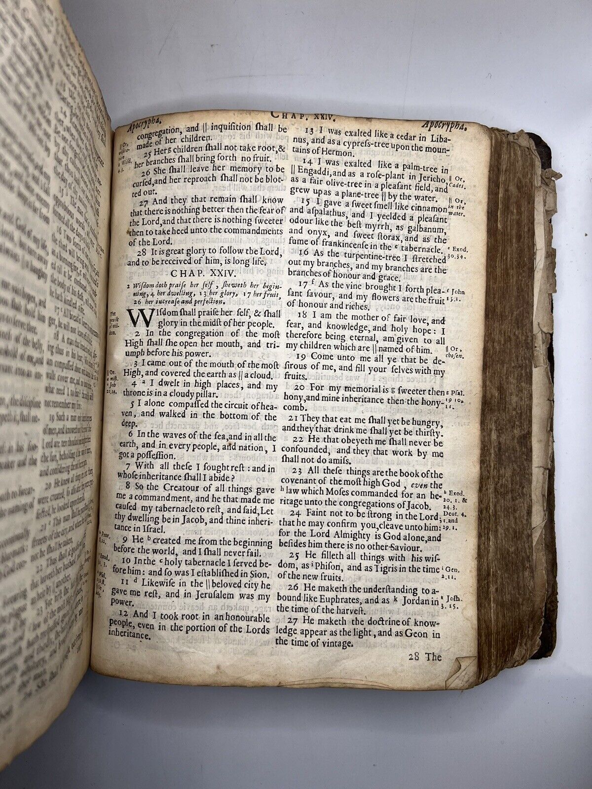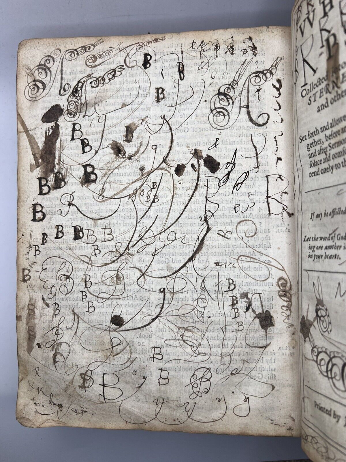 Likely contemporary inscription of ‘J.B.B.’ to head of main title page. Seemingly in this same hand is the manuscript title ‘Judith’ twice to the head of the Apocryphal additions to Esther and the multitude of inscriptions to the beginning of the Psalter. Inscription of a ‘Beolia (?) Chamberlayne’ to T1 of the BCP. Erroneous mathematical calculation to NT title page dated 1738. Inscription of Catharine Young to front pastedown dated 1740, presumably as a child, repeated to blank verso of NT title page dated 1752 in a much neater hand. Inscription of John Young to rear pastedown dated 1771. Inscription of Betty Goddard to front pastedown dated 1778. Unattributed date to front pastedown reading 1812, probably in the hand of Francis Day who wrote an inscription to H4 in the NT dated November 8th 1814.