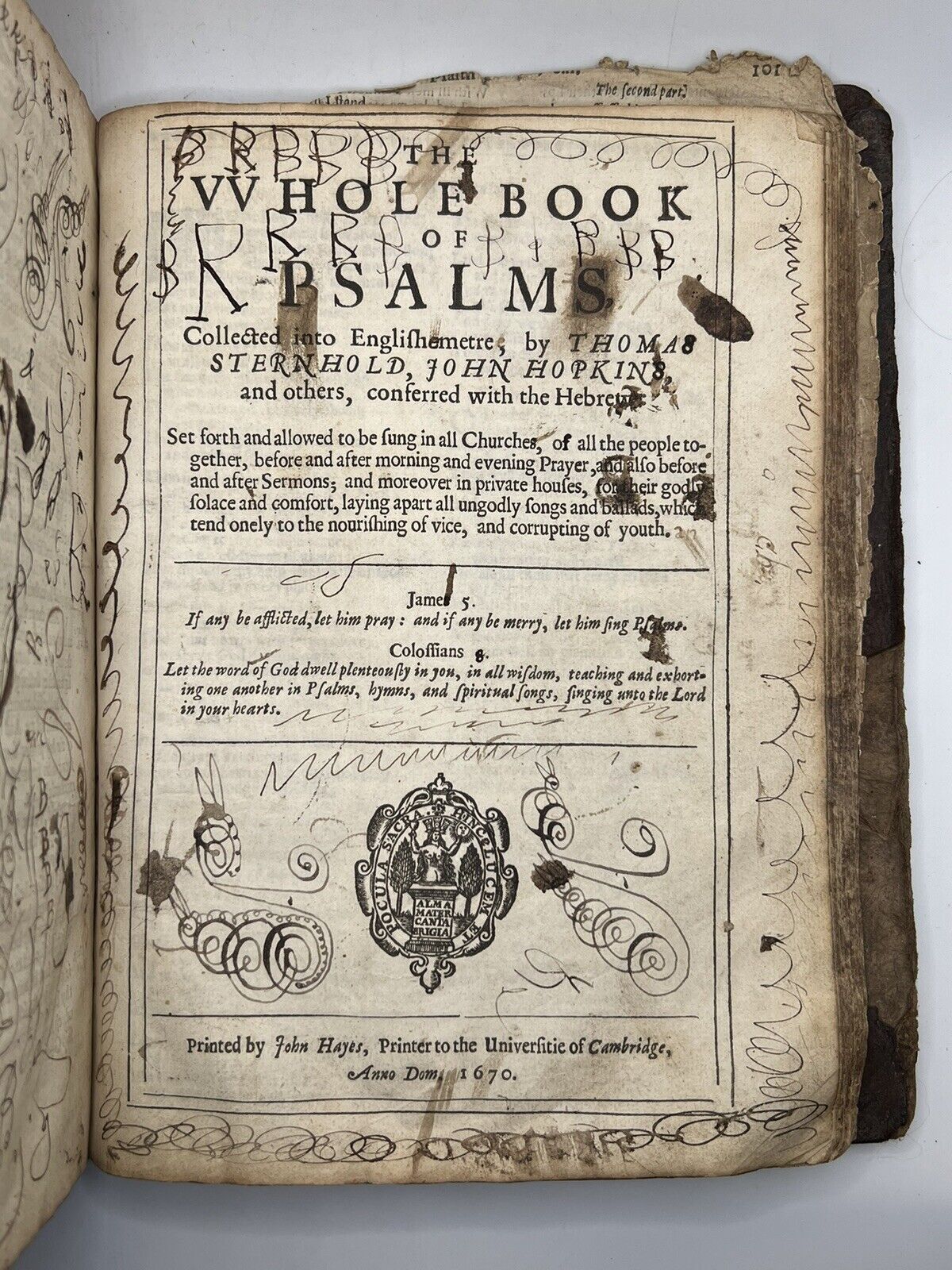 The Holy Bible Containing the Old Testament and the New. Newly translated out of the Original Tongues And with the former Translations diligently Compared and revised by his Majesties speciall command. Cambridge: John Hayes, 1670. [Together with] The Whole Book of Psalms, Collected into Englishmetre, by Thomas Sternhold, John Hopkins, et al. Cambridge: John Hayes, 1670, 4to.
