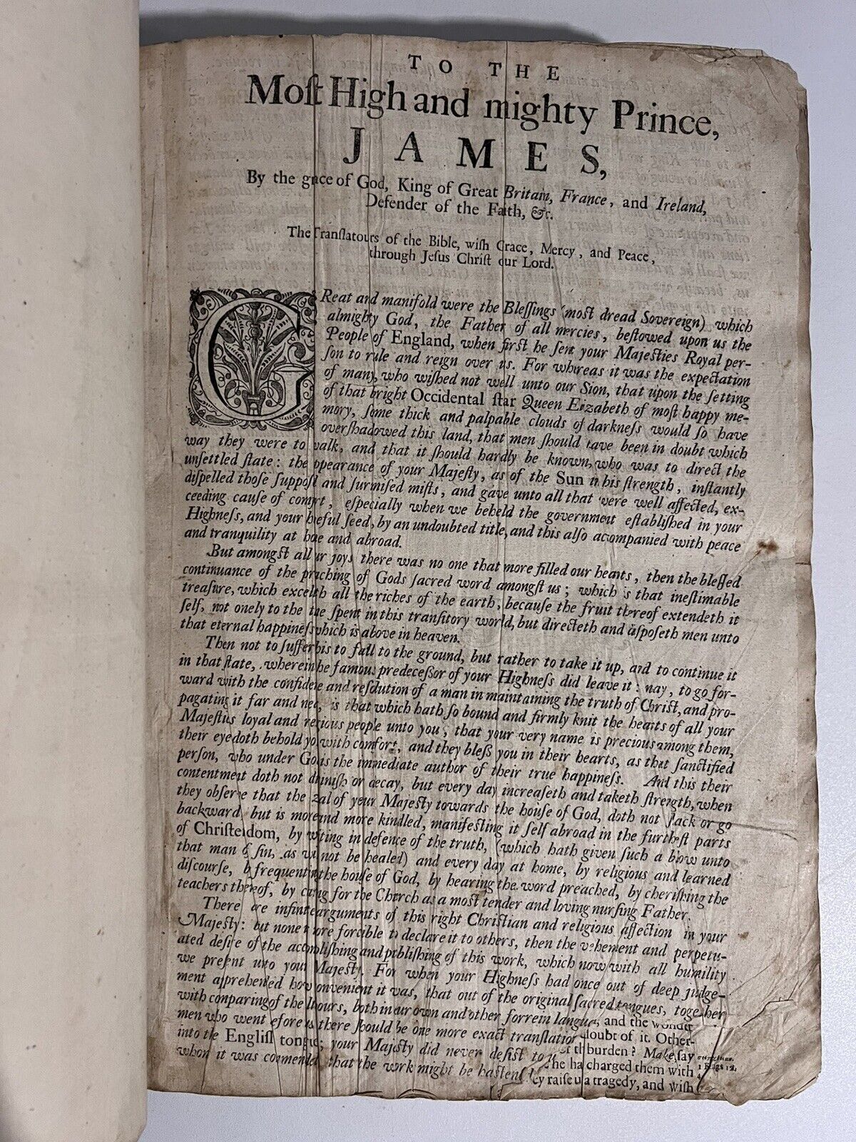 Contemporary full panelled calf binding, most likely bound in Oxford. Binding rubbed and dry with some losses to the leather, a large detached section of leather is preserved inside the front cover for restoration if desired, though this copy is in unrestored original condition and so is very charming. Both boards are securely attached, the book functions properly as a book. Without any attached bookplates or ownership inscriptions. Leaves a1 and b1 are detached but present. Lacks the main title, else collates complete and thus scarce in that regard. Includes the table at the foot of 6D1b as mentioned in Herbert's bibliography. Exceptionally clean throughout the text block, mildly toned with the occasional mark, but generally as clean and bright a text block as one could hope for in a 17th century text. Truly an exceptional copy of a very large 17th century King James Pulpit Bible.