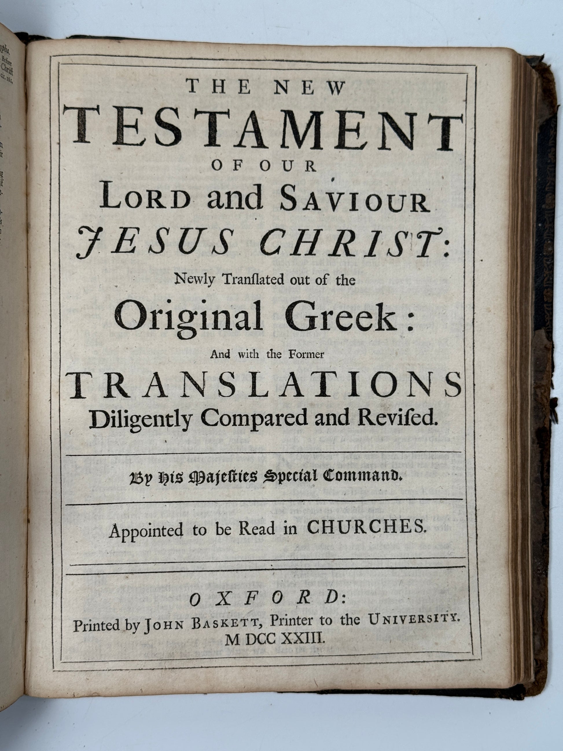 A beautiful antique King James Bible in a fine contemporary morocco binding with a gilt panelled design and all edges gilt. Internally a very bright and clean example. This edition with the New Testament dated one year earlier, 1723.