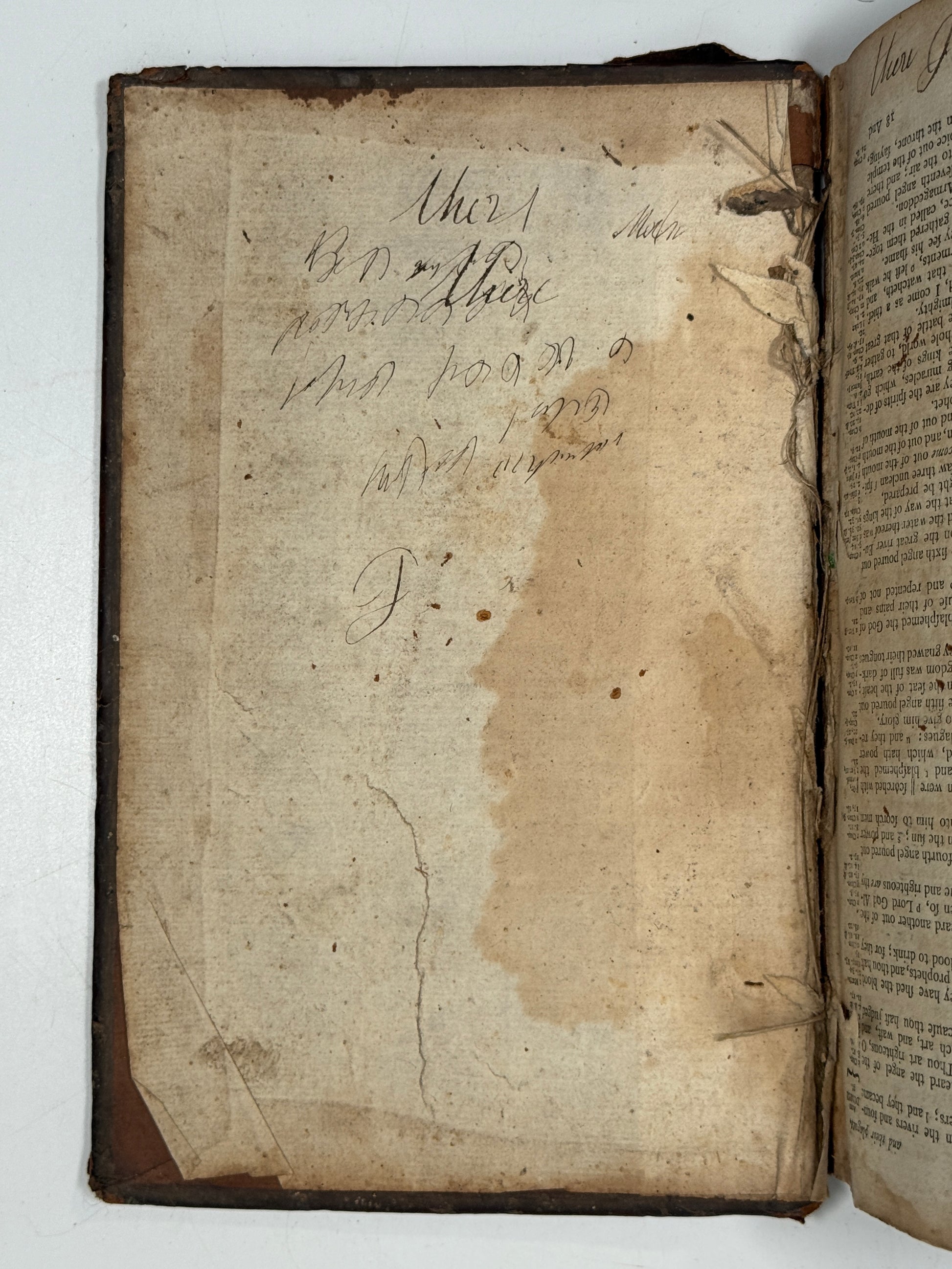 Full brown calf binding with blind-stamped boards. Binding rubbed and scuffed with some losses to the leather, and the leather peeling in places. Both boards attached with cracked joints and hinges, thus fragile. Shelf and edge wear. Lacking headcap and tailcap. Text block clean with edge toning and sporadic foxing. Ink ownership inscriptions to the front pastedown and title page. Small tear to S3, with very minor loss to text. Ink marginalia to 3G2 and the verso of 4C1. Ink inscriptions to the rear pastedown. Minor damp-staining to the first few gatherings. Title page with some loss. Last 3 leaves lacking, text should end with 4C4 (i.e. after Revelation 16:17). The Apocryphal books are not called for in this edition.