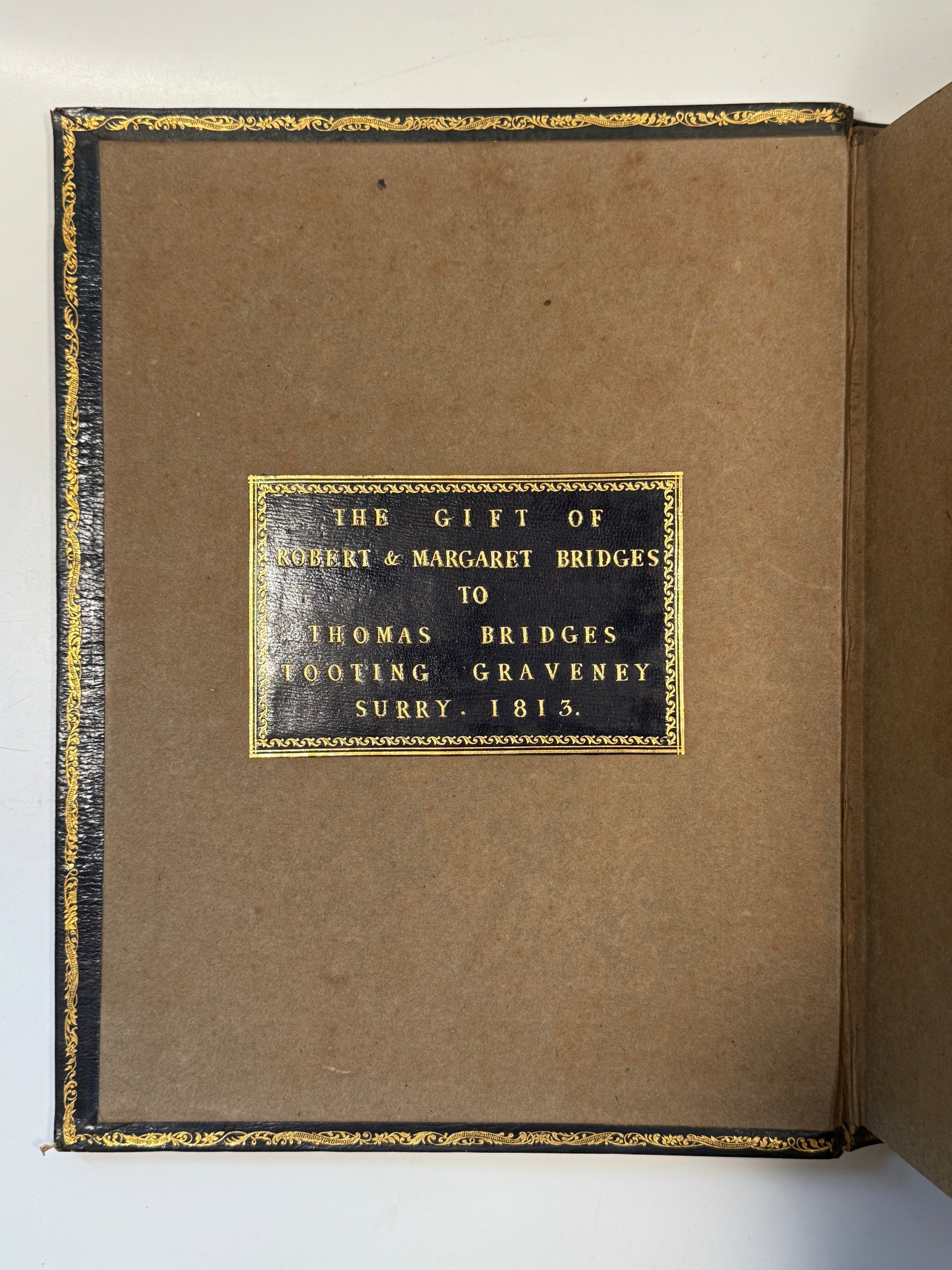 Contemporary full blue calf finely tooled in gilt to spines in compartments between raised bands, each end of the spines finely tooled, turn-ins in gilt with large finely tooled presentation bookplate to front pastedown of each volume. Bindings a little rubbed, but generally very good, some discolouration to boards, minor sunning. All edges gilt, very good. All boards securely attached, hinges very good without having been reinforced. Generally bright and clean throughout the text blocks, some light scattered spotting, mild toning, plates offset to verso blanks as typical, tissue guards present. The tissue guards are often more heavily foxed as is typical, but therefore have well served their function.