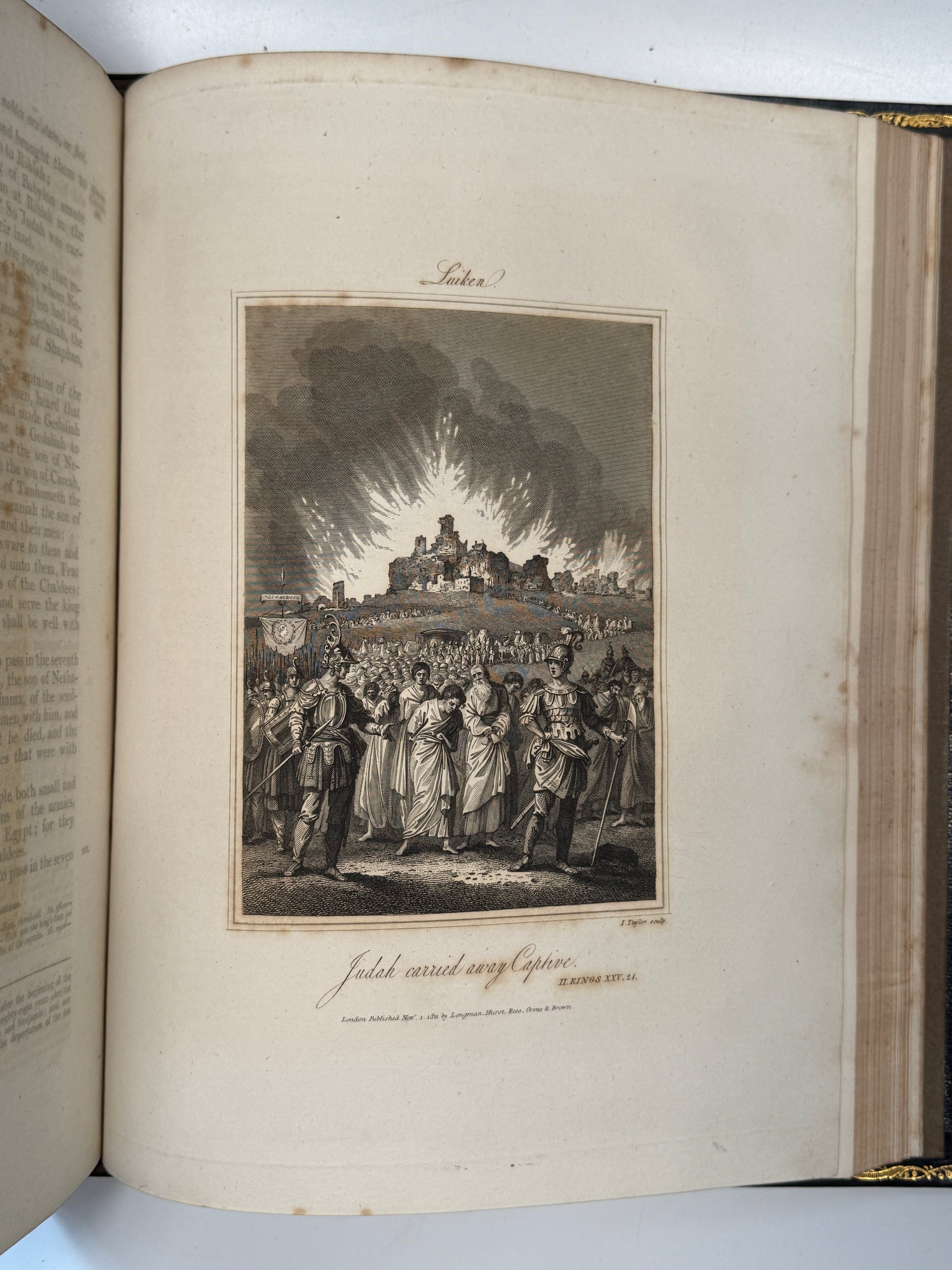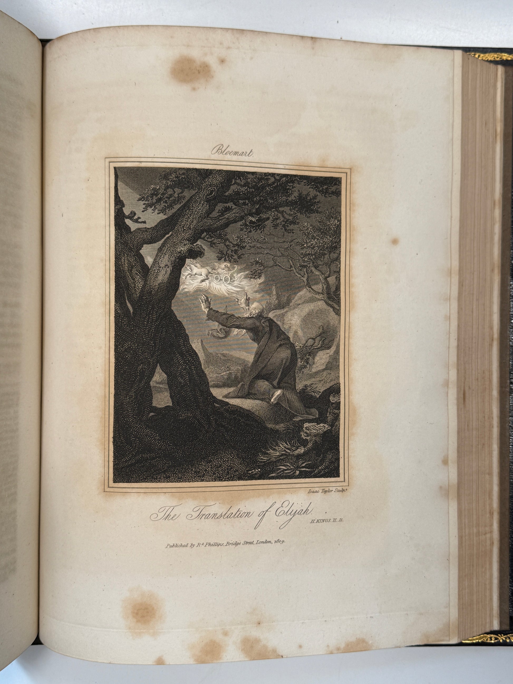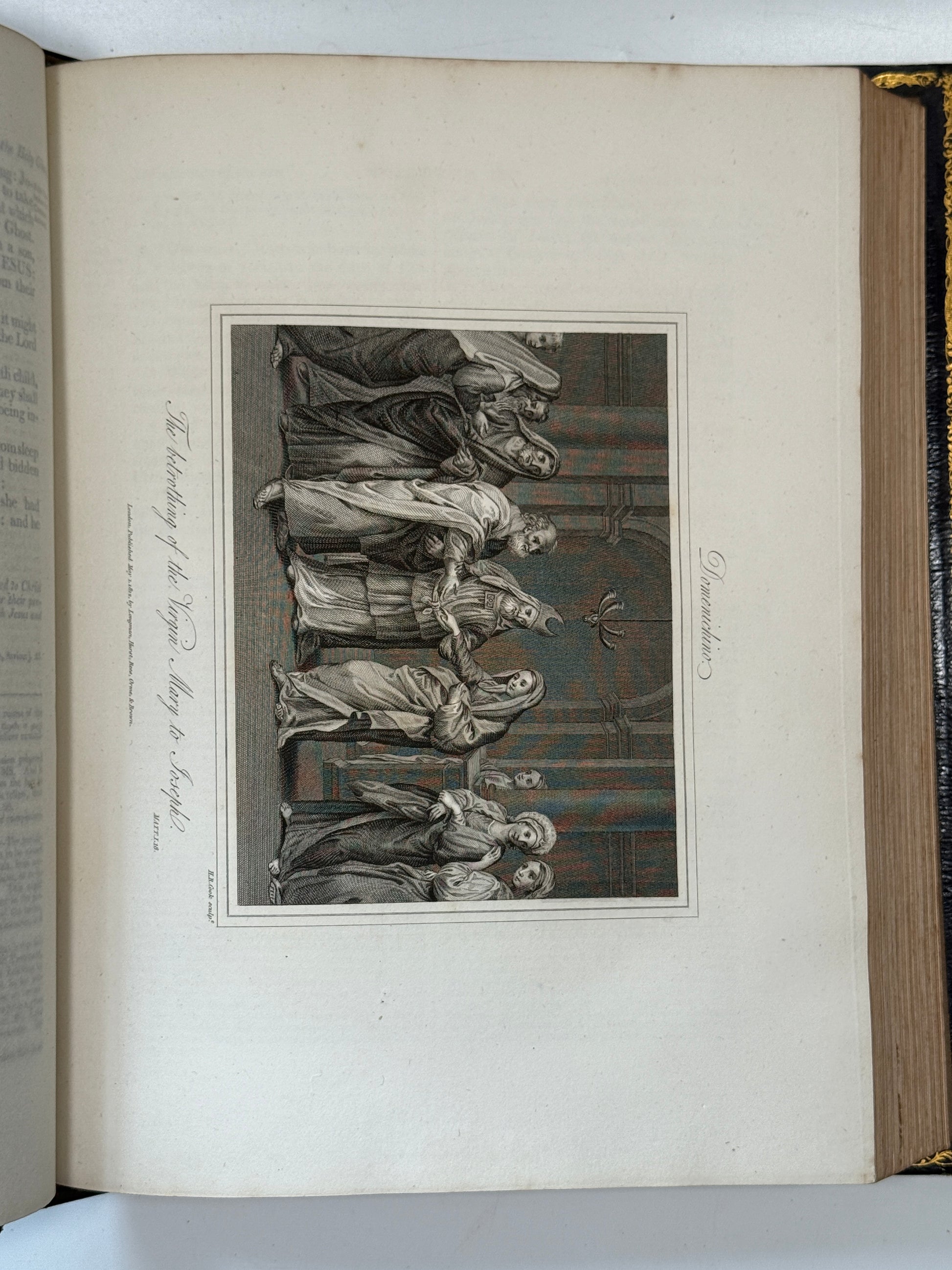 A magnificent finely bound set of the King James Bible, attractively illustrated throughout. This set truly is a visual masterpiece, with beautiful uniform contemporary full blue leather bindings with finely tooled gilt to spines and turn-ins with a striking tooled morocco presentation plate to the front pastedowns dated 1813. One of the best KJV Bible sets of this period we have ever seen, and with the books of the Bible divided intelligently into the separate volumes rather than the frequently encountered strange divisions one sees in sets. A set which is a genuine pleasure to read with beautiful well-sized type, generous margins, good quality paper, and a huge number of illustrations (including maps).