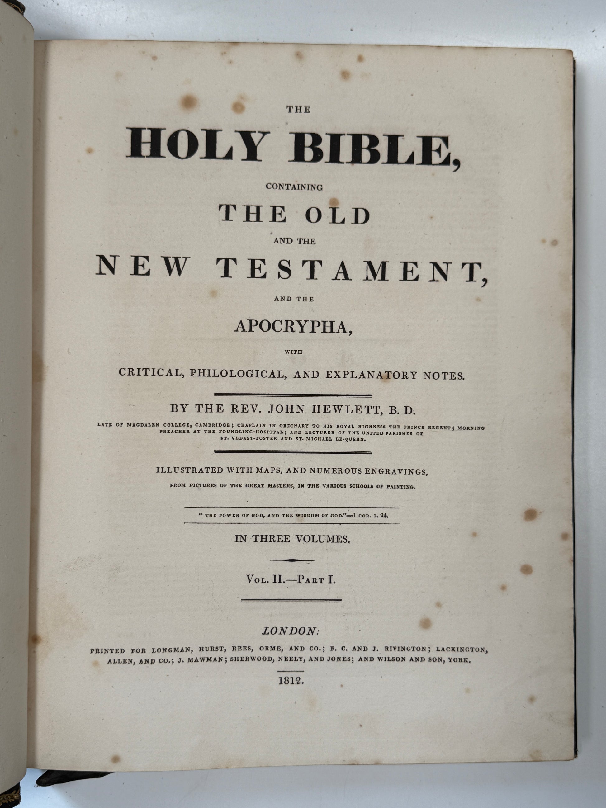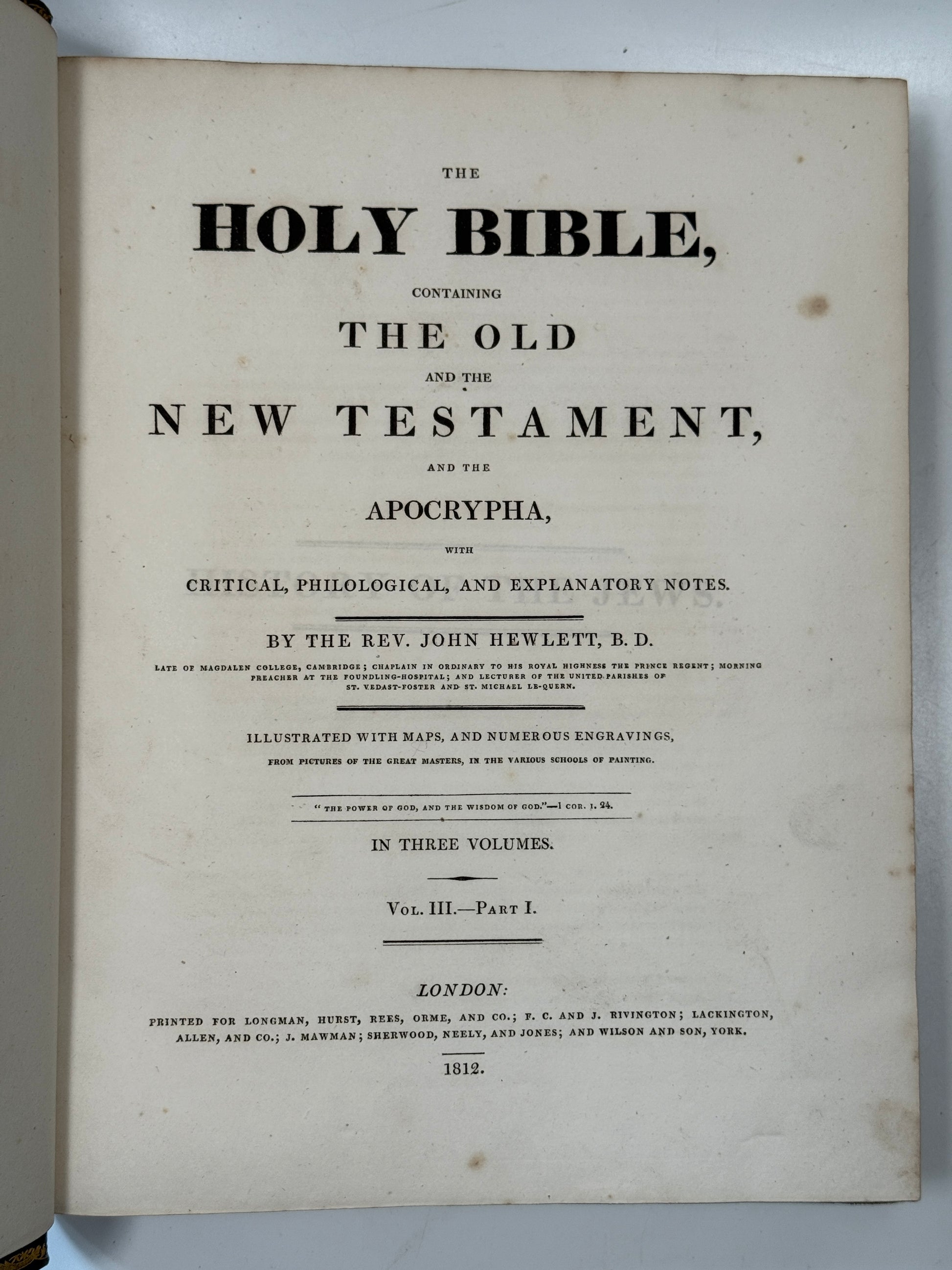 The Holy Bible, Containing the Old and the New Testament, and the Apocrypha, with Critical, Philological, and Explanatory Notes. By the Rev. John Hewlett. In Three Volumes. London: Longman, Hurst, Rees, Orme, and Co, 1812, 4tos, a.e.g.