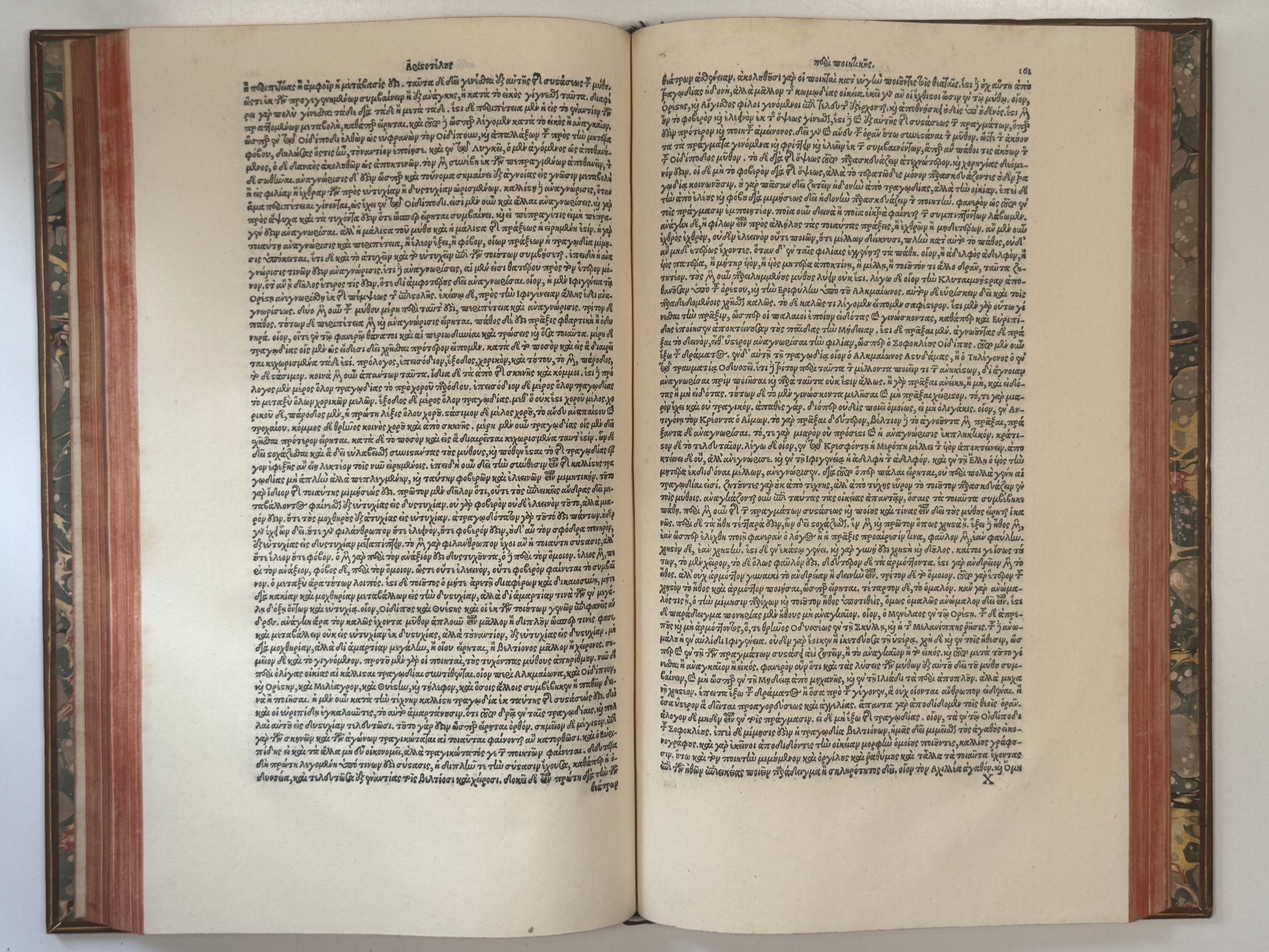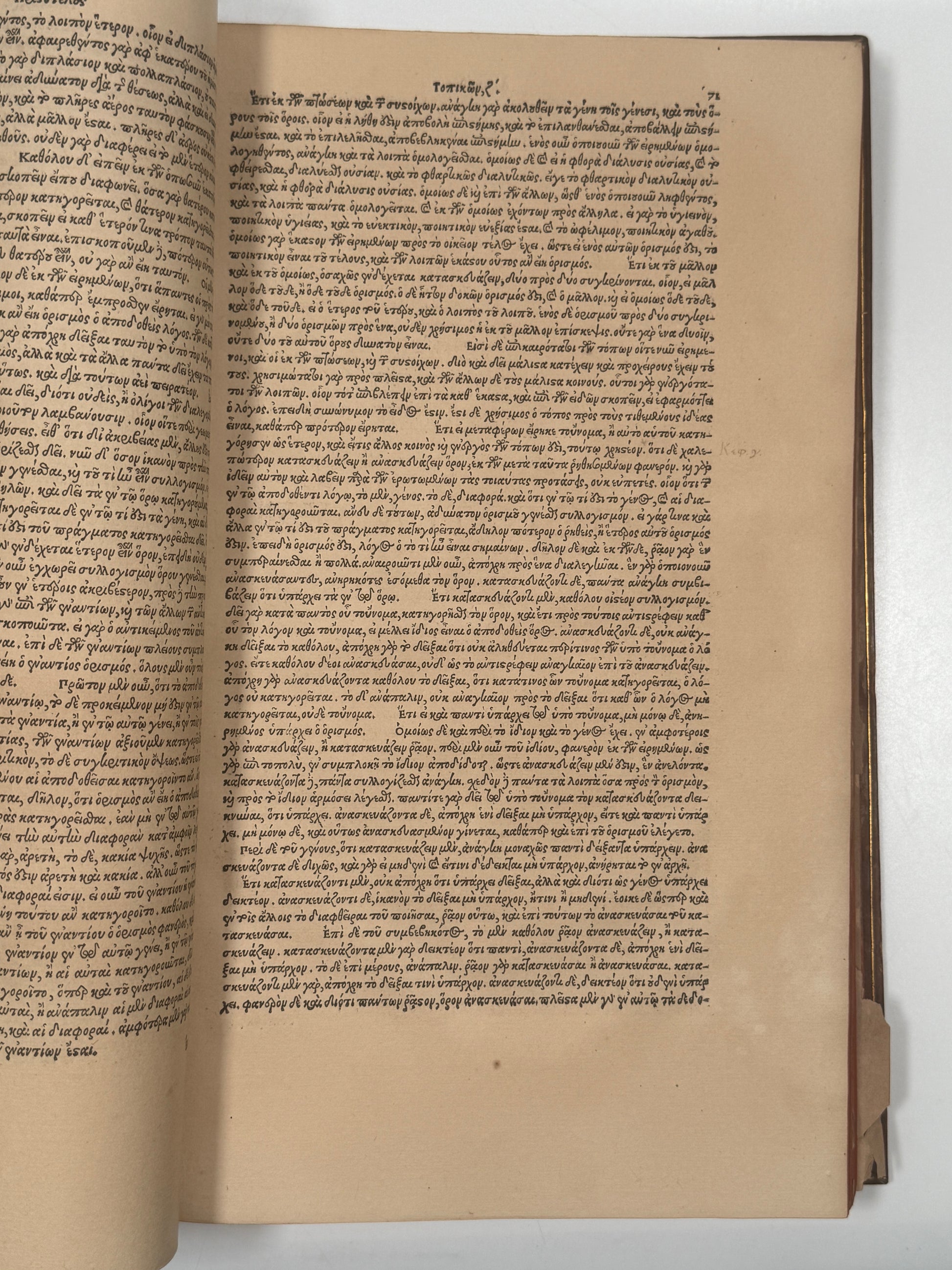 18th century full calf bindings, gilt dulled with some loss, bindings rubbed with minor discolouration. Binding for the first volume is split vertically down the spine separating the book in two. Second volume binding is secure. All boards securely attached. No attached bookplates or ownership inscriptions. Generally bright and clean through the text block of the second volume, but with approximately 25 consecutive leaves with the paper heavily toned and dried out such that the paper is very weak and is becoming fragmented, else the text of the second volume is very good. In the first volume, this issue is more substantial and affects about 50 leaves in the centre where the binding is split with many of those leaves having the paper crumbling with a small number of fragments missing, but generally the paper is all there. This volume must be handled carefully to prevent further degradation and would ideally be tended to by a competent restorer. The other leaves in the text block are generally very bright and clean, some foxing to the first few leaves including the title leaf (pictured) with the second leaf remounted without loss. With the paper issues fixed and the binding of the first volume repaired, this would be a magnificent copy of this exceedingly rare and important edition of Aristotle's works, being the earliest obtainable edition of his works for less than a six-figure price and the first complete edition of his works in the original Greek. The collation has not been provided so as to not risk further degradation of the weak paper in the two volumes, but the volumes, for those leaves which can be observed, appear to collate as complete. The second volume can be entirely leafed through, one just has to be careful with the circa 25 affected leaves (which do have some tears). The affected percentages of the two text blocks are somewhere around 10 and 20% of each and so the majority of the text in both volumes remains very nice indeed, but the obvious defects need noting. See one of the final photos for what this dried out paper looks like. This isn't a photo of the worst affected parts as we couldn't safely open those leaves fully without risking further damage.