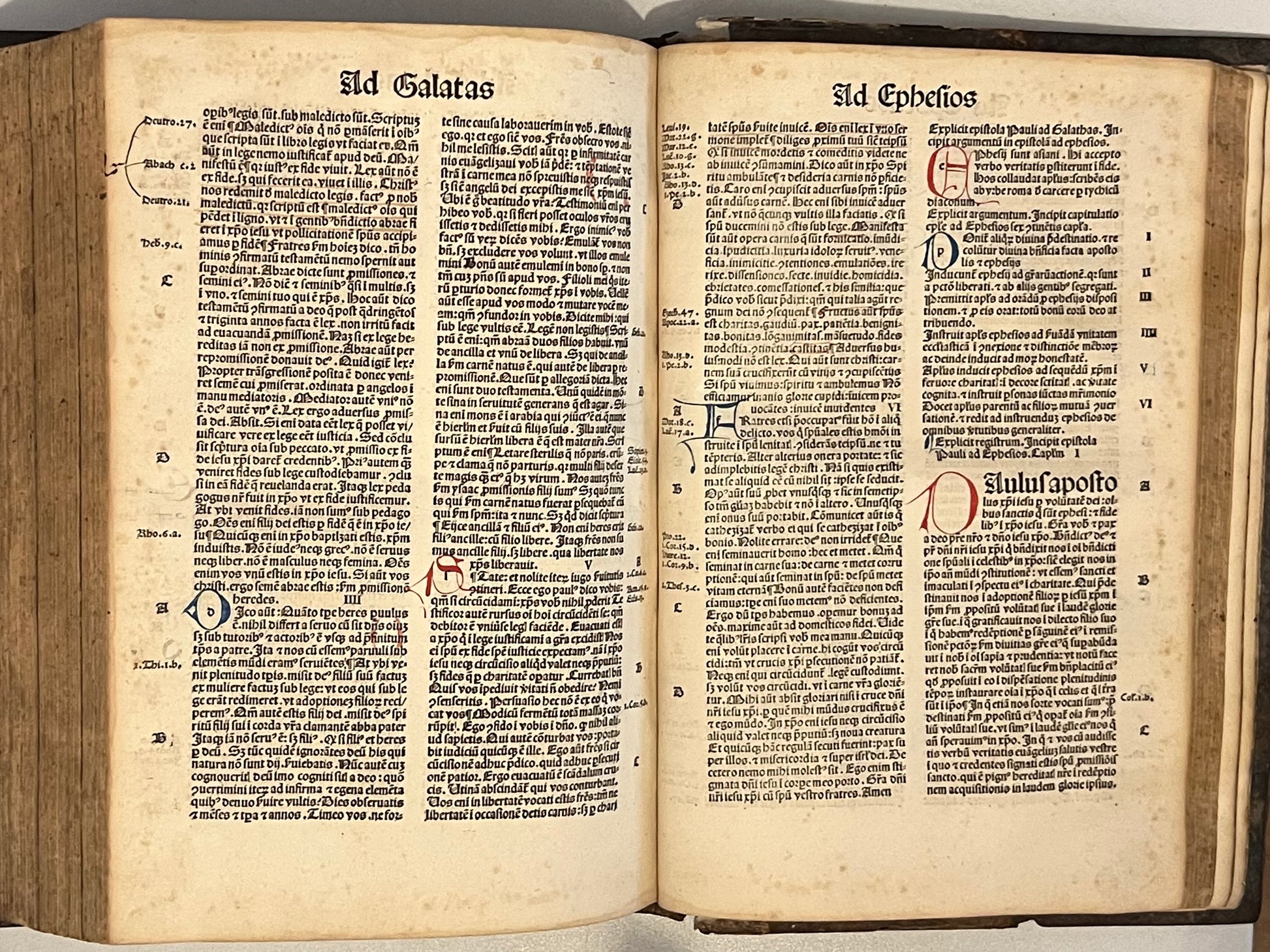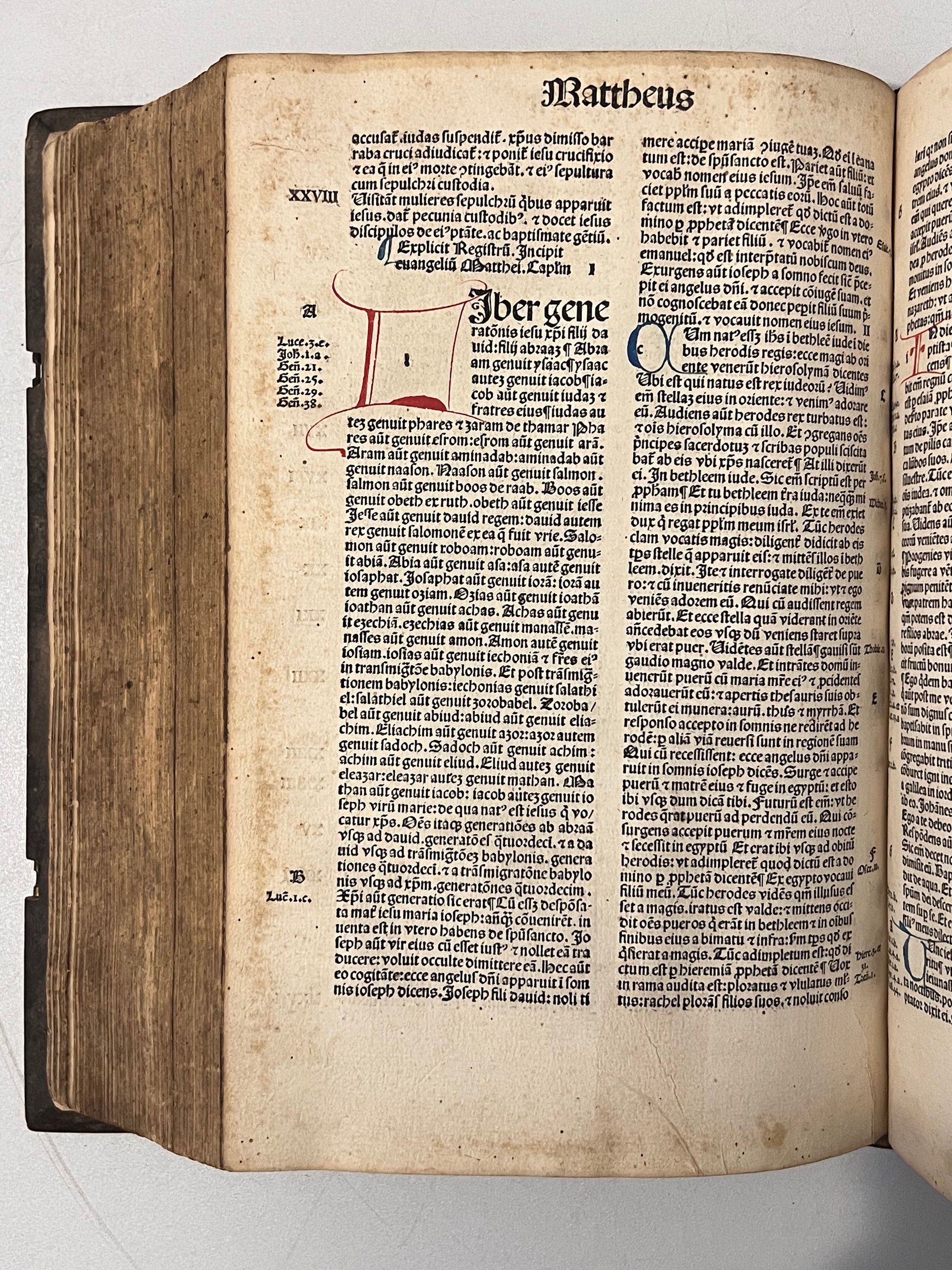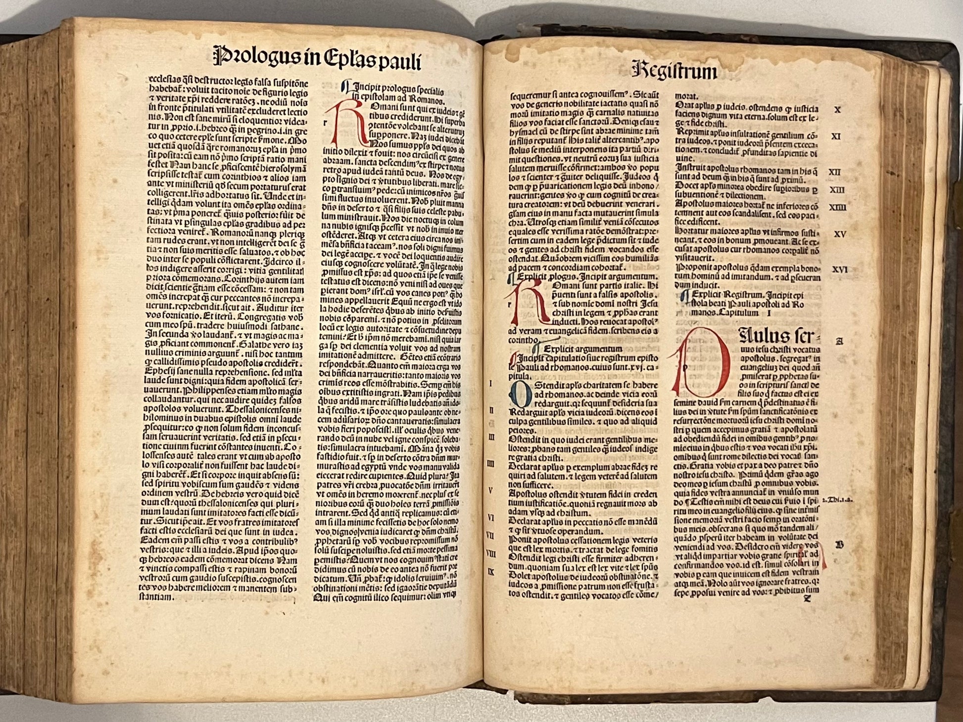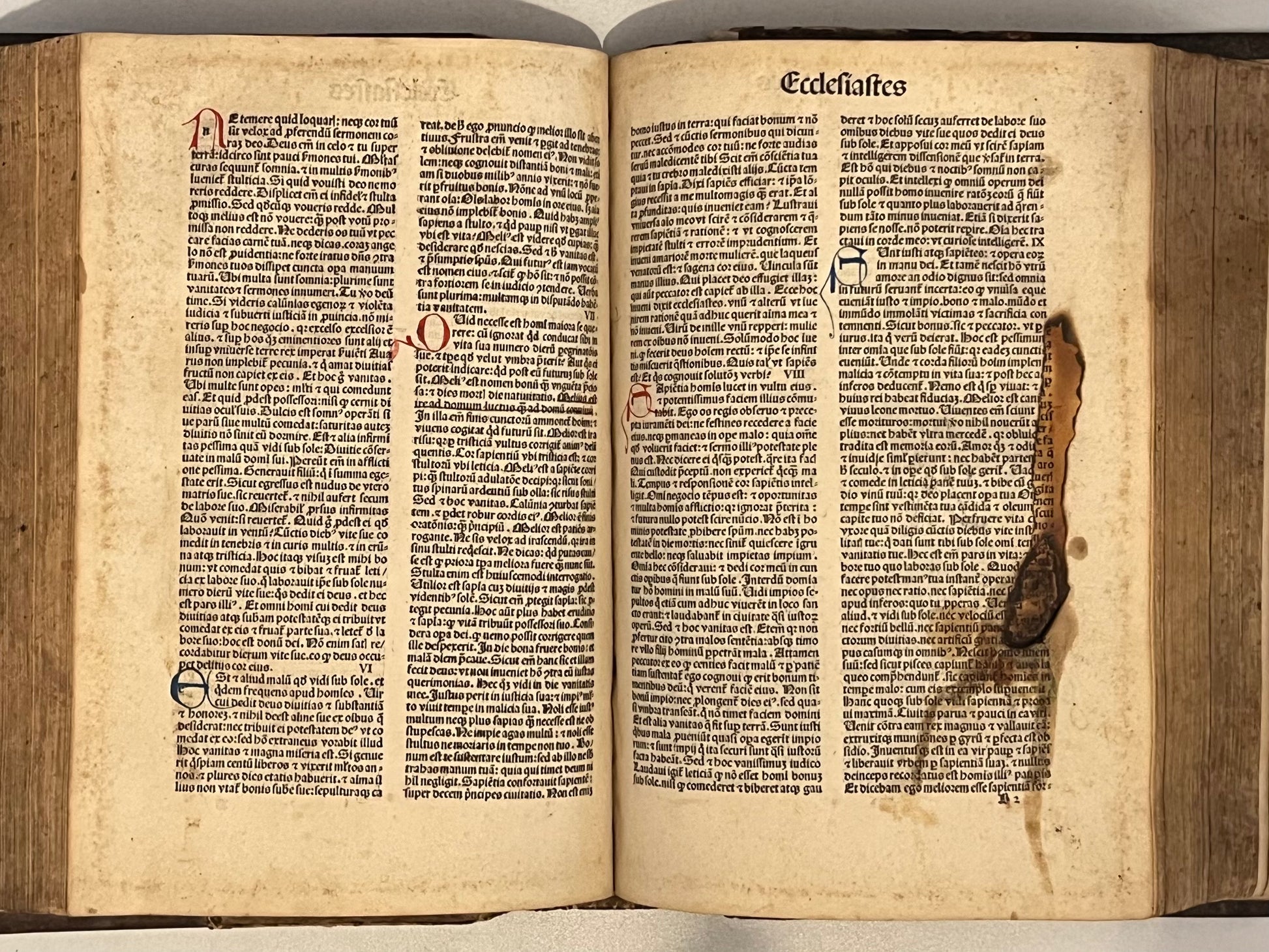 Generally clean throughout the text, light spotting throughout, heavier in places, but mostly confined to marginal spaces where it occurs. Some contemporary marginalia in places. Two leaves with slightly torn corners (L5, Daniel, and 2B6, 2 Timothy), without any text loss. B2-( X? ) with a burn hole in the right outer margin decreasing in size from B2 onwards, starting at approx 11x1.5cm and decreasing to around 4x1.5cm, causing some minor text loss in Wisdom/Ecclesiasticus. Preliminary blank reinforced in gutter, presumably when the facsimile title was tipped in. Very extensive manuscript handwriting to front pastedown, largely illegible, but written in German, probably circa the early 16th century, perhaps slightly earlier, and so likely of Humanist ownership. Some very neat and small marginalia throughout in various hands, at least three of which appear to be contemporary, probably indicating early institutional ownership at a monastery or similar. The rubricator has also underlined certain passages. We seemingly have two rubricators at work here, one who did the initials, and another who has done some of this underlining and rubrication of smaller capitals in places, again pointing to monasterial or early university ownership.