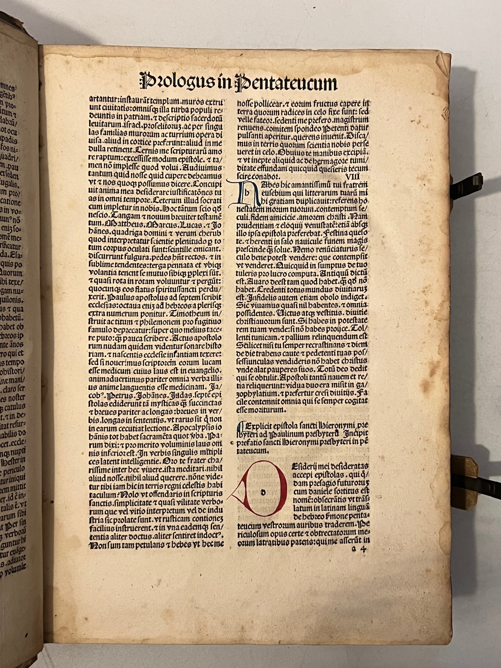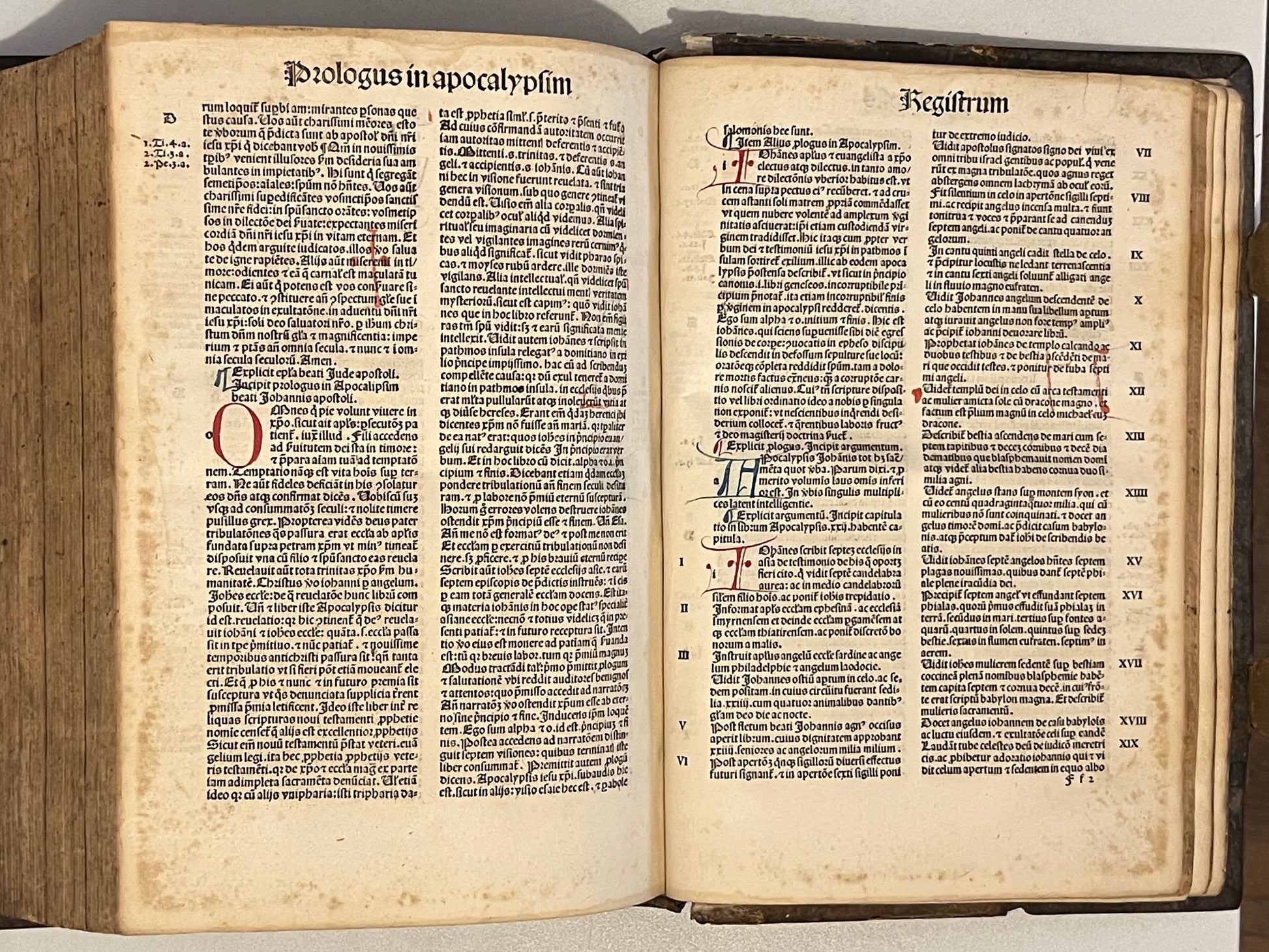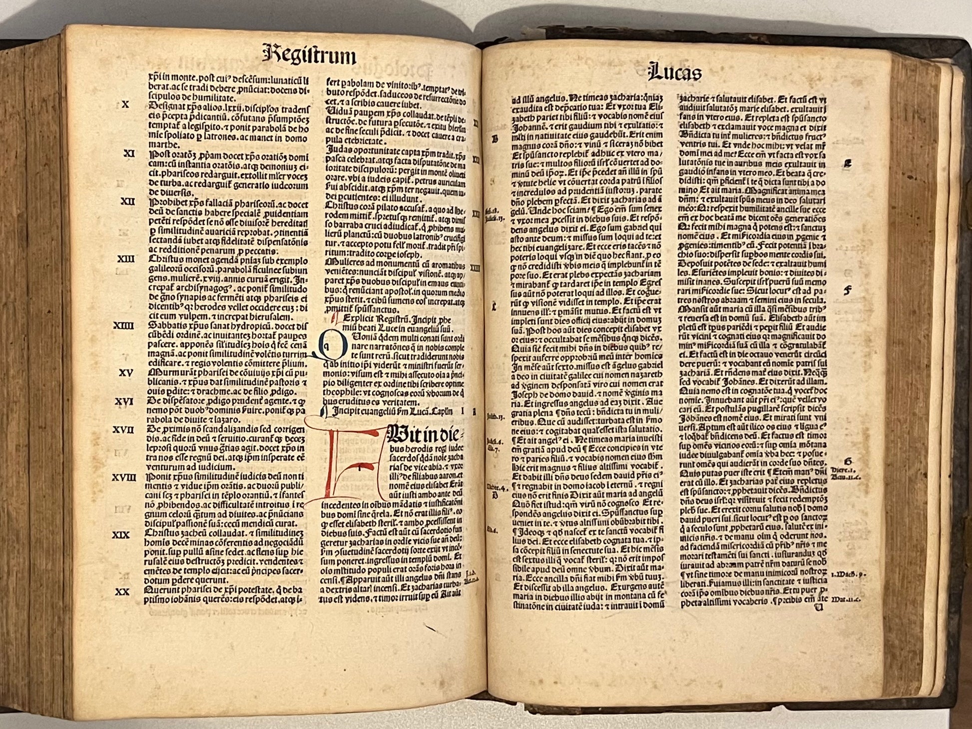 Generally clean throughout the text, light spotting throughout, heavier in places, but mostly confined to marginal spaces where it occurs. Some contemporary marginalia in places. Two leaves with slightly torn corners (L5, Daniel, and 2B6, 2 Timothy), without any text loss. B2-( X? ) with a burn hole in the right outer margin decreasing in size from B2 onwards, starting at approx 11x1.5cm and decreasing to around 4x1.5cm, causing some minor text loss in Wisdom/Ecclesiasticus. Preliminary blank reinforced in gutter, presumably when the facsimile title was tipped in. Very extensive manuscript handwriting to front pastedown, largely illegible, but written in German, probably circa the early 16th century, perhaps slightly earlier, and so likely of Humanist ownership. Some very neat and small marginalia throughout in various hands, at least three of which appear to be contemporary, probably indicating early institutional ownership at a monastery or similar. The rubricator has also underlined certain passages. We seemingly have two rubricators at work here, one who did the initials, and another who has done some of this underlining and rubrication of smaller capitals in places, again pointing to monasterial or early university ownership.
