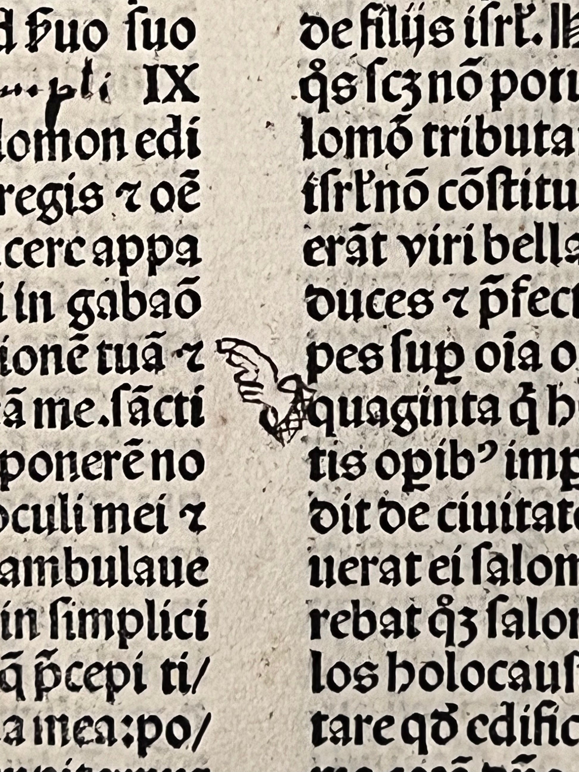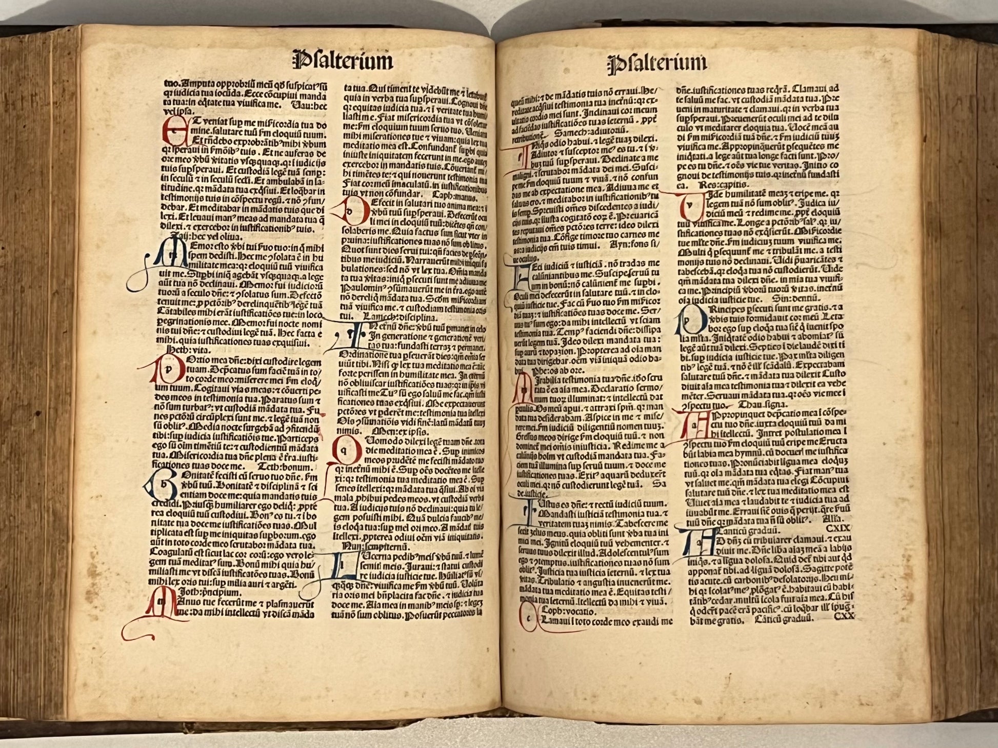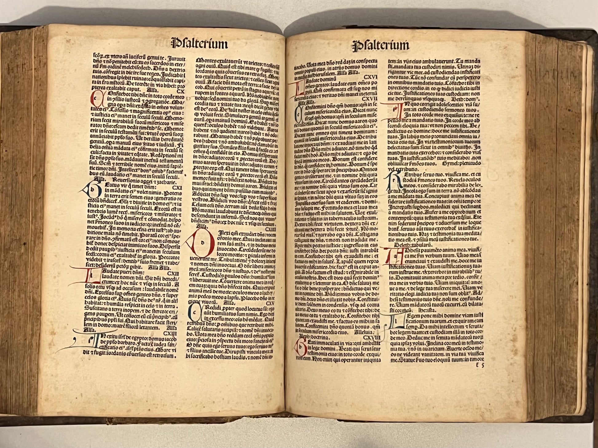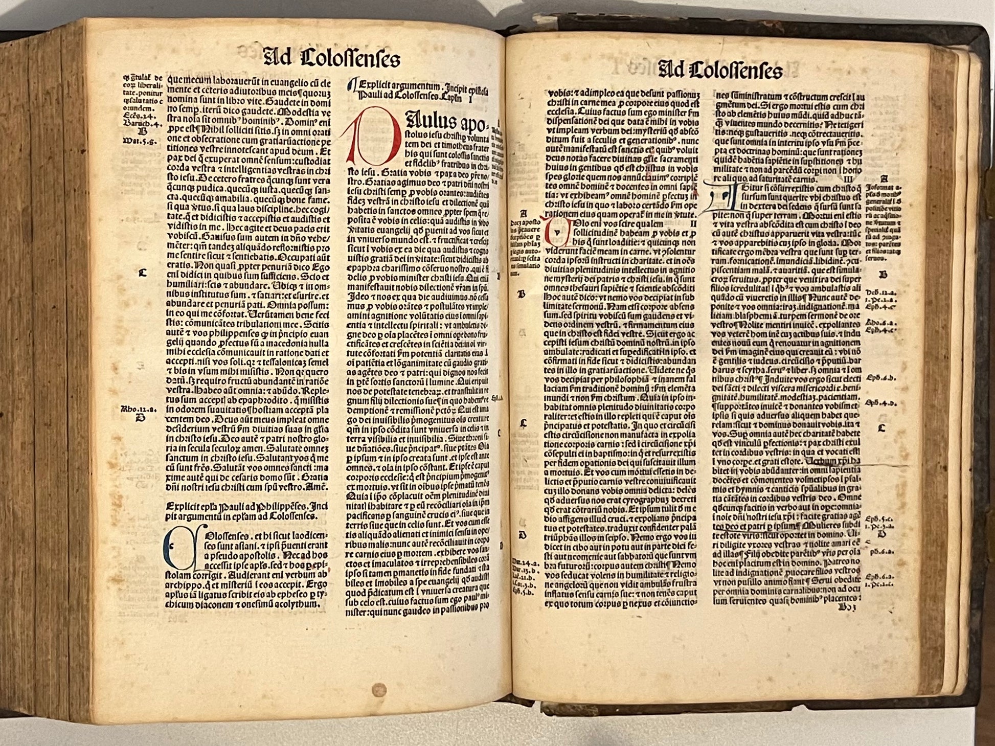 Generally clean throughout the text, light spotting throughout, heavier in places, but mostly confined to marginal spaces where it occurs. Some contemporary marginalia in places. Two leaves with slightly torn corners (L5, Daniel, and 2B6, 2 Timothy), without any text loss. B2-( X? ) with a burn hole in the right outer margin decreasing in size from B2 onwards, starting at approx 11x1.5cm and decreasing to around 4x1.5cm, causing some minor text loss in Wisdom/Ecclesiasticus. Preliminary blank reinforced in gutter, presumably when the facsimile title was tipped in. Very extensive manuscript handwriting to front pastedown, largely illegible, but written in German, probably circa the early 16th century, perhaps slightly earlier, and so likely of Humanist ownership. Some very neat and small marginalia throughout in various hands, at least three of which appear to be contemporary, probably indicating early institutional ownership at a monastery or similar. The rubricator has also underlined certain passages. We seemingly have two rubricators at work here, one who did the initials, and another who has done some of this underlining and rubrication of smaller capitals in places, again pointing to monasterial or early university ownership.
