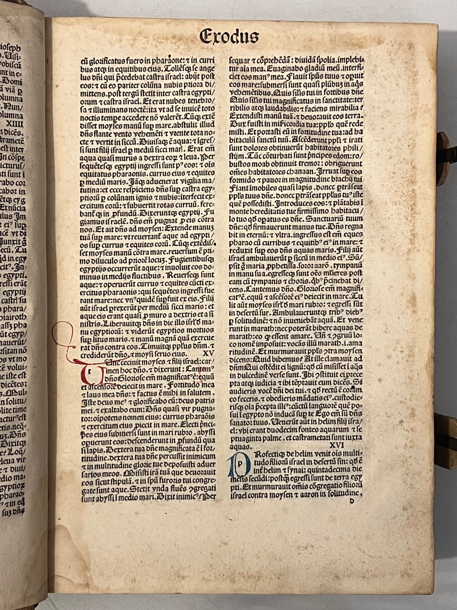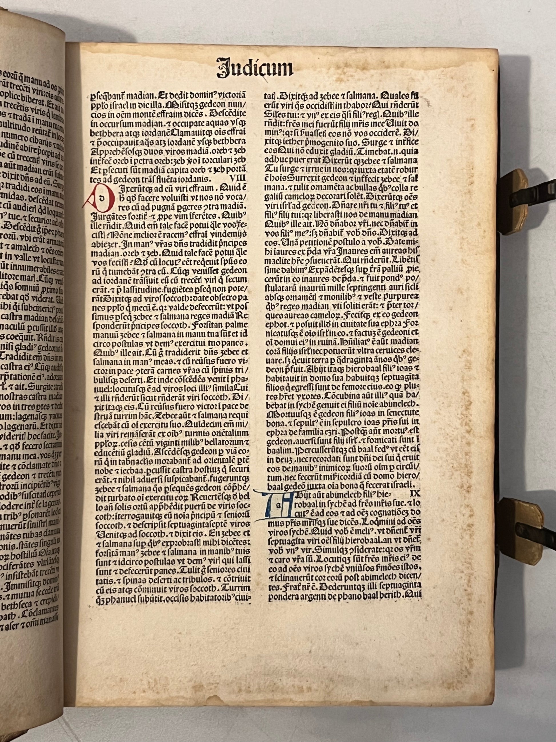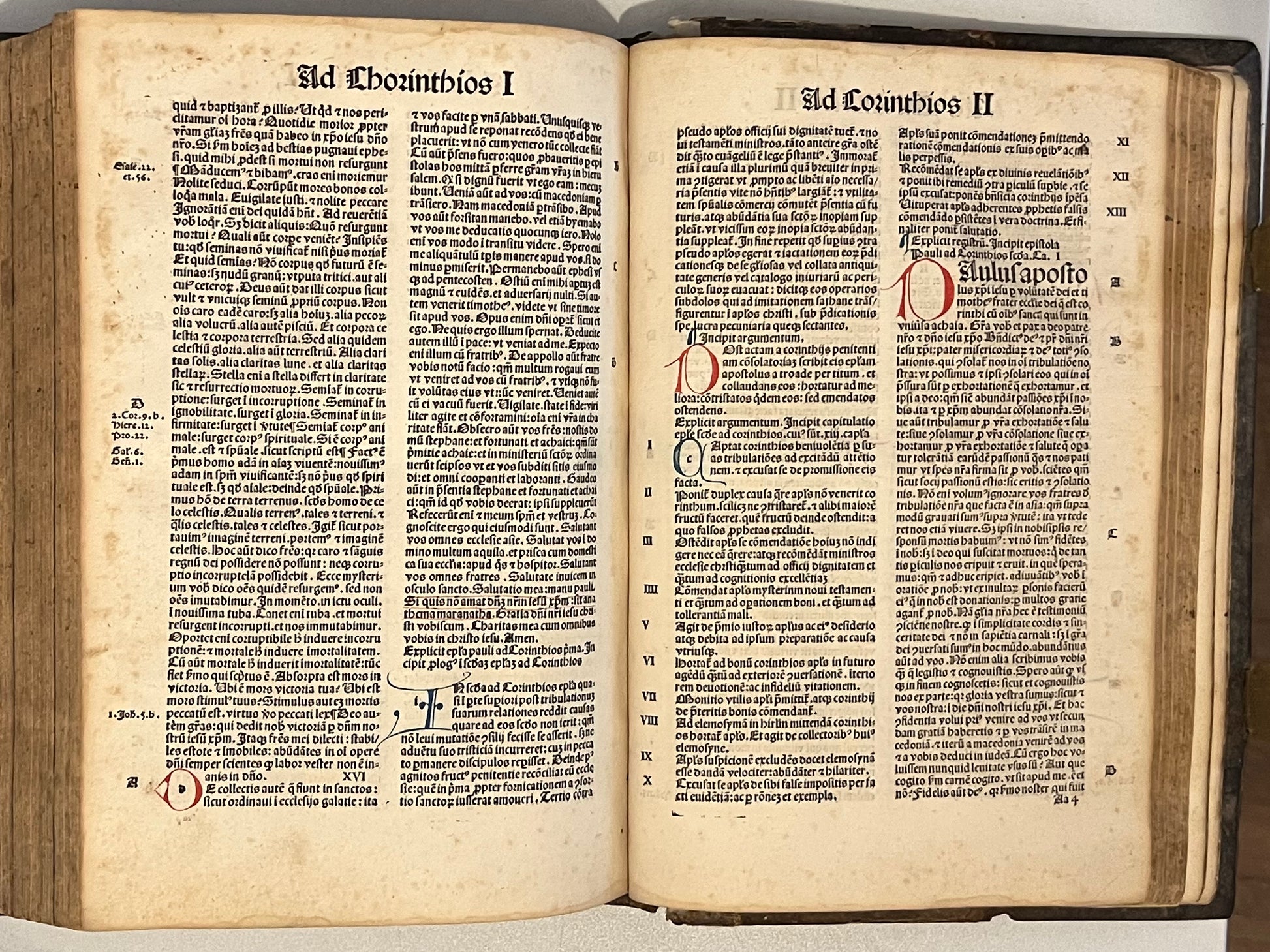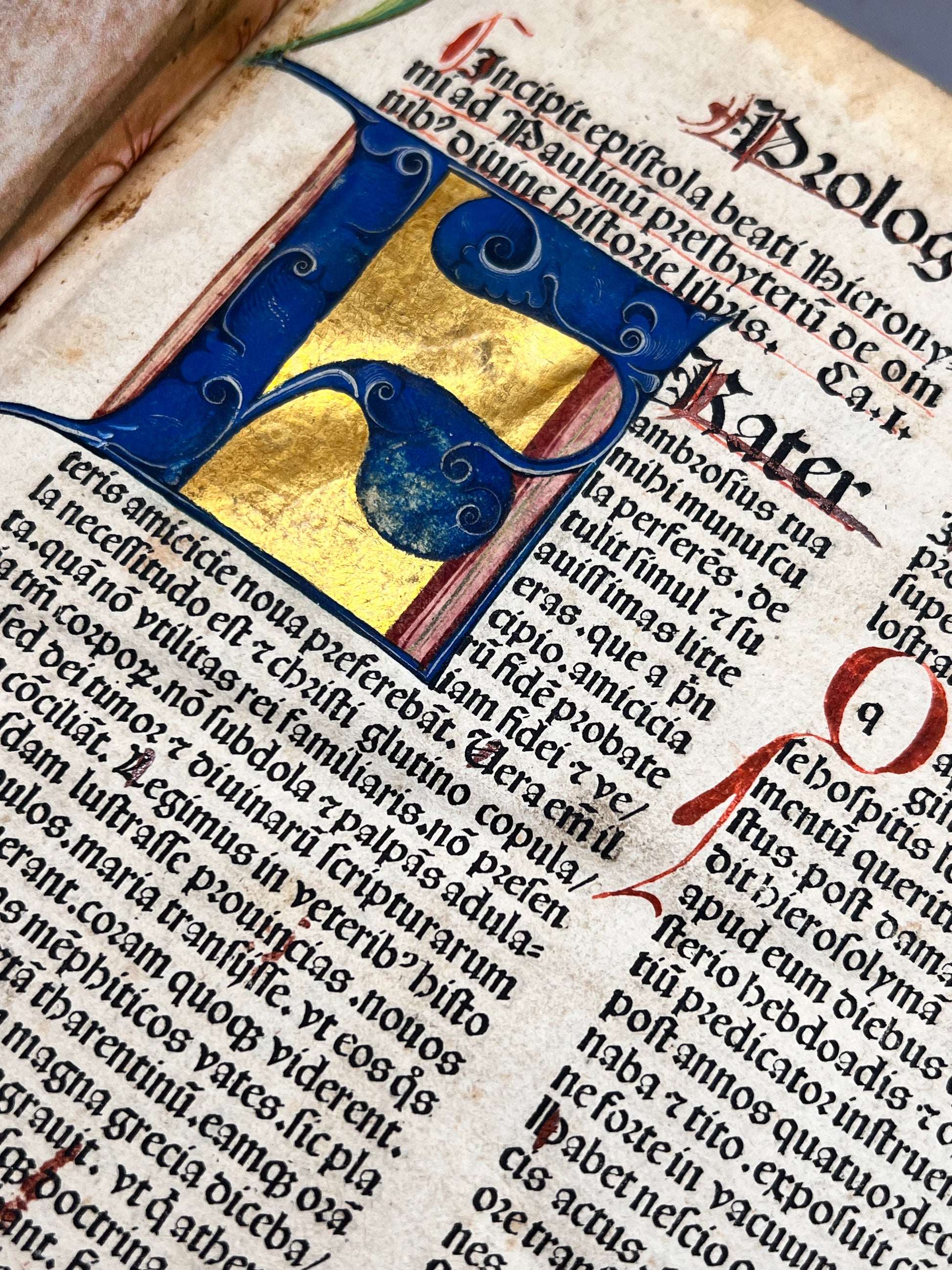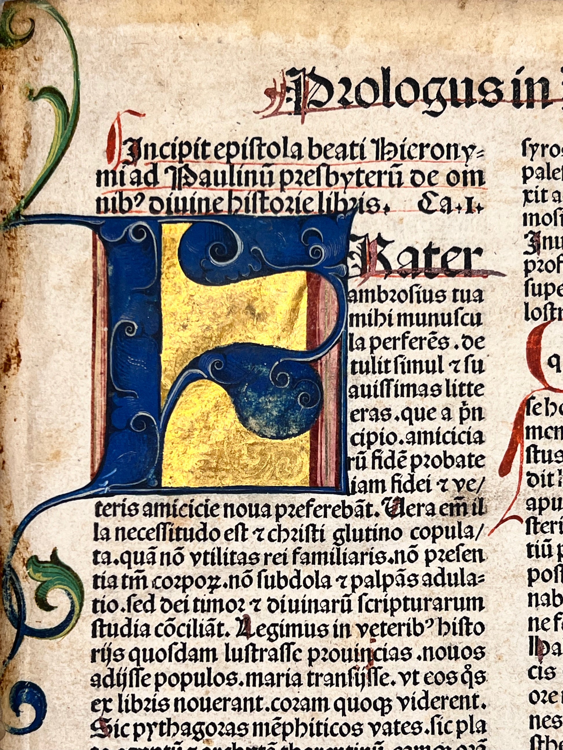We can also see with this Bible the inheritance of the manuscript tradition of Bible production from the previous few centuries of illuminated manuscripts. This is a practice which sadly died out not too long after the incunable period, and illuminated incunabula are becoming increasingly scarce on the market, this being a truly excellent example with many beautifully rubricated capitals alternating between red and blue throughout, with a beautiful entrance initial illuminated in gold and painted.