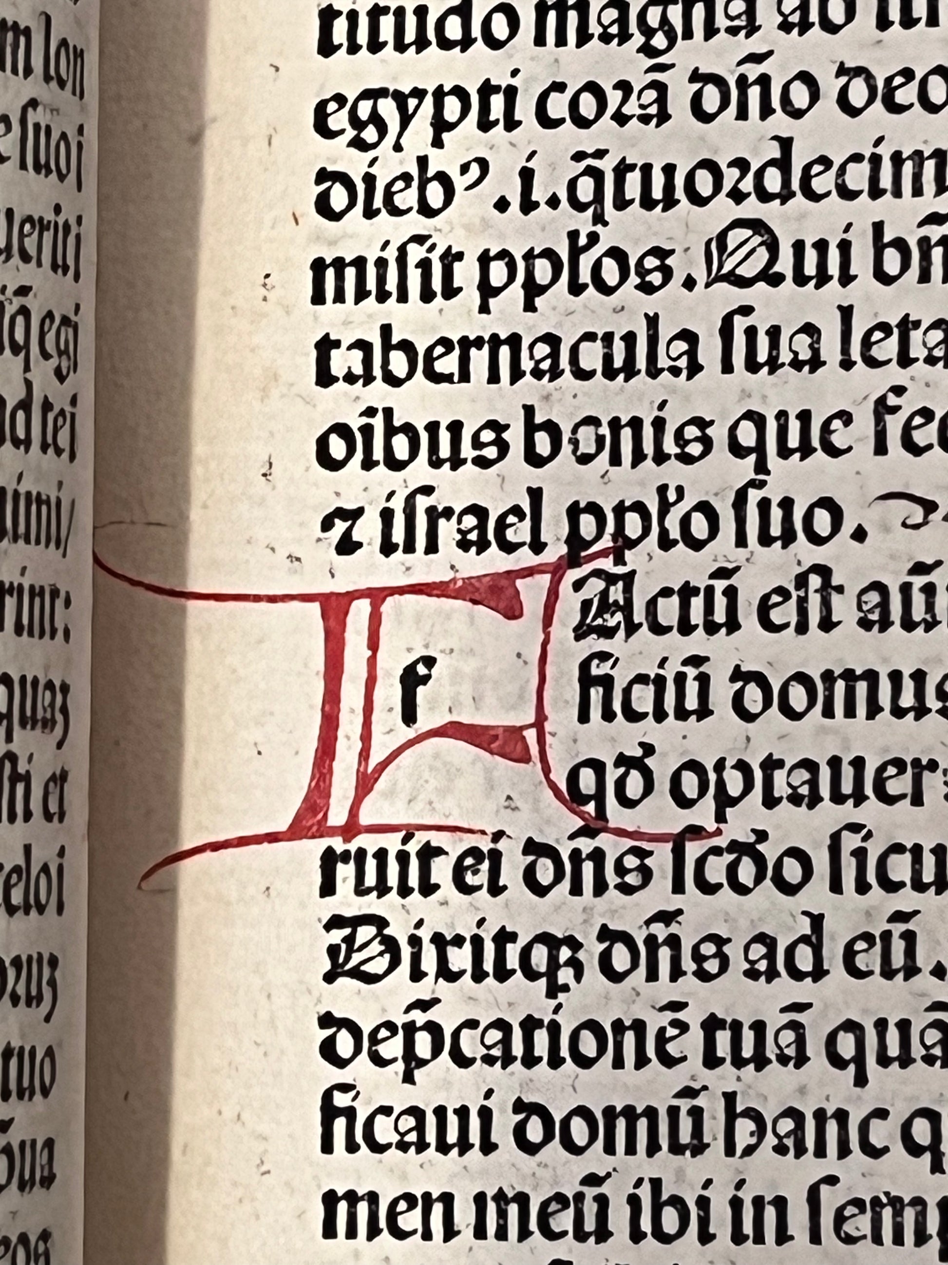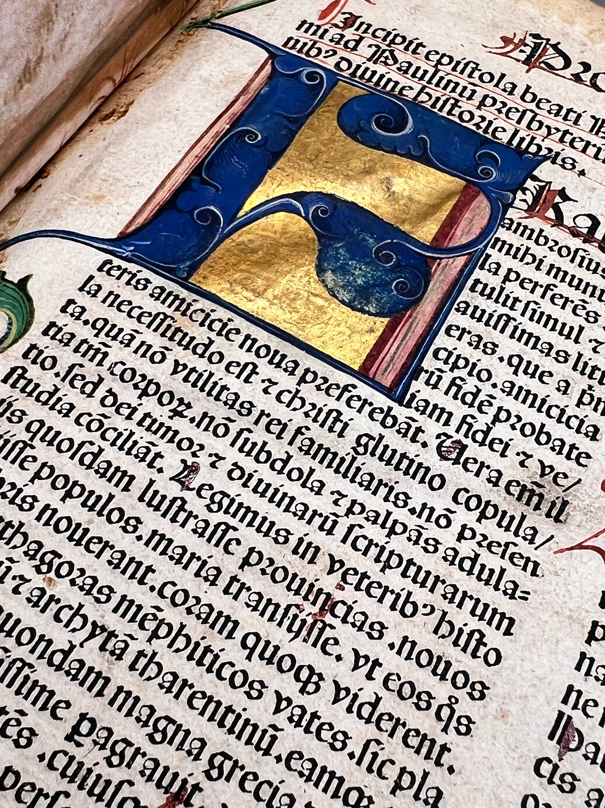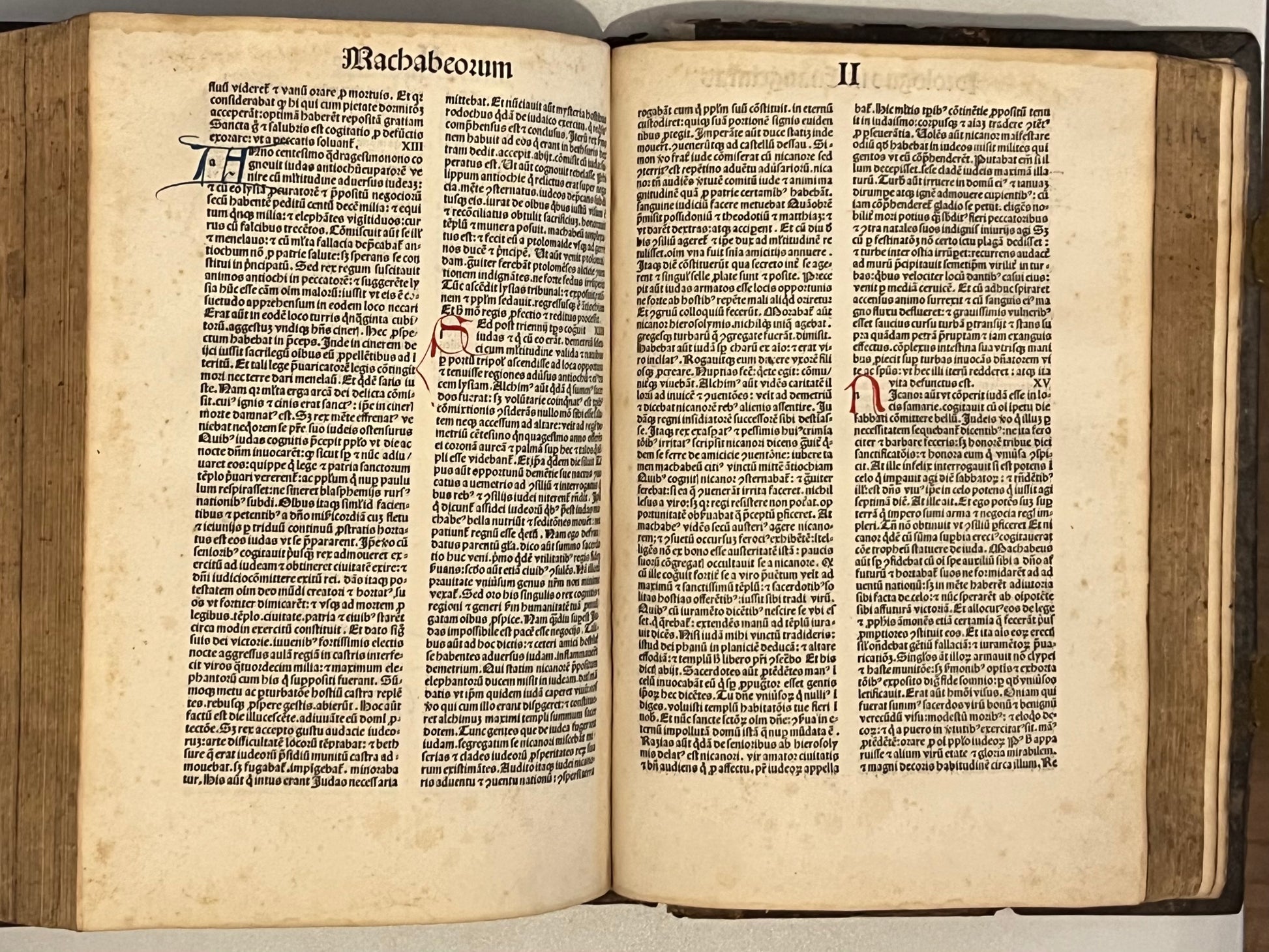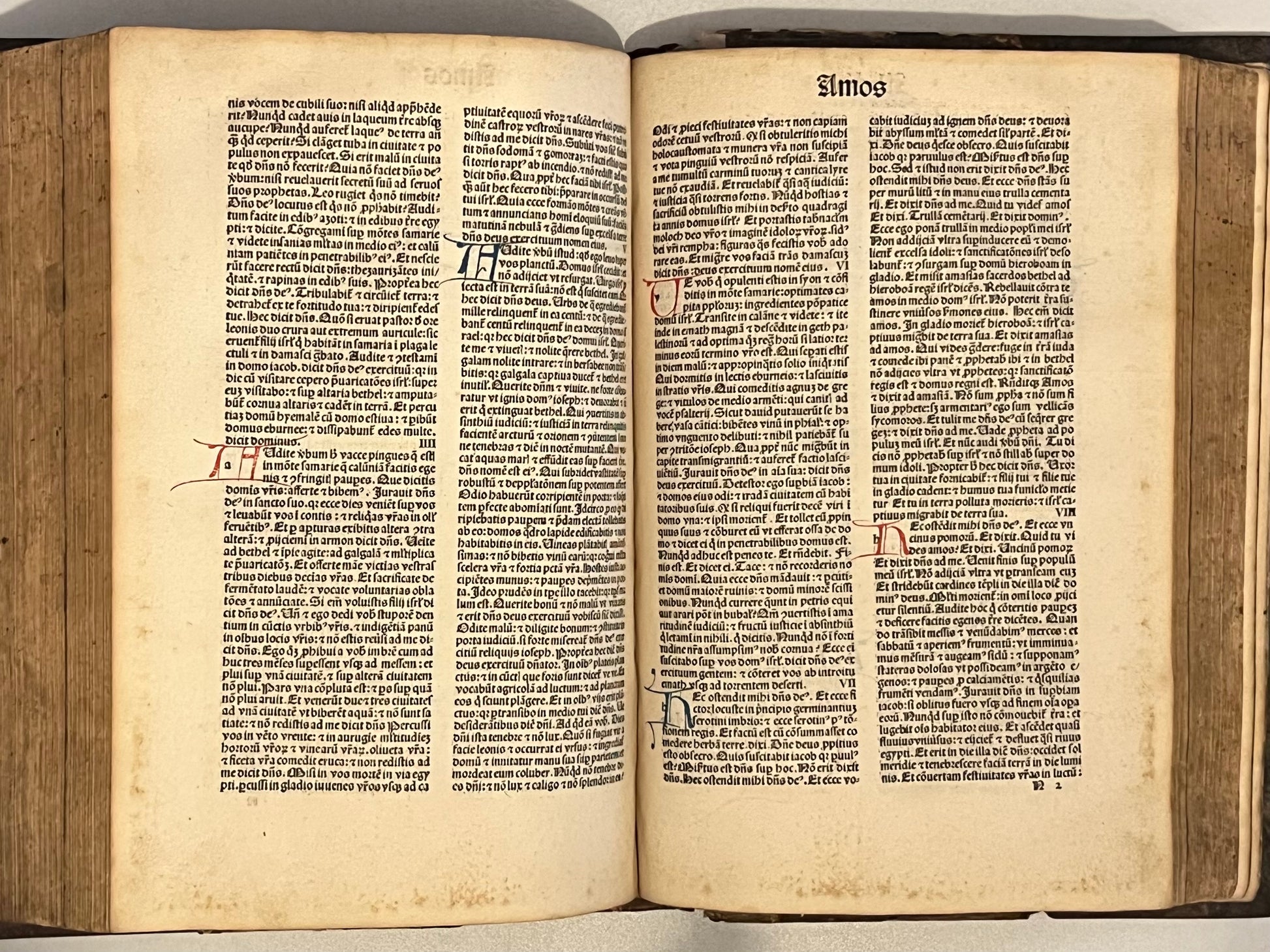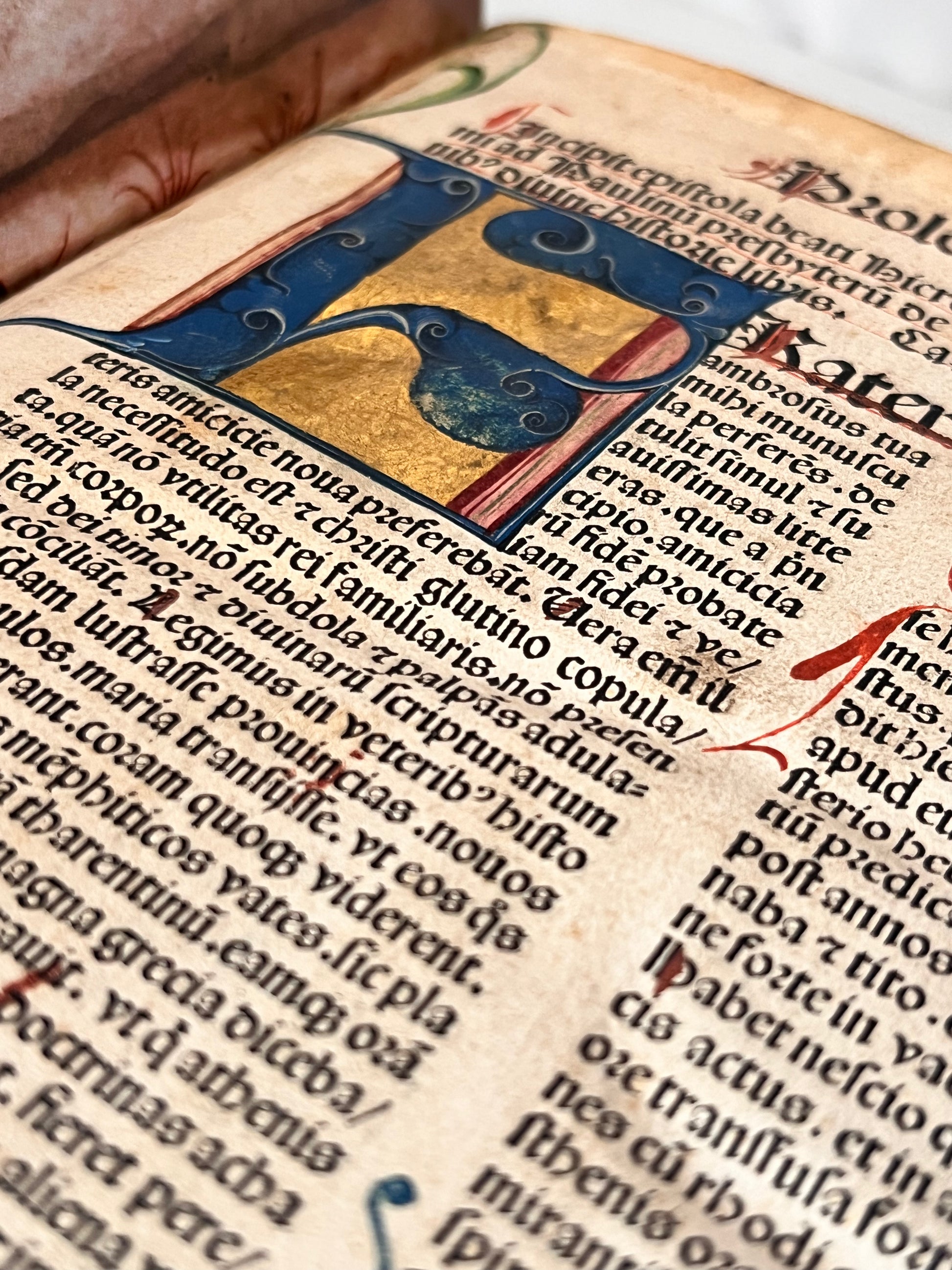 We can also see with this Bible the inheritance of the manuscript tradition of Bible production from the previous few centuries of illuminated manuscripts. This is a practice which sadly died out not too long after the incunable period, and illuminated incunabula are becoming increasingly scarce on the market, this being a truly excellent example with many beautifully rubricated capitals alternating between red and blue throughout, with a beautiful entrance initial illuminated in gold and painted.